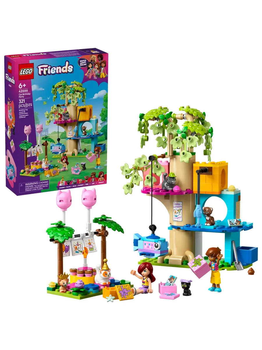 Эта забавная игрушка поможет организовать вечеринку по случаю дня рождения Чурро. Здесь также присутствуют четверо кошачьих друзей Чурро, а также персонажи LEGO Friends Лео и Пейсли. Рассмотрите забавные детали, в том числе подарки на день рождения, баннеры и воздушные шары в форме кошек. Детям понравится водить питомцев по домику на дереве, где есть пиньята в форме рыбы, игрушка для кошек, кошачья трава, фонтанчик и лоток. Затем котам пора сесть за вращающийся стол и насладиться праздничным тортом Чурро. С этим игровым набором для животных можно придумать множество игр, и каждый раз дети смогут рассказывать новую историю о дружбе.