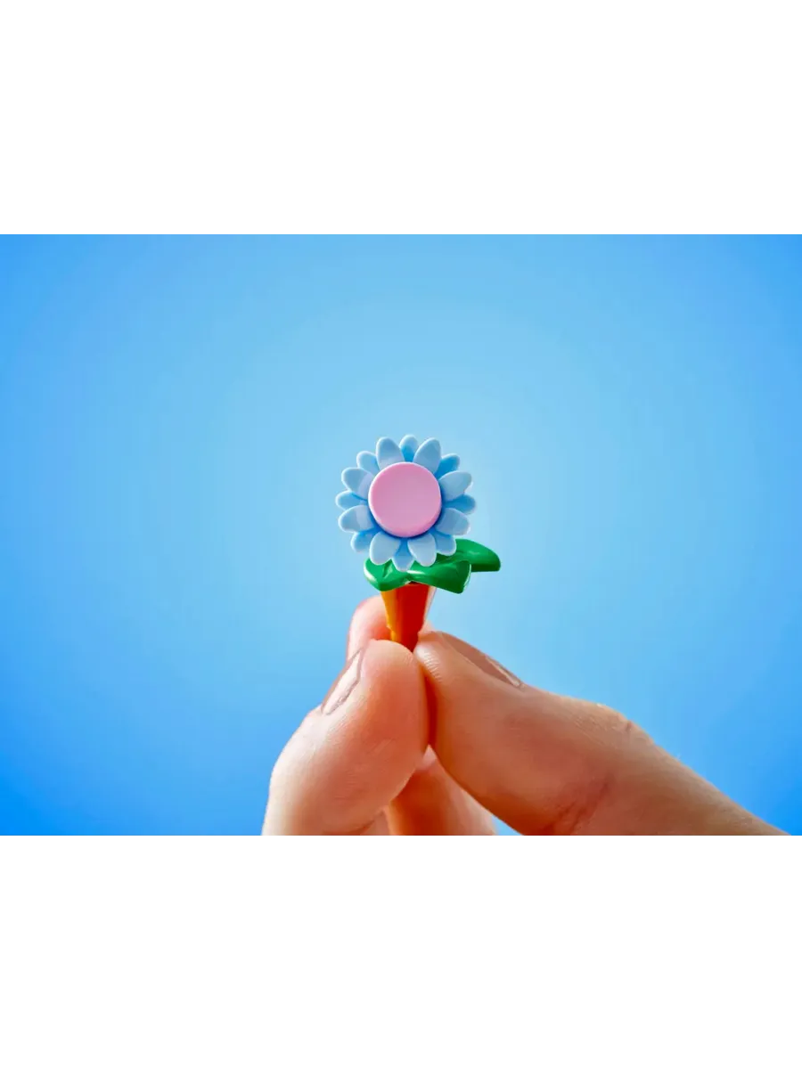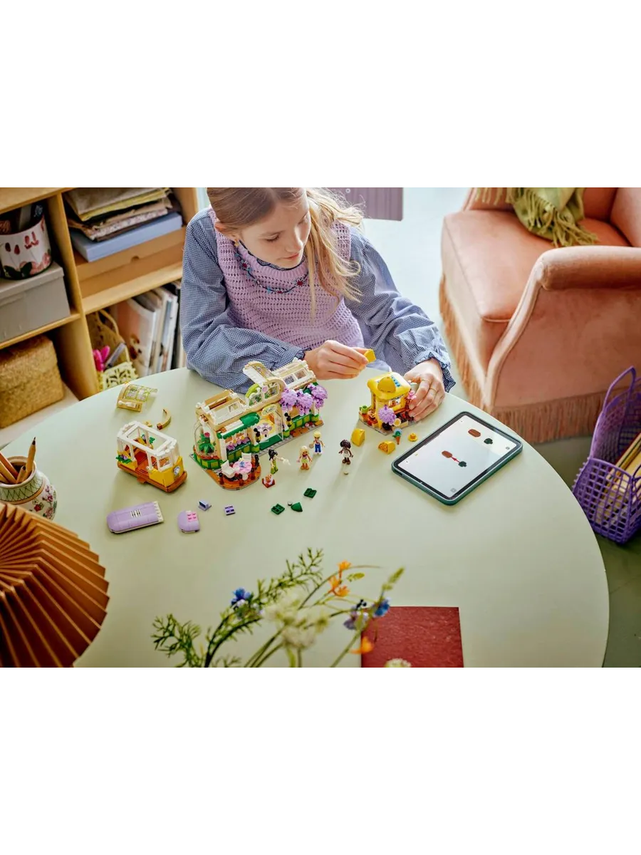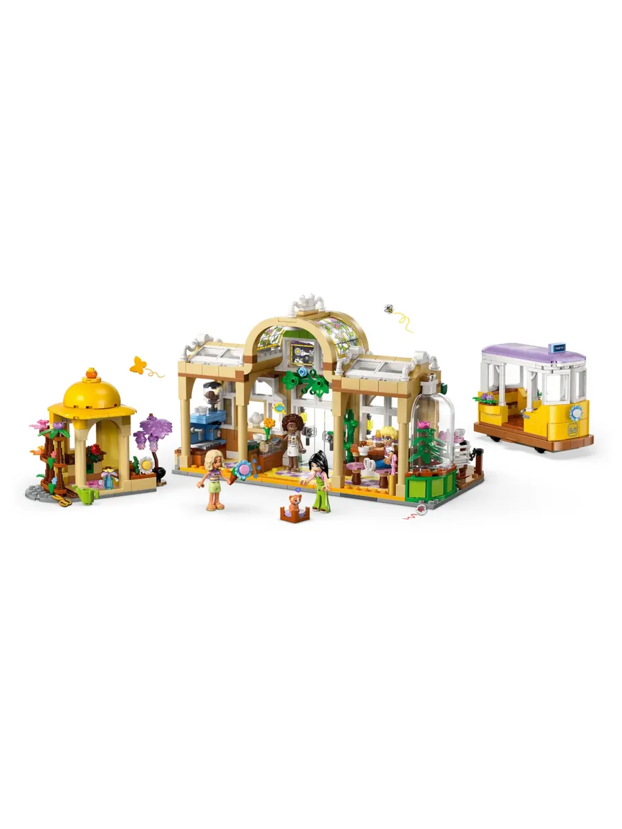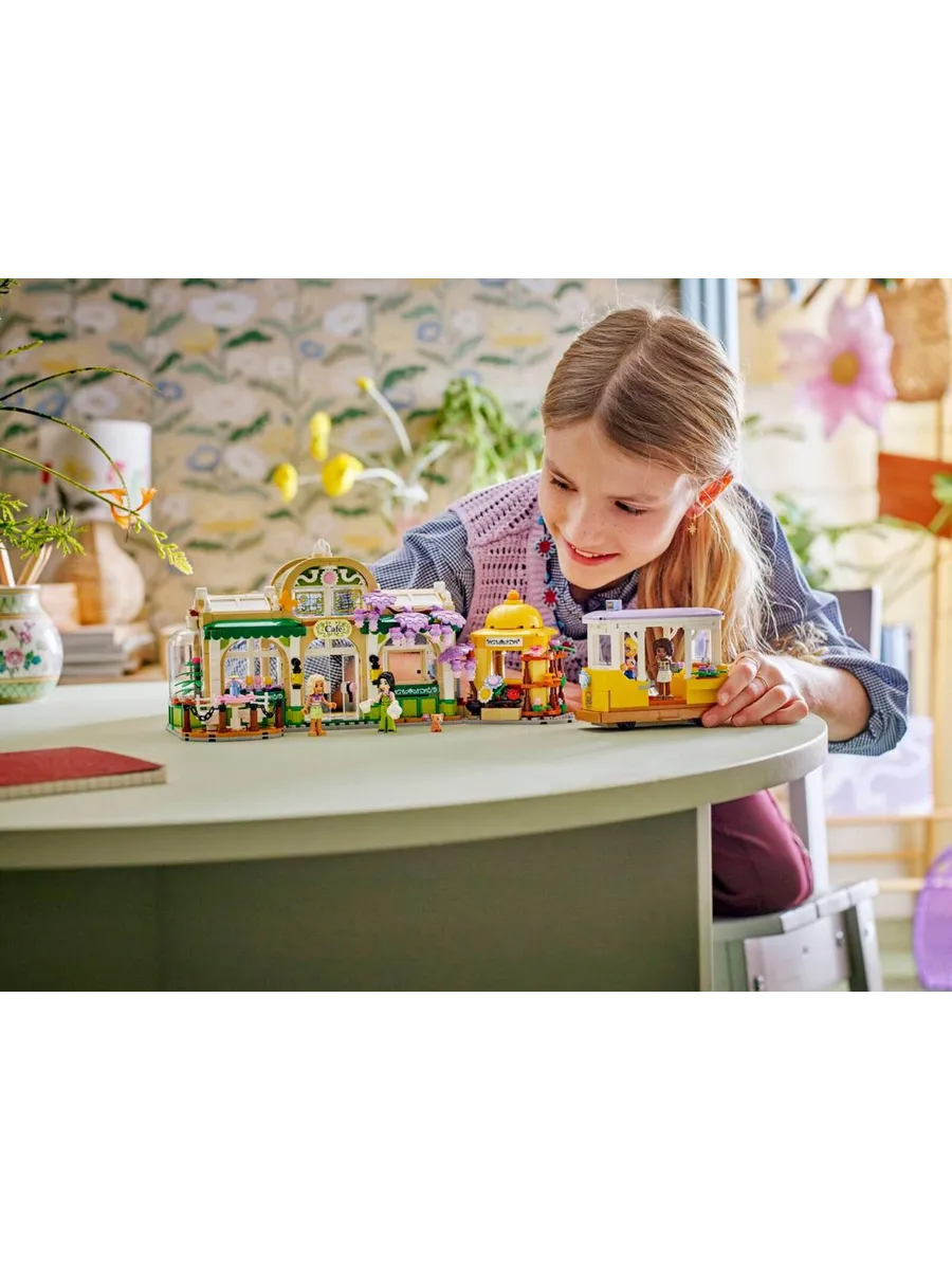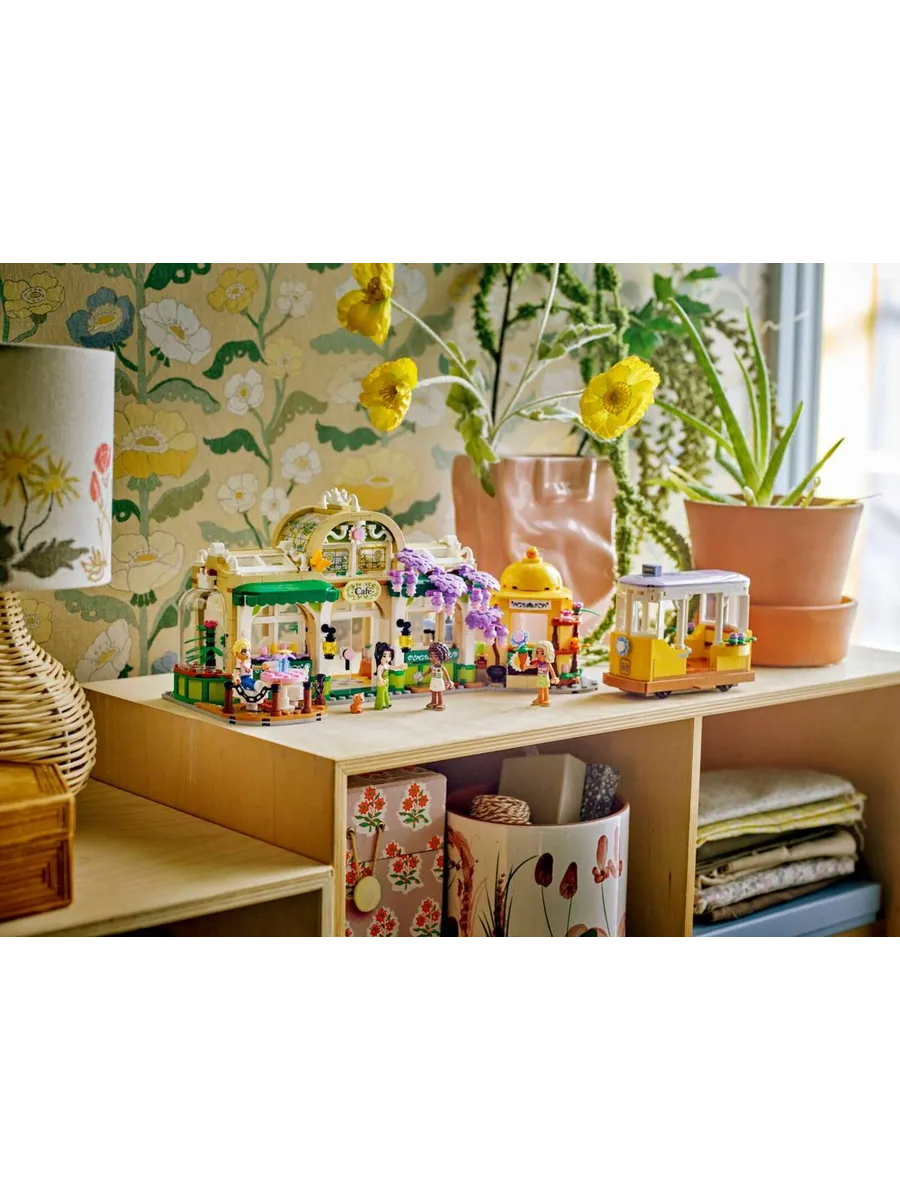 В этом наборе вы найдёте множество цветов и растений, а также узнаете историю Алии, Олли, Новы, Эсмы и кота Наггета, которые любят проводить время в цветочном магазине и кафе. В наборе есть множество деталей, которые вдохновят вас на создание собственных историй. Персонажи могут прокатиться на милой игрушечной трамвайной остановке, а также посетить кафе с зоной отдыха на открытом воздухе и кухней с кофемашиной. Ознакомьтесь с деталями, включая кофеварку, стол, выпечку, напитки, табуретки, букеты, растения в горшках, ножницы, лейку и многое другое. Кроме того, здесь есть цветочный киоск с букетами и растениями в горшках на продажу. Поиграв с набором, дети могут поставить модель на полку или стол, чтобы каждый день любоваться красивыми цветочными композициями.