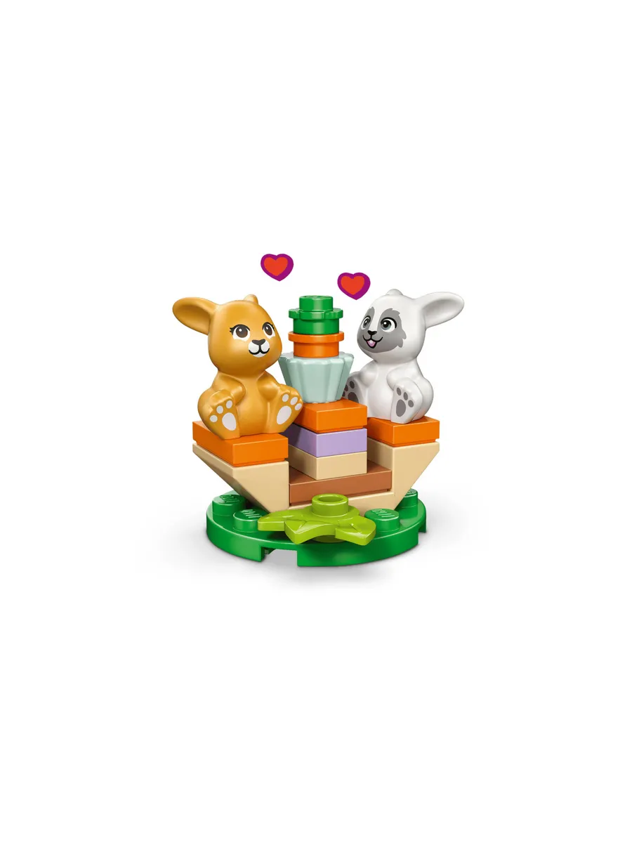 Две мини-фигурки и два кролика в этом наборе позволяют детям ухаживать за животными. Множество интересных деталей, таких как специальная дверца для кроликов и симпатичная табличка с кроликом, вдохновляют на творческую игру. Внутри отеля есть коврик в форме морковки, спальная зона с кроличьими лежанками и список для регистрации кроликов. Снаружи есть зона отдыха, где кролики могут собраться и полакомиться морковным кексом.