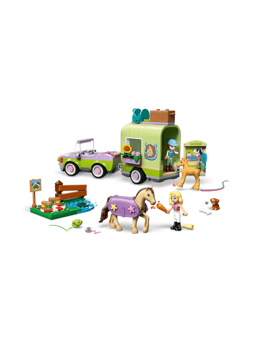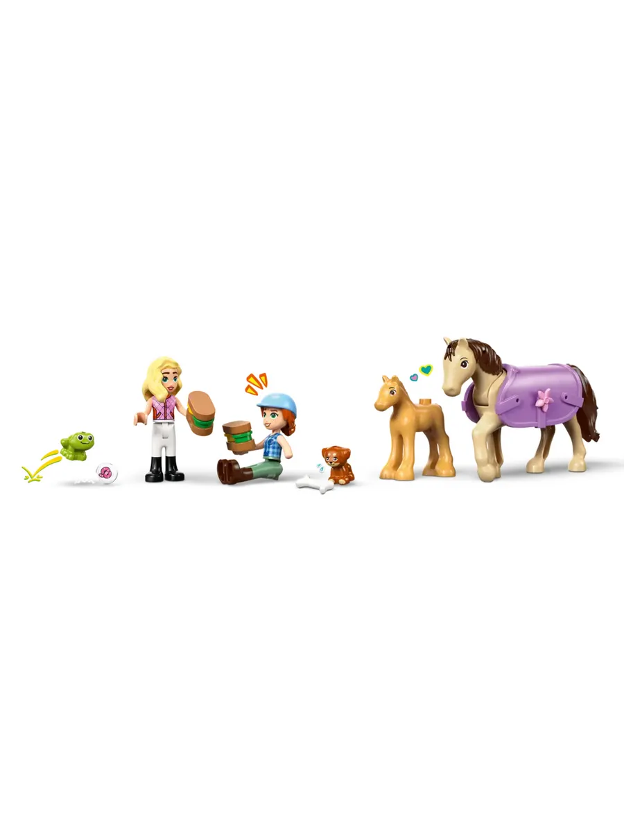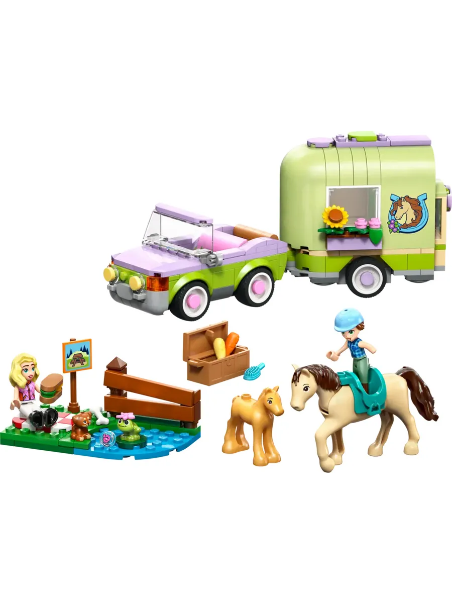 Пусть дети от 7 лет и старше часами играют в ролевые игры по уходу за животными с игрушкой LEGO Friends Horse & Baby Foal Trailer (42695). В этот набор для любителей лошадей входят 2 мини-куклы, а также фигурки лошади, жеребенка, щенка и лягушки. Изучите все аспекты ухода за животными, используя подробные аксессуары для ухода за лошадьми, транспортировки их в трейлере и катания на лошади через трамплин. С этим набором для игр с животными девочки и мальчики могут играть по-разному. Они могут сочинять истории для Отэм и Матильды, пока те ведут машину. Откройте трейлер, чтобы поприветствовать лошадь и жеребенка. Затем оседлайте лошадь и приготовьтесь к поездке. К модели прилагается небольшая боковая часть с местом для пикника, указателем, озером и забором, через который можно перепрыгнуть. Этот набор станет отличным подарком для любителей лошадей или веселым подарком на день рождения для детей, которые любят игровые наборы с животными. В этот набор LEGO Friends входят ограждение для прыжков, седло, бутерброды, корзина, щетка, морковка для лошадей и 2 маленьких цветочка для украшения попоны.