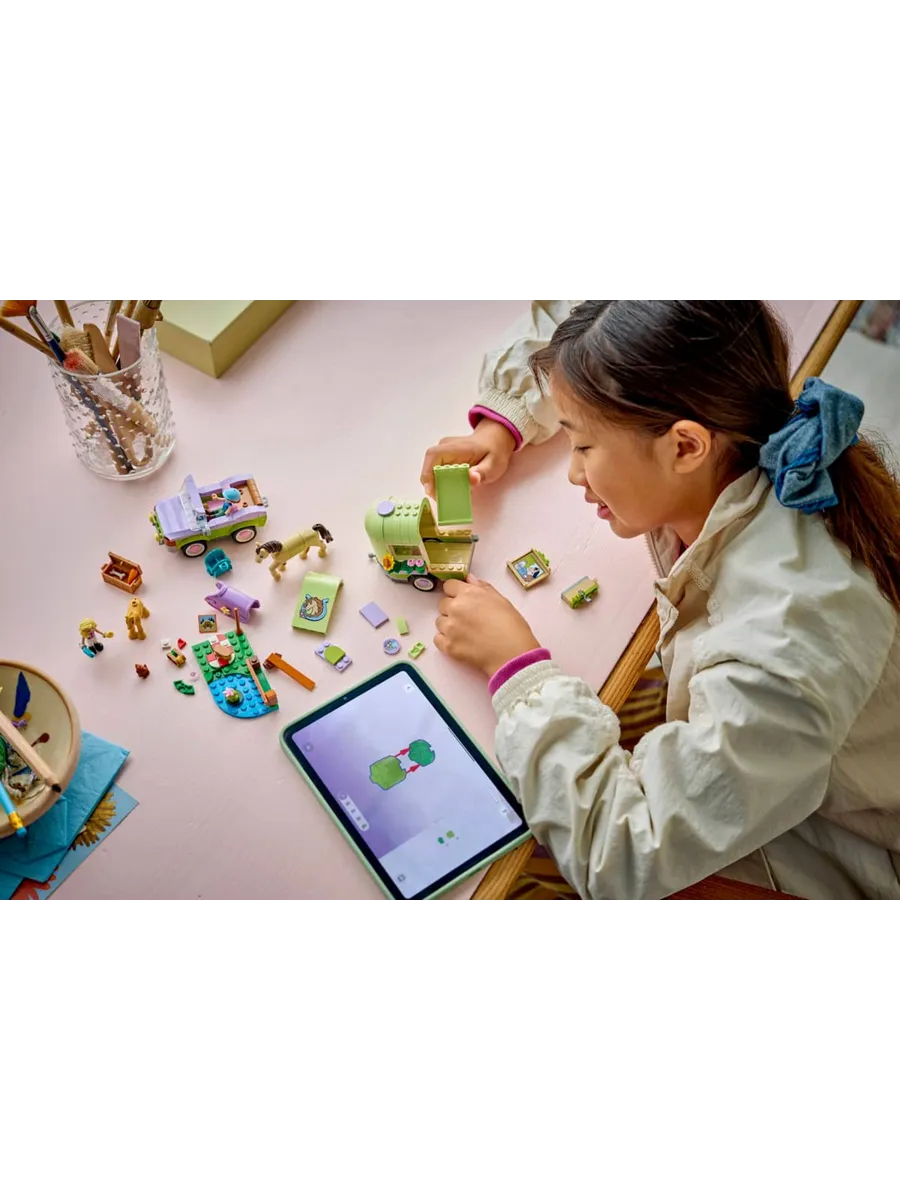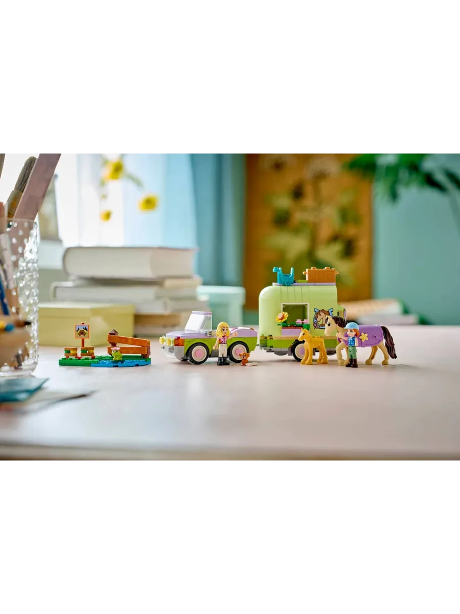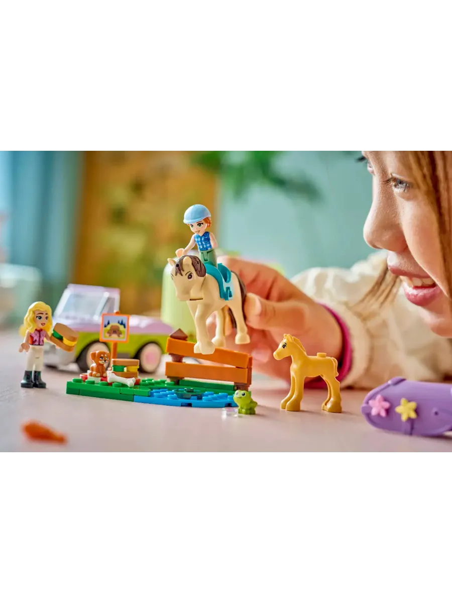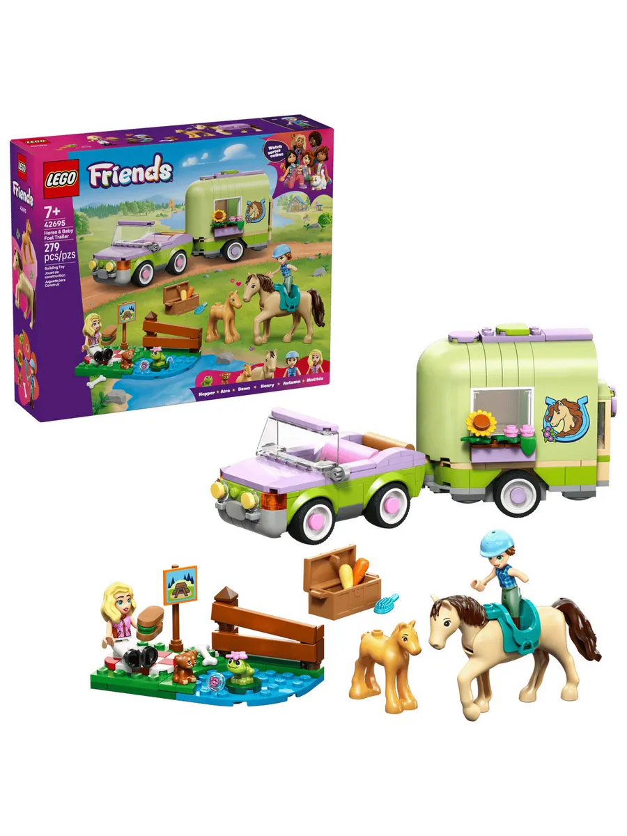Пусть дети от 7 лет и старше часами играют в ролевые игры по уходу за животными с игрушкой LEGO Friends Horse & Baby Foal Trailer (42695). В этот набор для любителей лошадей входят 2 мини-куклы, а также фигурки лошади, жеребенка, щенка и лягушки. Изучите все аспекты ухода за животными, используя подробные аксессуары для ухода за лошадьми, транспортировки их в трейлере и катания на лошади через трамплин. С этим набором для игр с животными девочки и мальчики могут играть по-разному. Они могут сочинять истории для Отэм и Матильды, пока те ведут машину. Откройте трейлер, чтобы поприветствовать лошадь и жеребенка. Затем оседлайте лошадь и приготовьтесь к поездке. К модели прилагается небольшая боковая часть с местом для пикника, указателем, озером и забором, через который можно перепрыгнуть. Этот набор станет отличным подарком для любителей лошадей или веселым подарком на день рождения для детей, которые любят игровые наборы с животными. В этот набор LEGO Friends входят ограждение для прыжков, седло, бутерброды, корзина, щетка, морковка для лошадей и 2 маленьких цветочка для украшения попоны.