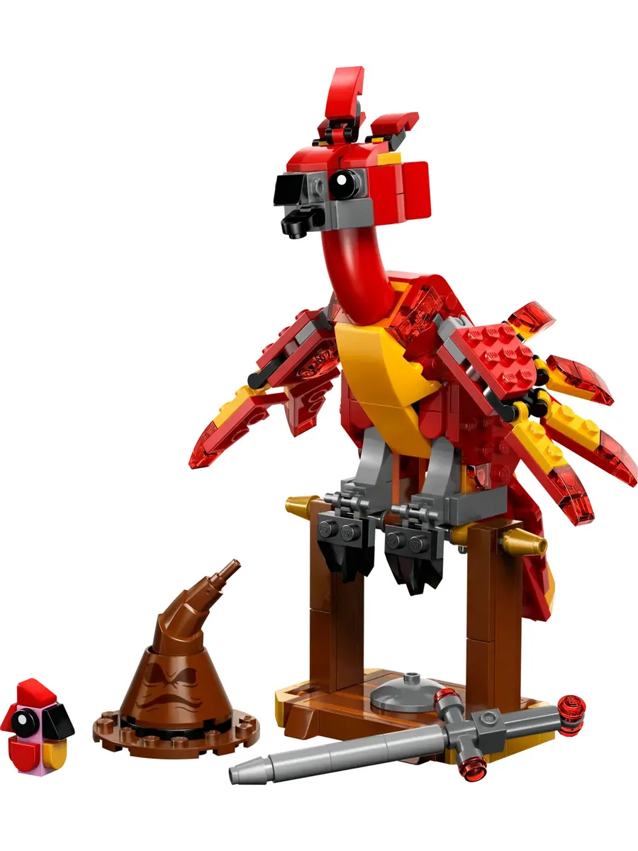 Знаменитые аксессуары — этот игровой набор для сборки и демонстрации включает в себя собранную из кирпичиков Распределяющую шляпу и Меч Гриффиндора, которые Фоукс может держать в своих когтях, а также фигурку маленького Фоукса.