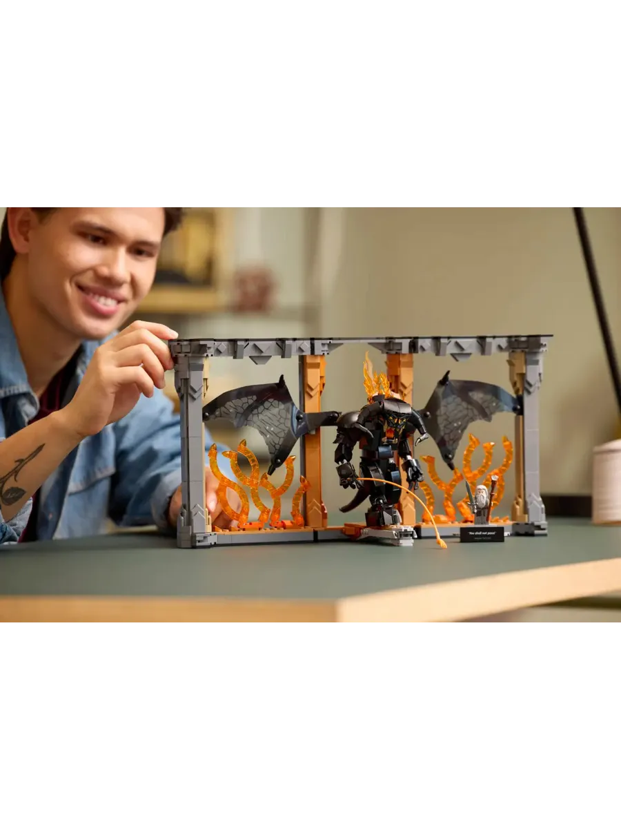 Особенности и функции. Откройте книжный раздел, чтобы увидеть изображение битвы на Мосту Кхазад-Дума, и установите съёмную мини-фигурку Гэндальфа Серого и фигурку Балрога для динамичной демонстрации