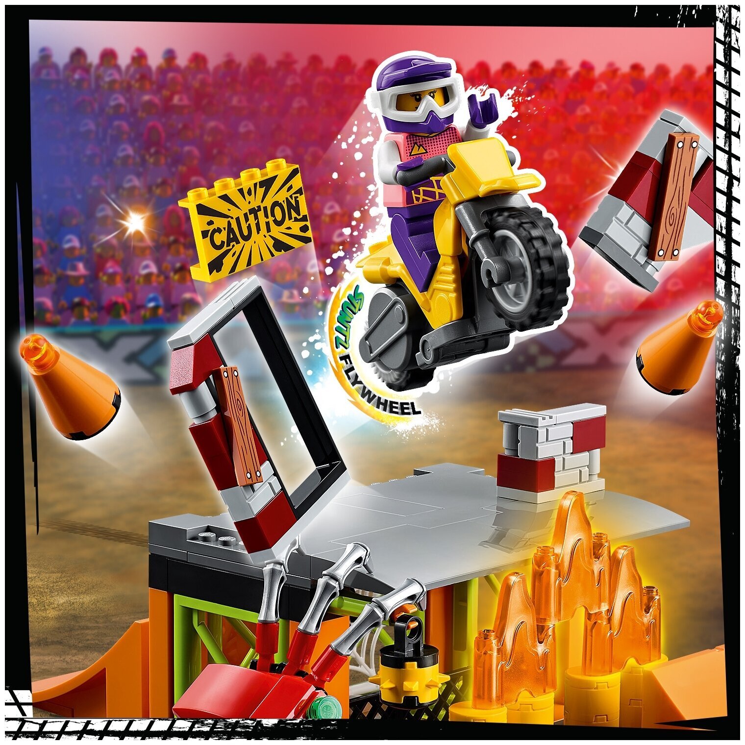 Подготовьте сцену для увлекательной наполненной действием игры с набором «Парк каскадёров» LEGO City (60293). В нём есть трюковый мотоцикл с маховиком и множество реквизита и задач для потрясающих выступлений.
