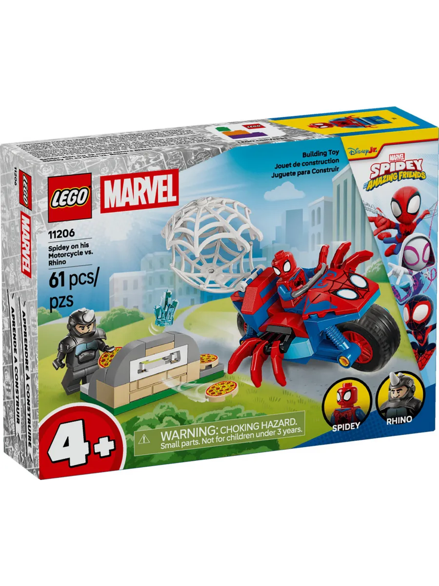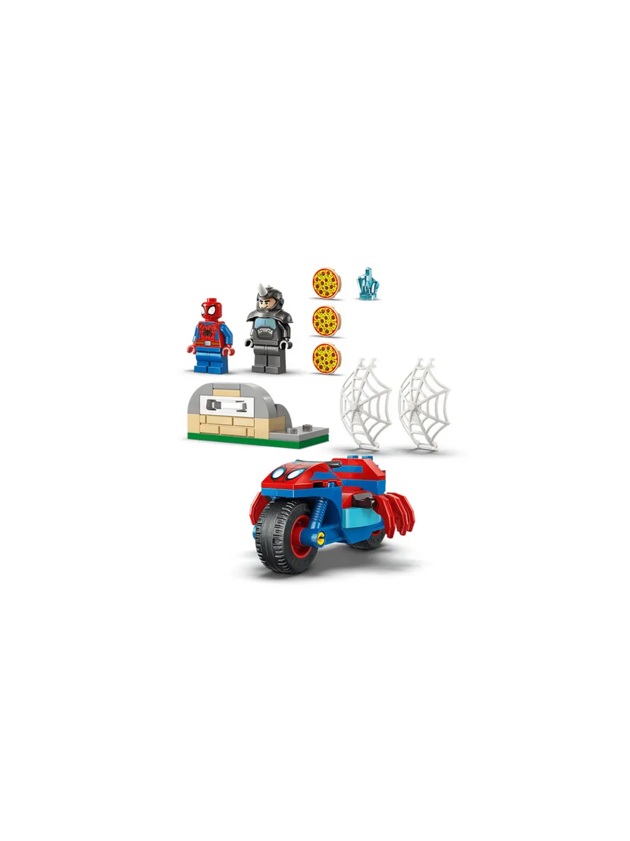 Передайте действие супергероя в руки детей с этим паучком на его мотоцикле против Игрушка-конструктор Rhino (11206) для мальчиков и девочек в возрасте от 4 лет и старше. Этот конструктор с минифигурами Паука и носорога, а также мотоциклом в форме паука - отличный способ помочь детям развить свои творческие способности. Дети помогают Спайди найти украденный синий драгоценный камень, уворачиваются от летающих пицц, выпущенных из Rhino pizza oven shooter, и ловят Носорога в гигантскую ловушку из паутины, которая также устанавливается на мотоцикл. Разработанный специально для начинающих строителей, этот конструктор наполнен множеством деталей, которые вдохновят детей на бесконечную творческую игру.