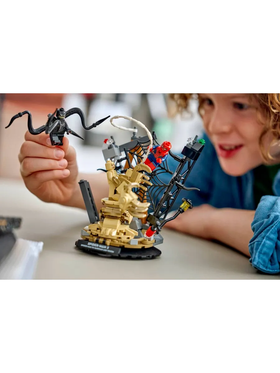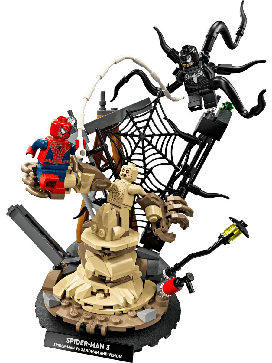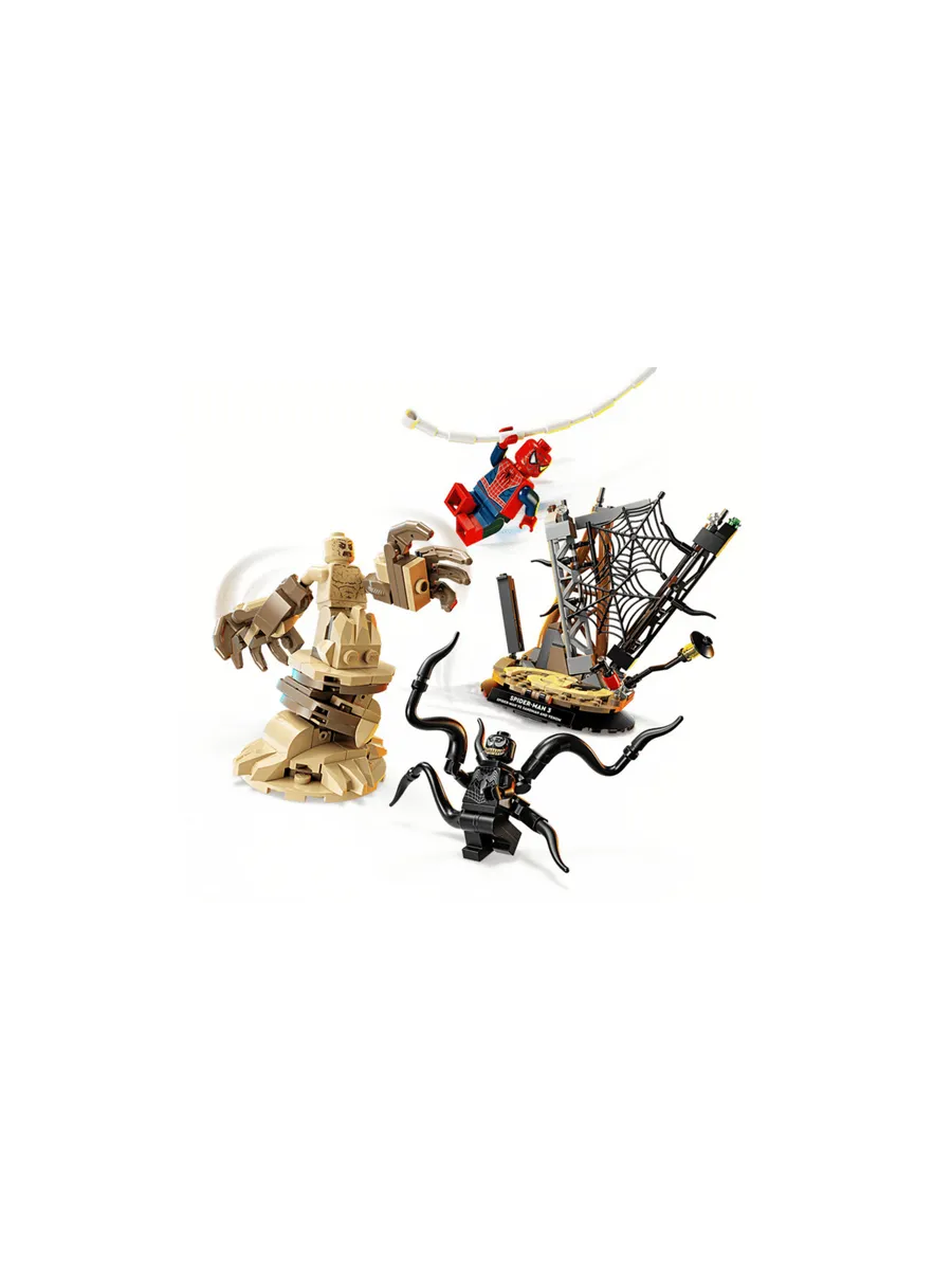 В этом конструкторе вас ждут звездные персонажи из фильма и множество интерактивных элементов: Человек-паук спускается с башни на паутине; Песочный человек выбирается из-под обломков с огромной рукой; Веном наносит удар четырьмя подвижными щупальцами.