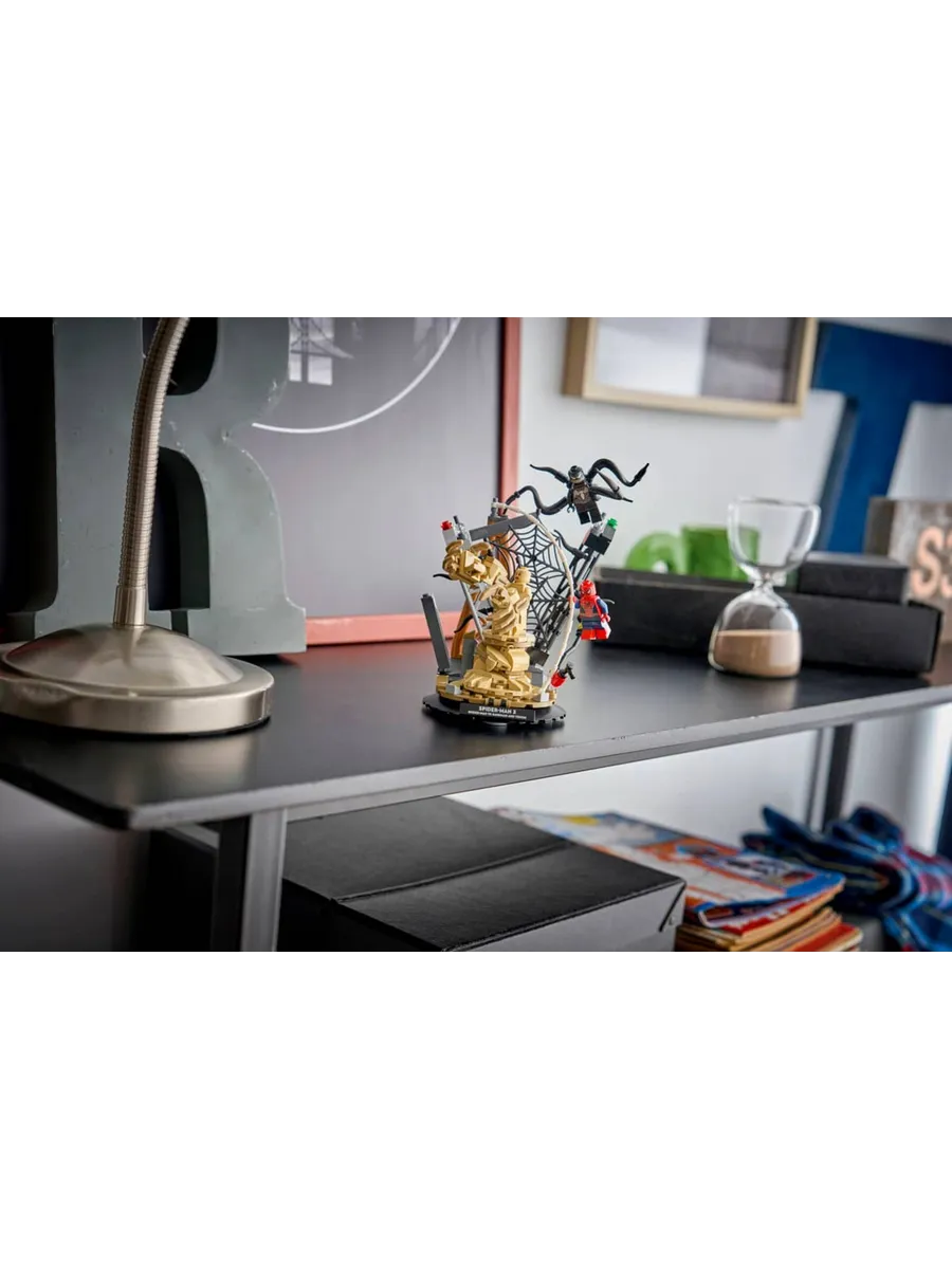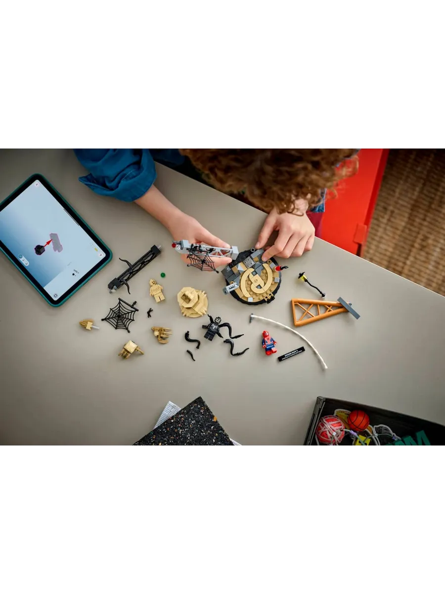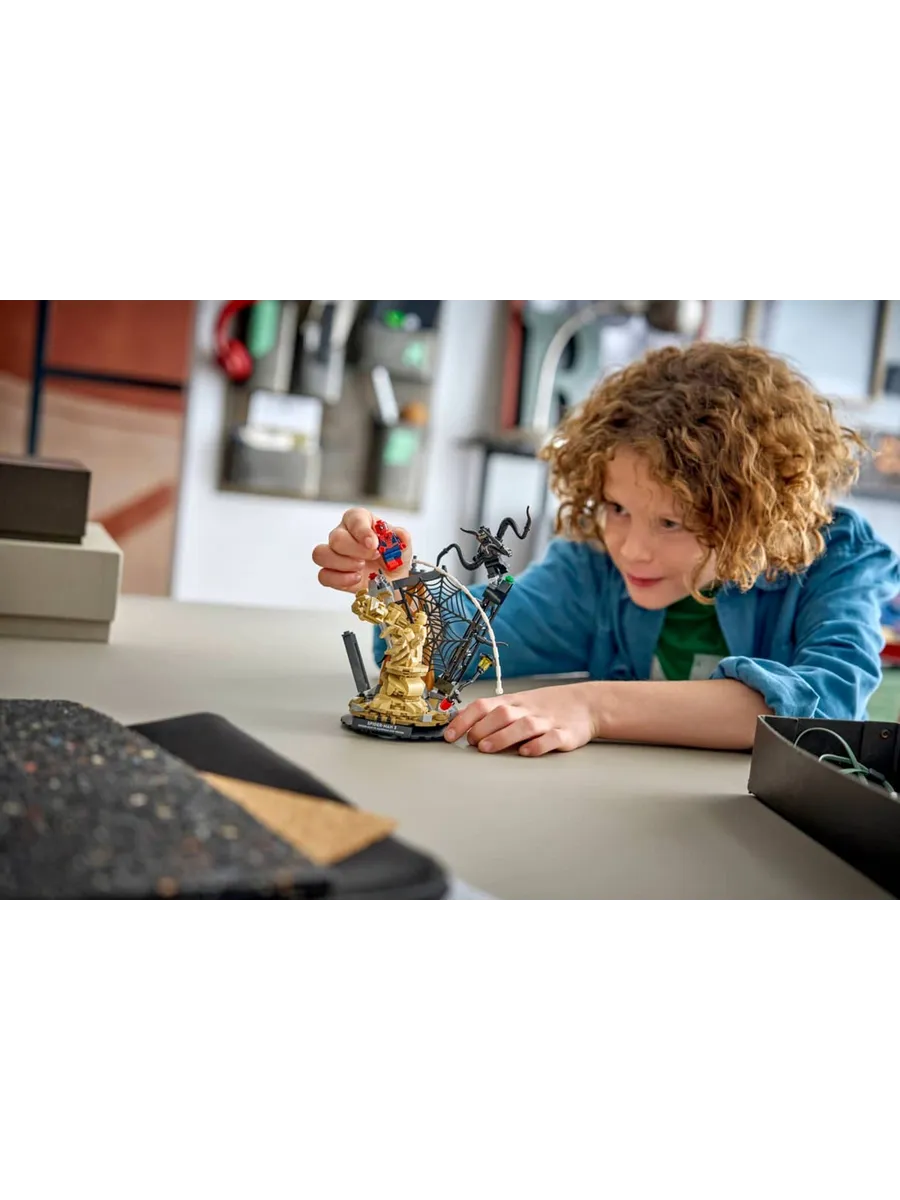 В этом конструкторе вас ждут звездные персонажи из фильма и множество интерактивных элементов: Человек-паук спускается с башни на паутине; Песочный человек выбирается из-под обломков с огромной рукой; Веном наносит удар четырьмя подвижными щупальцами.