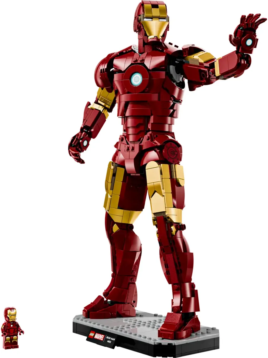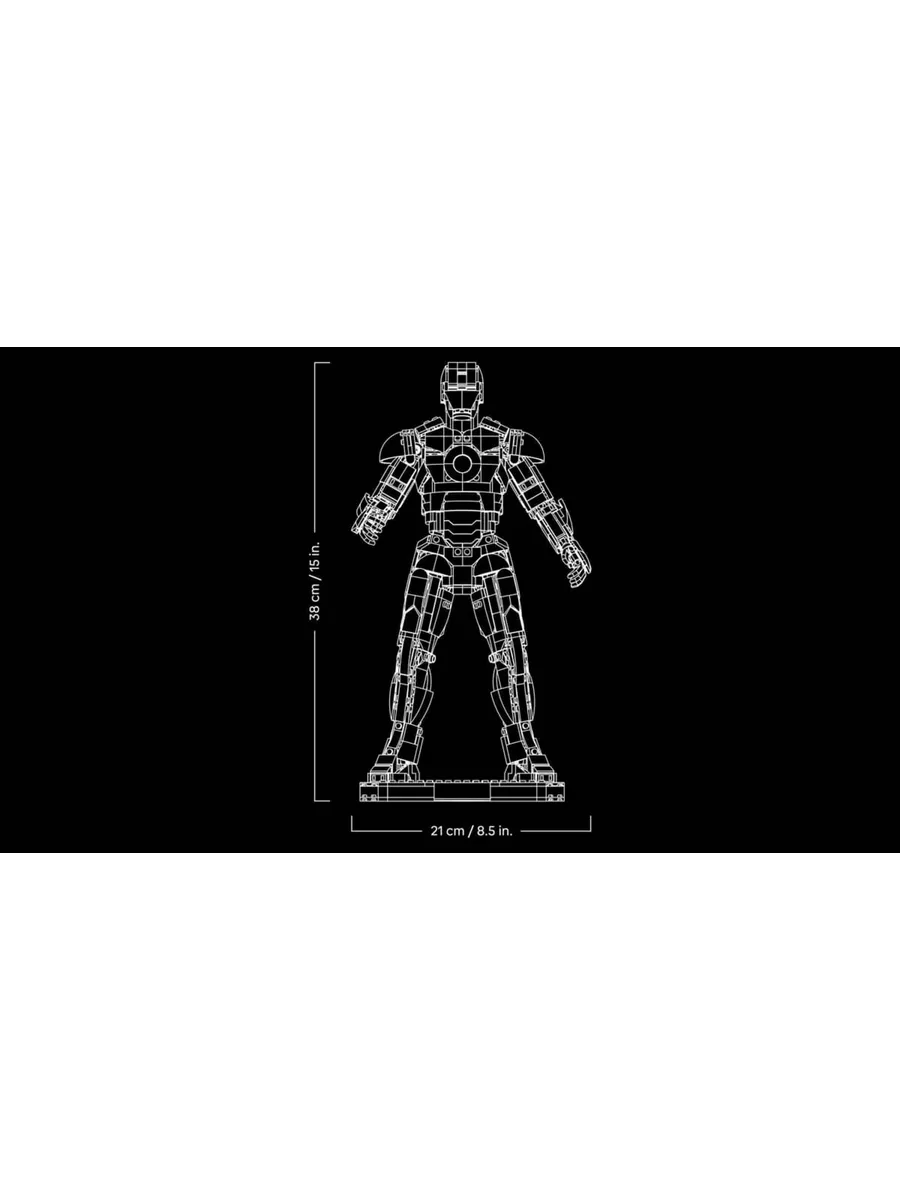 РАЗМЕРЫ — фигурка Железного человека из этого набора, состоящего из 1297 деталей, имеет высоту более 15 дюймов (38 см), ширину 8 дюймов (21 см) и глубину 4 дюйма (11 см).