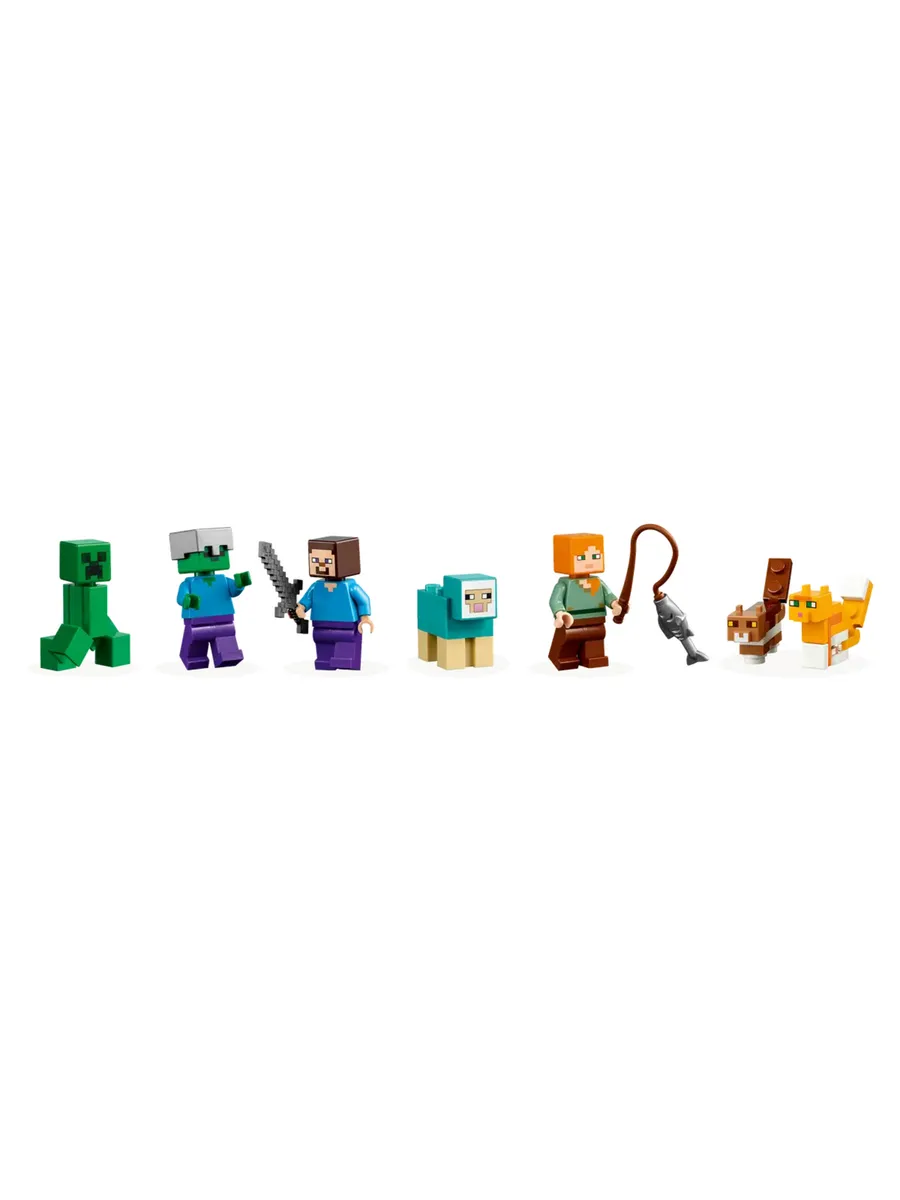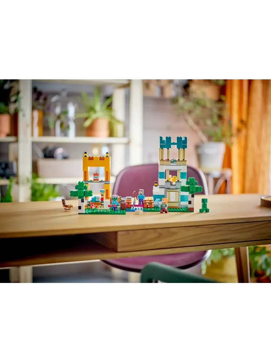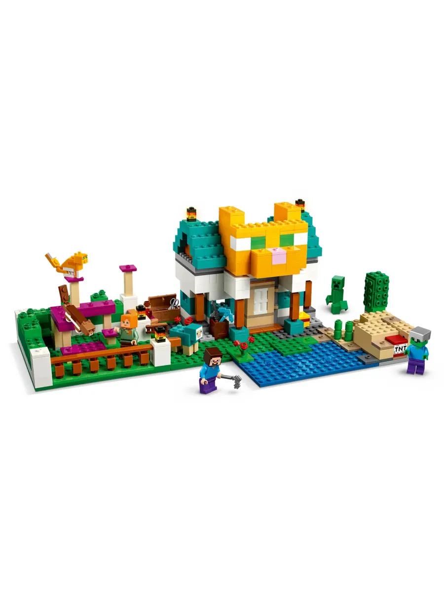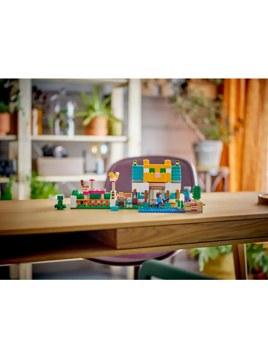 Этот невероятно универсальный игровой набор предлагает детям 2 различных сценария для строительства: «Речные башни» — строение, похожее на крепость, которое можно использовать для защиты от зомби и криперов; или «Кошачий домик», который представляет собой большой дом в форме кошки с кошачьей игровой площадкой рядом с ним. Эти уникальные сборки, а также предлагаемые модели, призванные вдохновить детей на творчество и создание бесчисленных конструкций, которые они придумывают сами, населены знаковыми персонажами и мобами из игры, включая Стива, Алекса, зомби, крипера, кошек и овец. Множество особенностей и функций Minecraft, в том числе взрывающийся динамит, придают этому эпическому набору для игр дополнительную реалистичность. Для дополнительного цифрового веселья конструкторы могут увеличивать и поворачивать наборы в 3D и отслеживать свой прогресс с помощью увлекательного и интуитивно понятного приложения LEGO Builder.