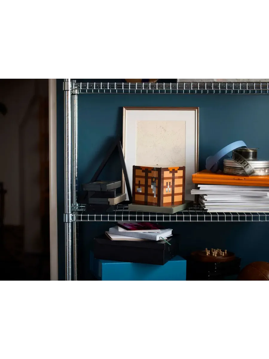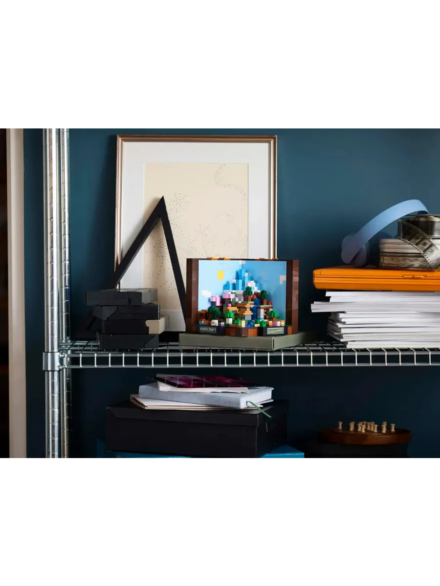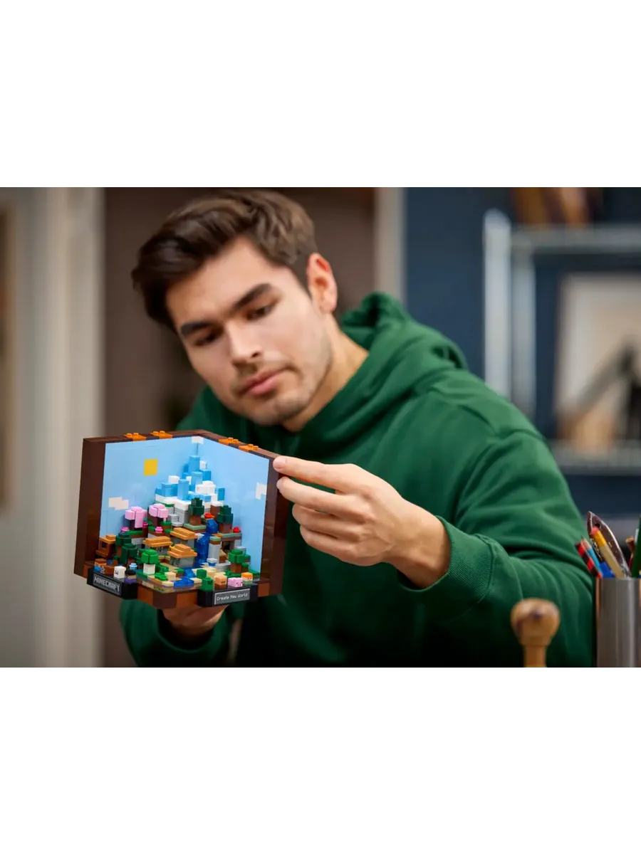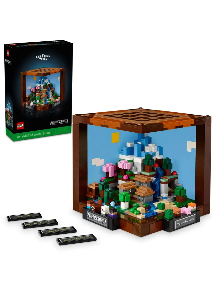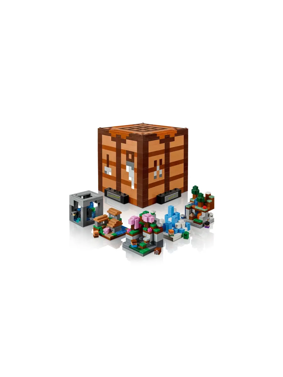 Набор воссоздаёт культовый рабочий стол из игры. Внутри находятся 5 мини-модулей для сборки 12 биомов Minecraft, в том числе тайга с пещерой из сталактитов, равнины с деревней, ледяные шипы с иглу, вишнёвая роща с заброшенной шахтой и глубокая тьма с пышной пещерой. В набор также входят 8 микрофигурок: Стив, Алекс, скелет, ведьма, крипер, житель деревни, корова и свинья. Мини-конструкции и микрофигурки отсоединяются от основной модели, что открывает широкие возможности для демонстрации. На переднюю часть модели Minecraft можно наклеить стикеры с запоминающимися игровыми фразами.