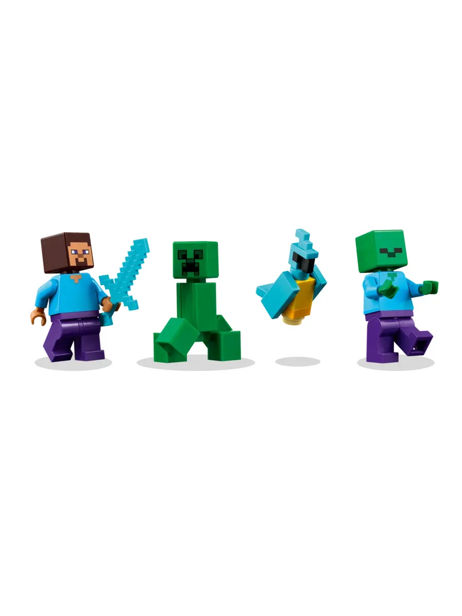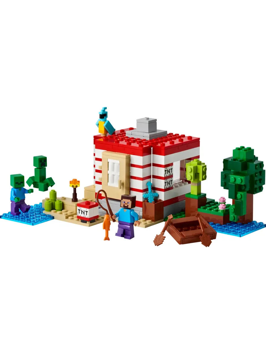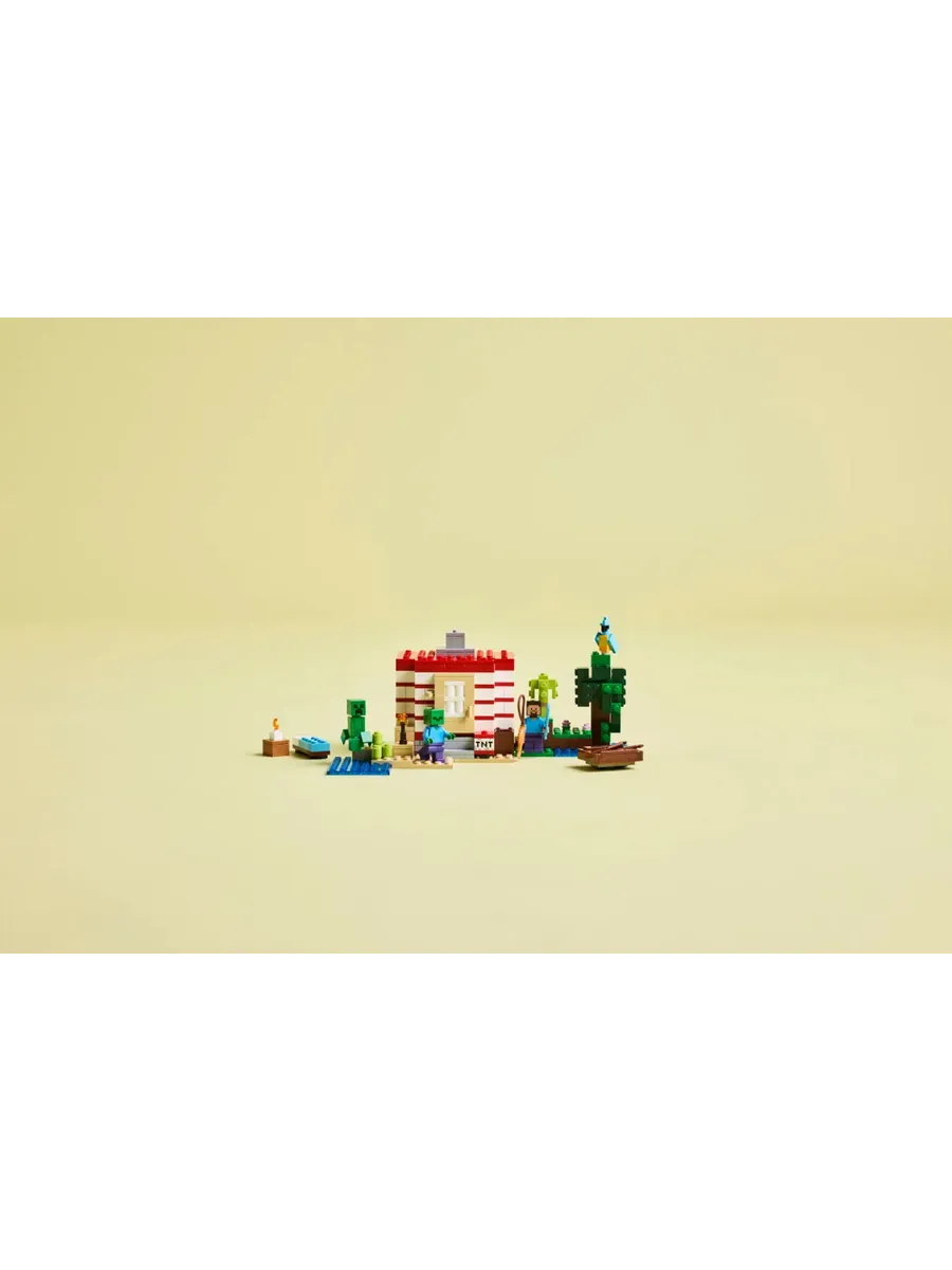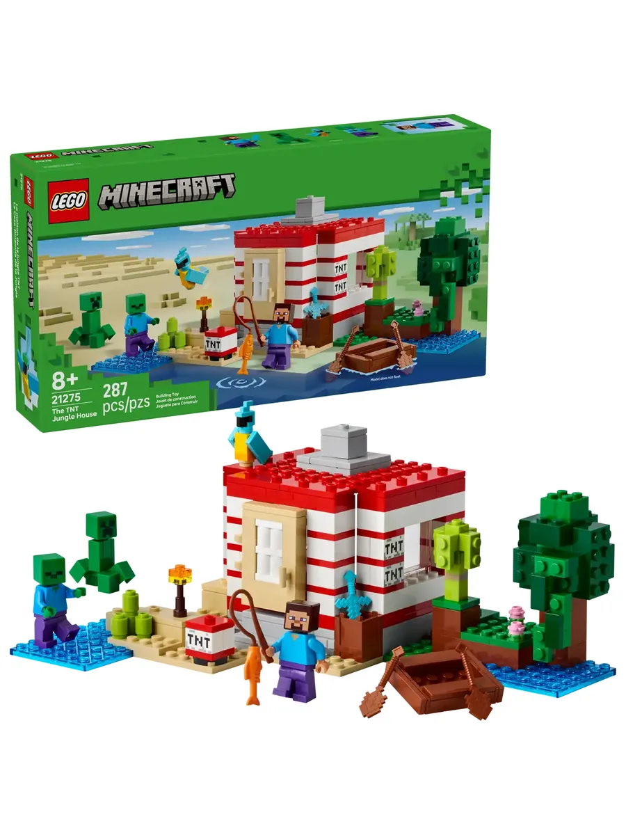 Строящийся дом расположен в биоме джунглей Minecraft и выглядит как увеличенная версия культового элемента игры — динамита. С помощью переключателя сбоку дети могут активировать функцию взрыва динамита, которая разрушает весь дом. Когда пыль осядет, дети могут восстановить дом, чтобы он был готов к следующему приключению. Минифигурки Стива, Крипера и зомби вдохновляют на творческие игры и сражения. Оригинальные аксессуары LEGO Minecraft включают лодку, удочку, рыбу, попугая и листву джунглей.