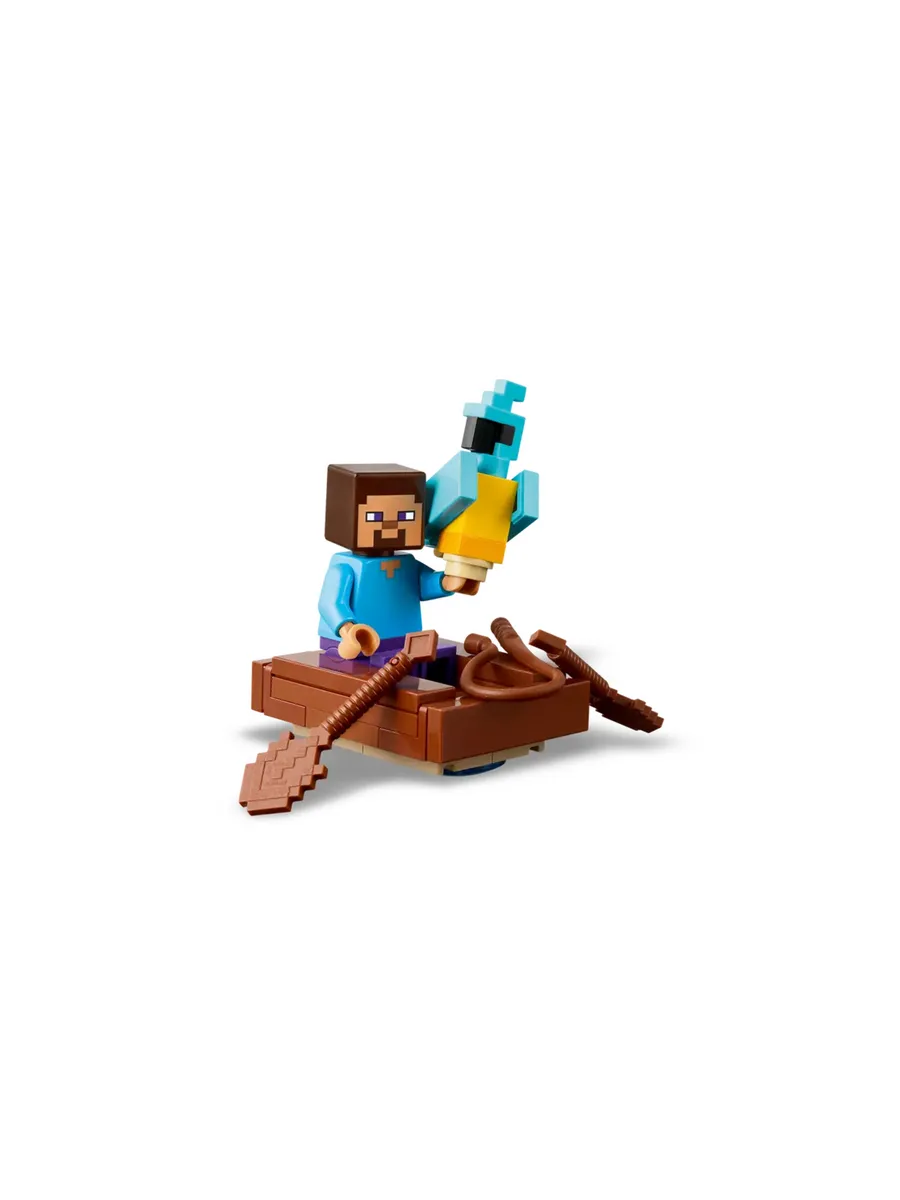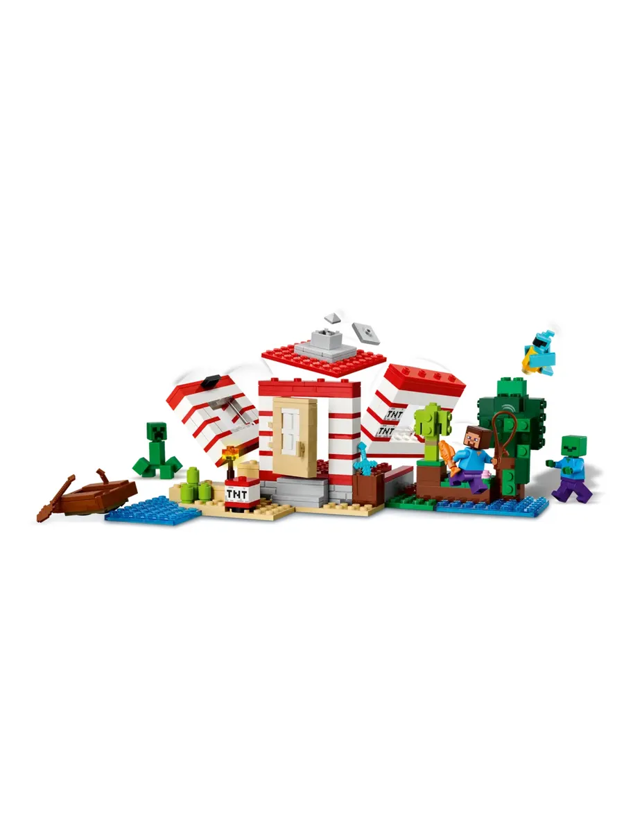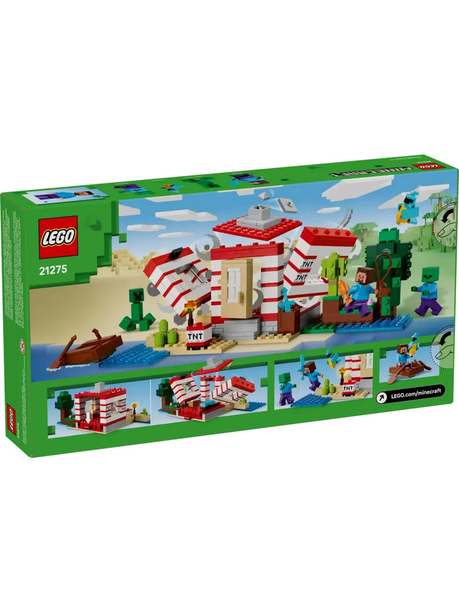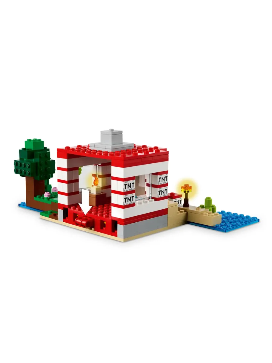 Строящийся дом расположен в биоме джунглей Minecraft и выглядит как увеличенная версия культового элемента игры — динамита. С помощью переключателя сбоку дети могут активировать функцию взрыва динамита, которая разрушает весь дом. Когда пыль осядет, дети могут восстановить дом, чтобы он был готов к следующему приключению. Минифигурки Стива, Крипера и зомби вдохновляют на творческие игры и сражения. Оригинальные аксессуары LEGO Minecraft включают лодку, удочку, рыбу, попугая и листву джунглей.