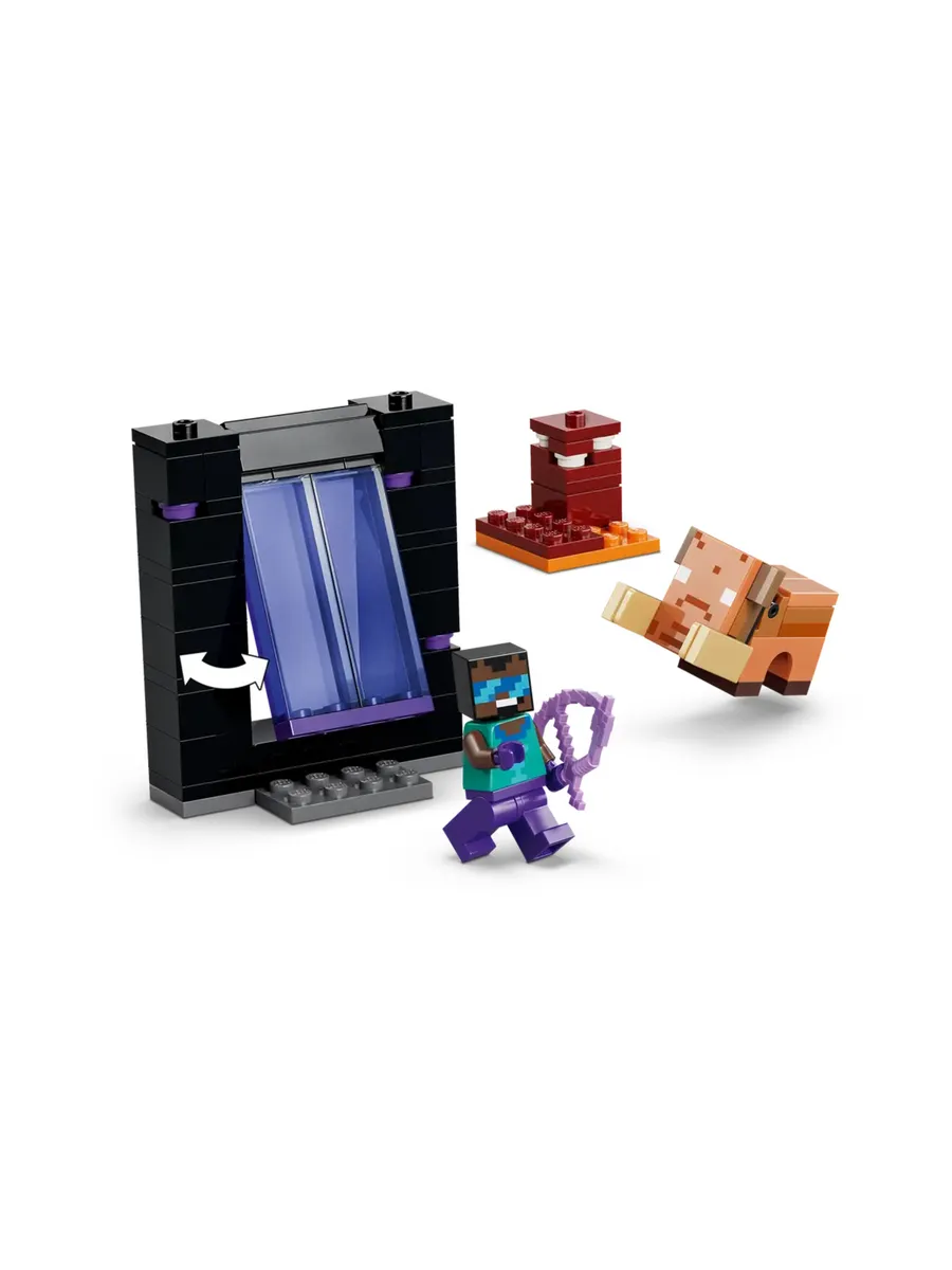 Активируйте порталы игрушки и проходите через них, чтобы найти сборку LEGO из каждого биома и экшена Minecraft с классной минифигуркой героя, а также фигурками Эндермана и малыша хоглина.