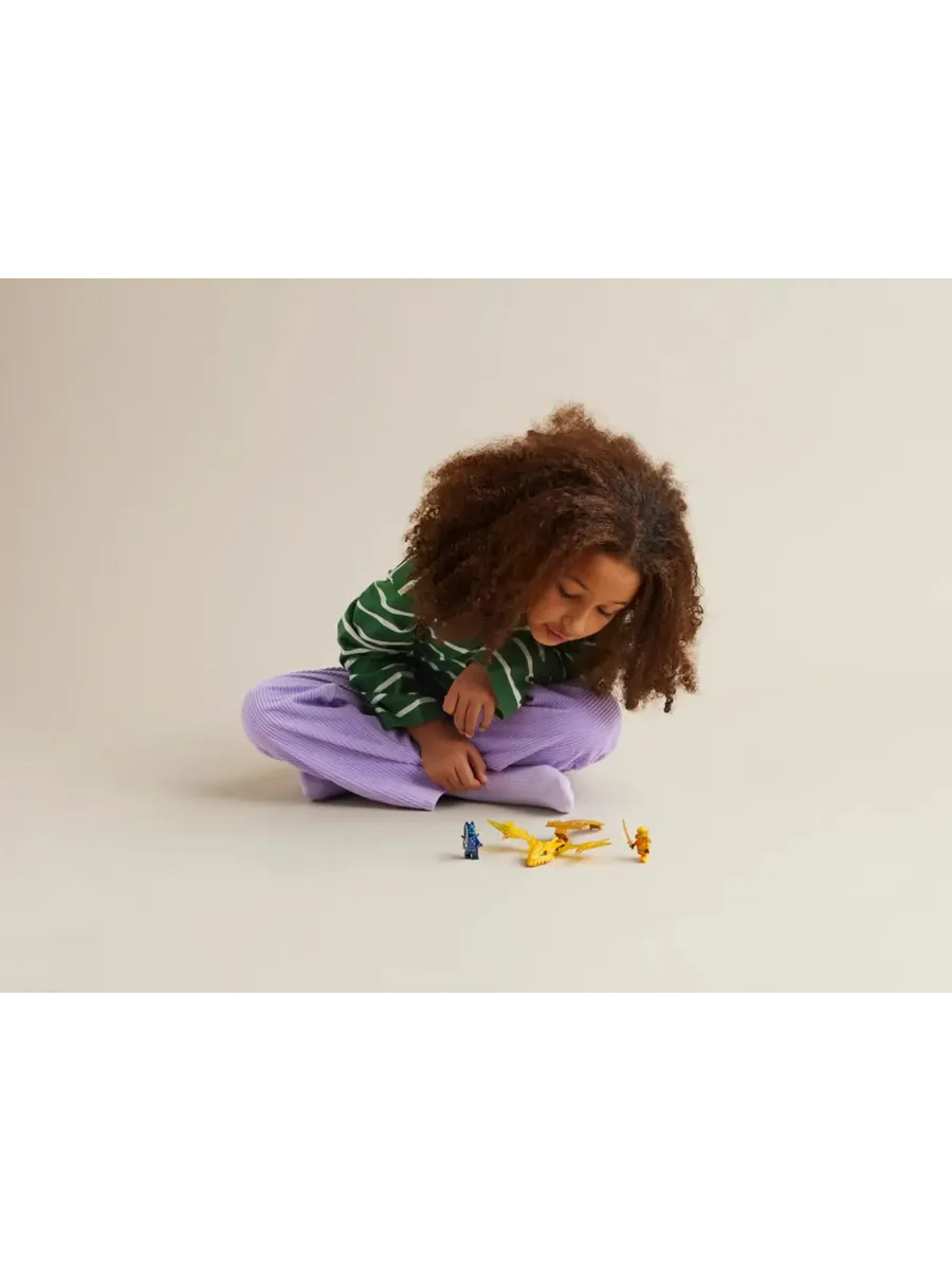 В этом наборе с драконом есть 2 минифигурки: Восходящий Дракон Арин с катаной, который может ездить верхом на драконе, и Воин в волчьей маске со своим мечом. Дети могут устраивать сражения между фигурками ниндзя, чтобы выиграть ярко-зелёный элемент силы дракона, который находится внутри подвижной пасти жёлтого дракона.