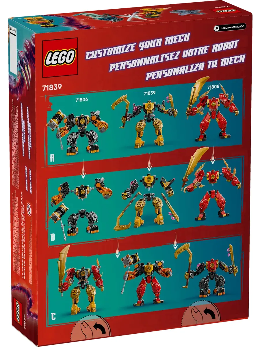 Дети также могут создать свой собственный идеальный робот, заменив детали боевого робота Арин «Спинжицу» на детали настраиваемых роботов из серии NINJAGO 2024 (продаются отдельно): «Элементарный земной робот» Коула (71806), «Элементарный технический робот» Соры (71807), «Элементарный огненный робот» Кая (71808) и «Элементарный силовой робот» Ллойда (71817).