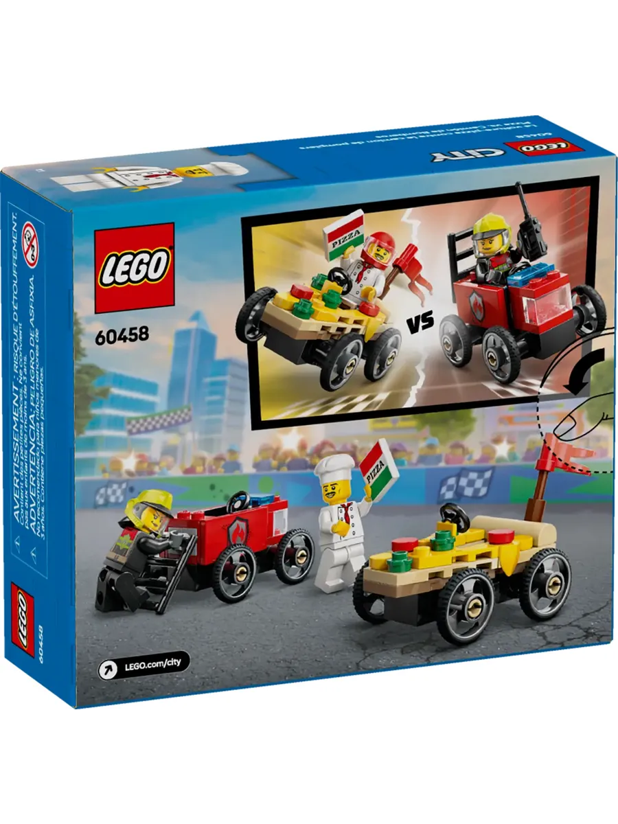 Порадуйте своего фаната гонок набором LEGO City Pizza vs. Пожарная машина (60458) для детей от 5 лет. В этом забавном гоночном наборе есть 2 гоночных автомобиля и 2 минифигурки. Дети могут устроить гонку между шеф-поваром на раскалённом куске пиццы и пожарным на раскалённой пожарной машине. Кто победит? Приготовьтесь к эпическим городским гонкам!