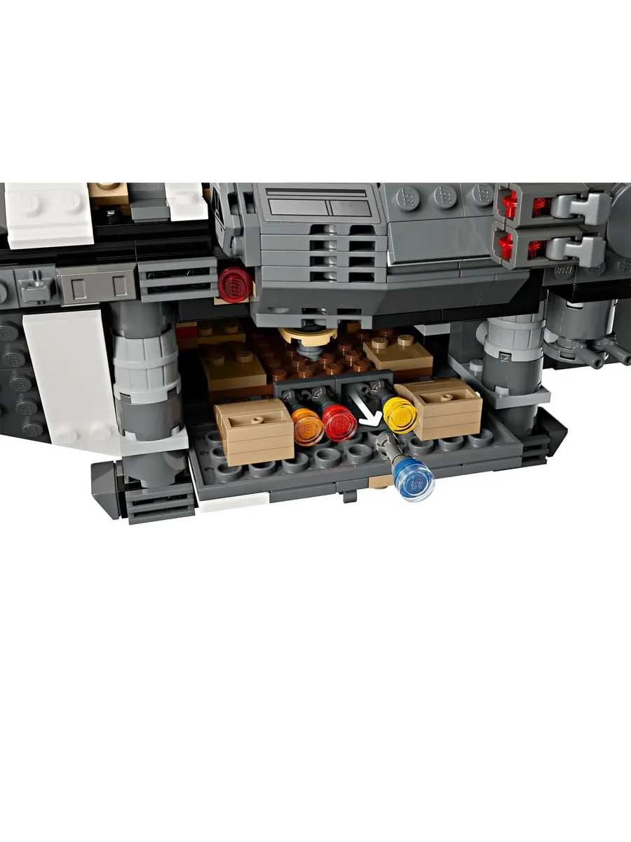 Подлинные детали: кабина пилота, отсек с сиденьями для 4 минифигурок LEGO, вращающиеся двигатели для посадки/взлёта или полёта, 2 пистолета для стрельбы по шишкам и 2 вращающиеся турели, каждая с 2 пистолетами для стрельбы по шишкам.