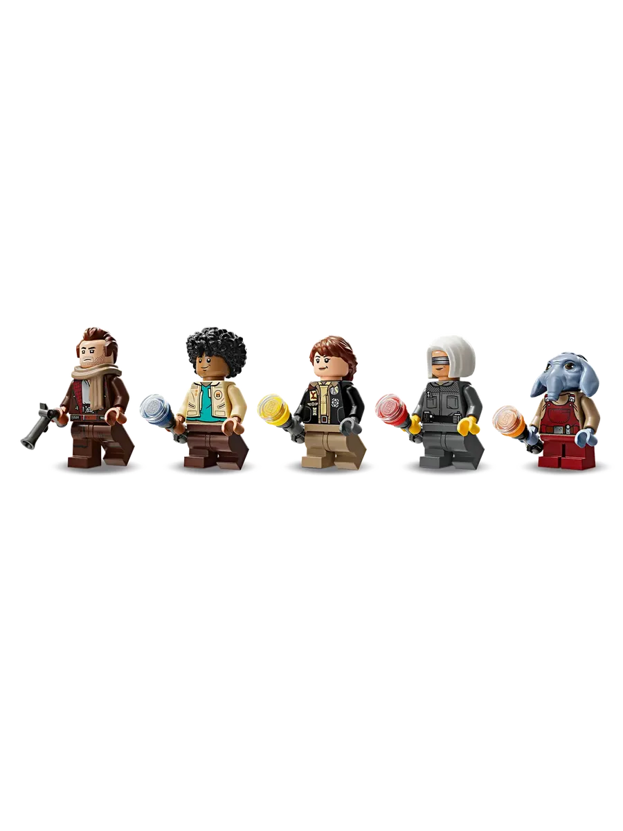5 персонажей LEGO «Звёздные войны» — минифигурка Йода LEGO с бластером в винтажном стиле, а также минифигурки Вима, КБ, Ферн и Нила LEGO, каждая с аксессуаром в виде фонарика