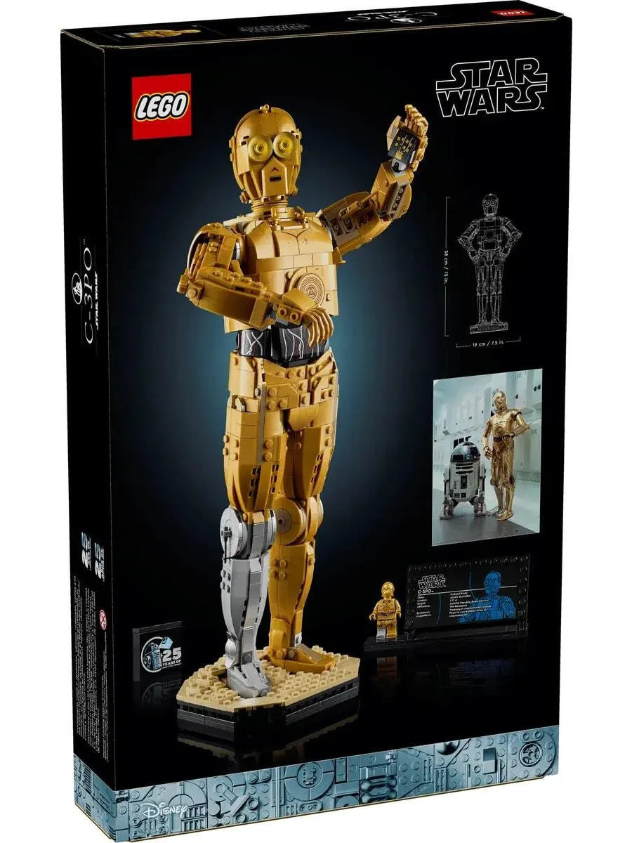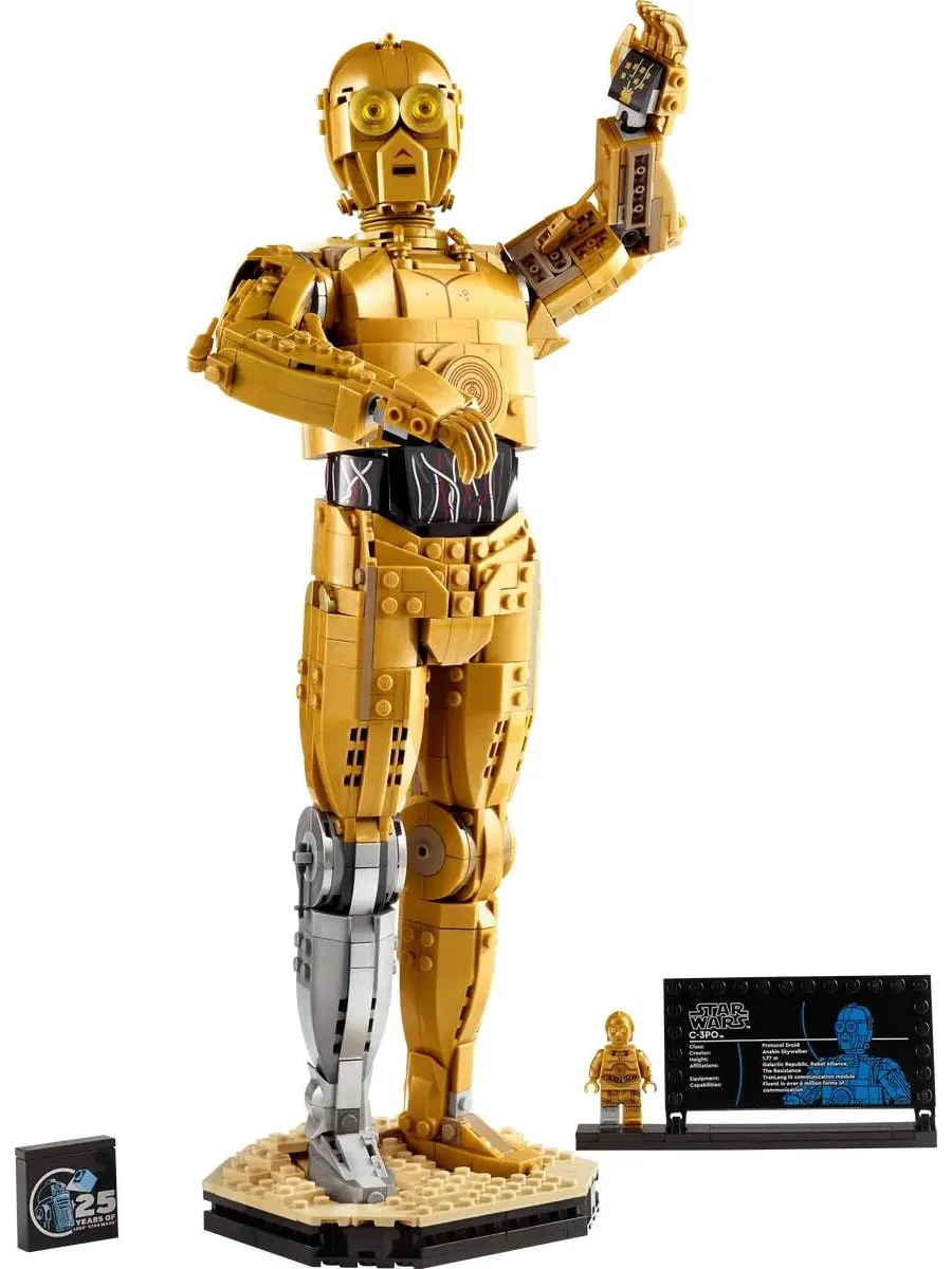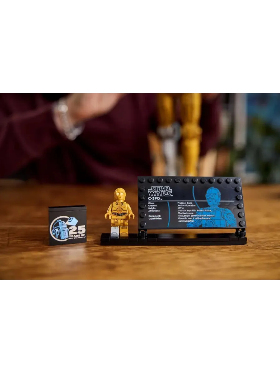 В этом наборе LEGO «Звёздные войны» для взрослых также есть подставка с информационной табличкой C-3PO и место для прилагаемой минифигурки C-3PO LEGO, а также кирпич LEGO «Звёздные войны» в честь 25-летия, который станет эффектным центральным элементом.