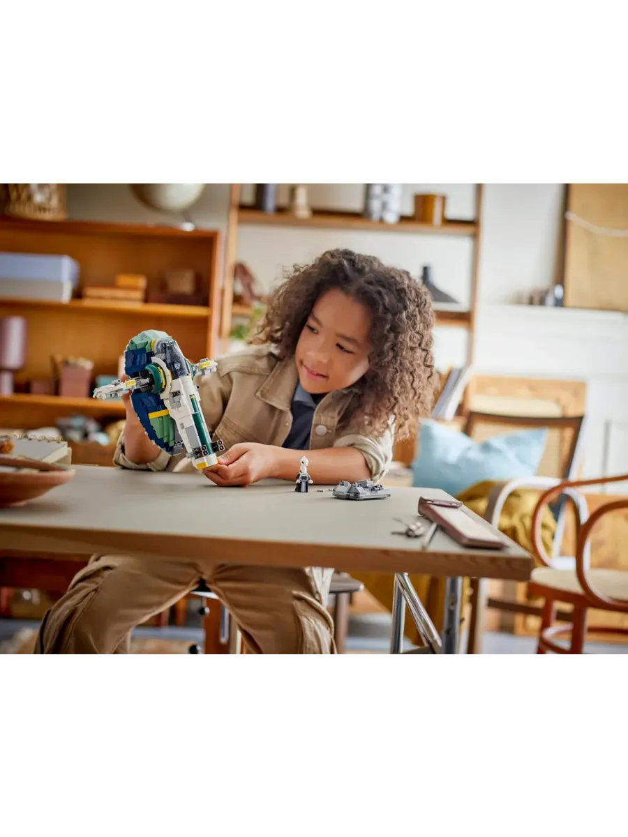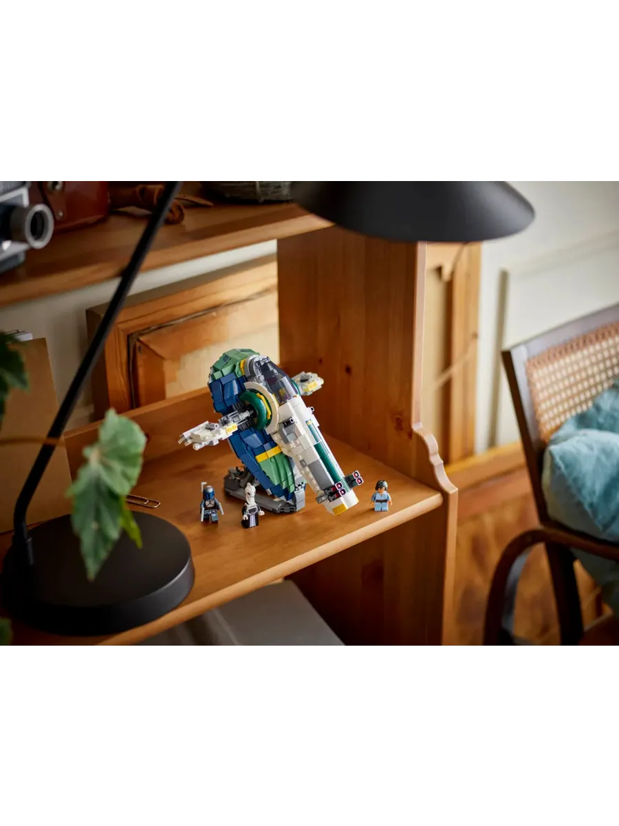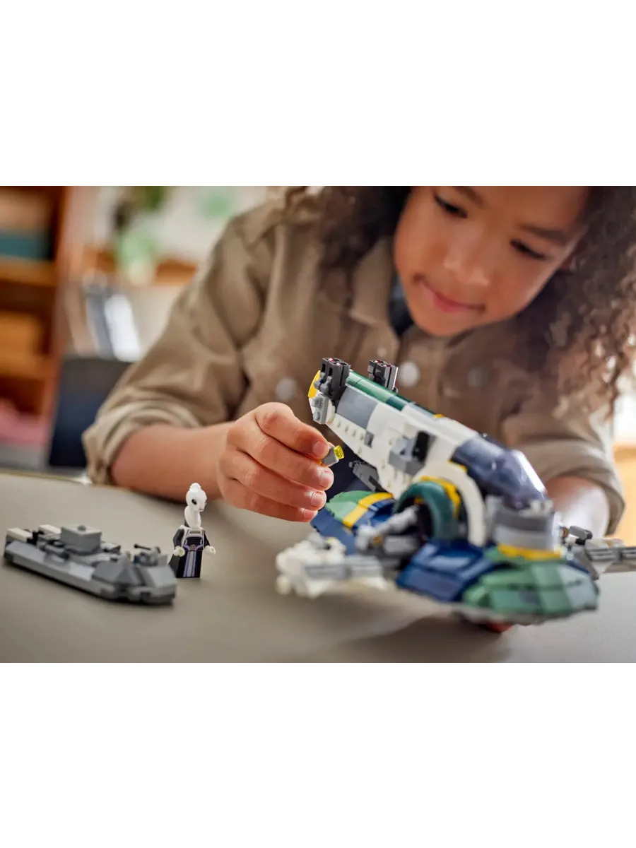 Этот набор — отличный «Звёздные войны» подарок для детей. В него входят 3 минифигурки LEGO: Джанго Фетт с 2 бластерами и ракетным ранцем, юный Боба Фетт и Лама Су. На сервисном автомобиле можно перевозить звёздный корабль. Его также можно использовать в качестве подставки, чтобы оформить модель в стиле фэнтези.