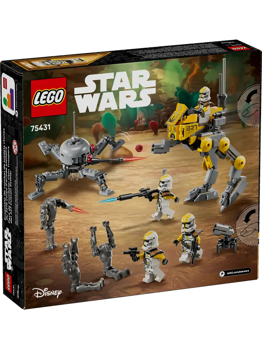 С помощью этого боевого набора (75431) LEGO Звёздные войны: «Месть ситхов» дети смогут собрать отряд клонов-солдат 327. Звёздного корпуса и отправить его в бой против супербоевых дроидов. В набор входят 4 минифигурки LEGO Звёздные войны клонов-солдат в легендарных костюмах 327. Звёздного корпуса, а также 3 супербоевых дроида LEGO. В набор «Звёздные войны» для сборки и игры входит также шагоход AT-RT с кабиной для минифигурки LEGO, стрелком, местом для бластера и подзорной трубой, а также орудийной башней для солдат-клонов. Для любителей экшена и захватывающих ролевых игр у супербоевых дроидов есть дроид-вертушка.