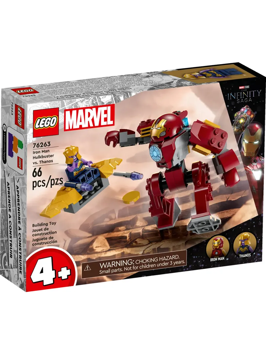 Конструктор LEGO Marvel «Железный человек Халкбастер против Таноса» (76263) включает в себя культовых персонажей и их потрясающие технологии в виде игрового набора, созданного для детей от 4 лет.