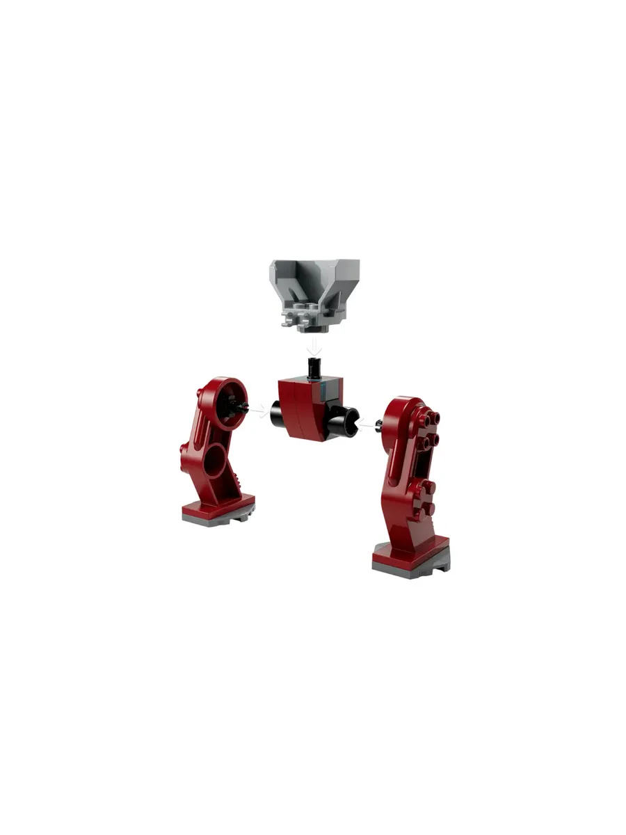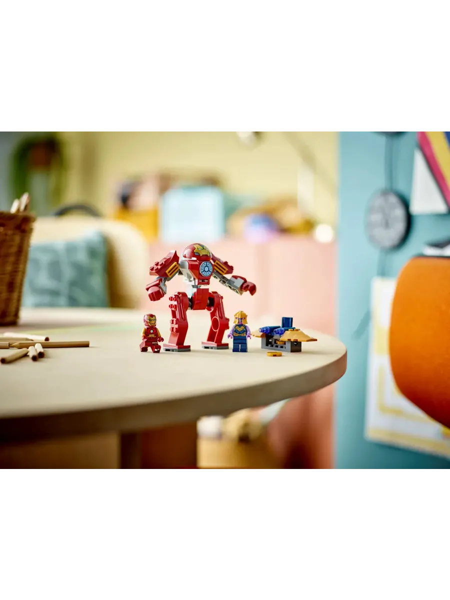 Этот игровой набор, созданный по мотивам фильма Marvel Studios «Мстители: Война бесконечности», объединяет супергероя Железного человека и его робота с суперзлодеем Таносом и его летательным аппаратом. Робот Халкбастер полностью разборный и включает в себя сиденье для минифигурки Железного человека. К летательному аппарату прилагается дисковый шутер и сиденье для минифигурки Таноса. В каждой упаковке с кубиками находится готовая модель и персонаж, которых дети могут сразу же собрать для игры. Красочное иллюстрированное руководство по сборке и игре, а также 2 стартовых набора с механическими ножками упрощают процесс сборки.