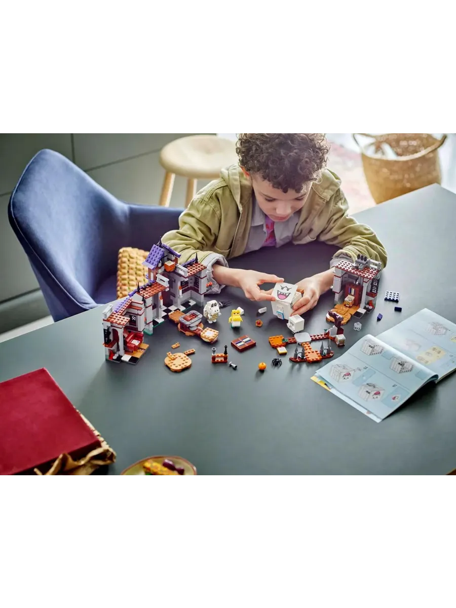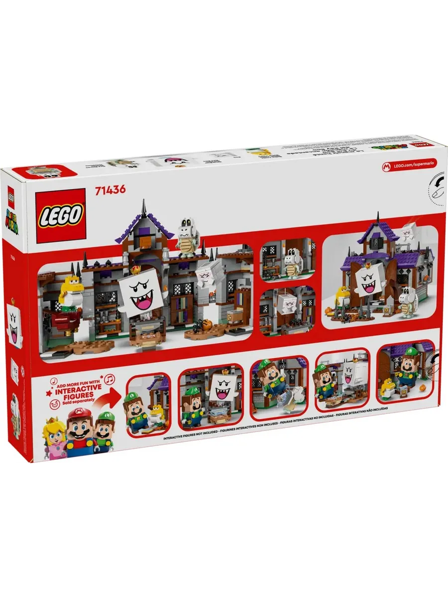 Добавьте фигурку LEGO Марио, LEGO Луиджи или LEGO Пич (не входят в комплект) для интерактивной игры. Помогите им собрать награды с блоков с монетами, сундуками и ключами, победить Бу и Сухие Кости, столкнуть Короля Бу со стола во дворе и в конце концов открыть сундук с сокровищами.