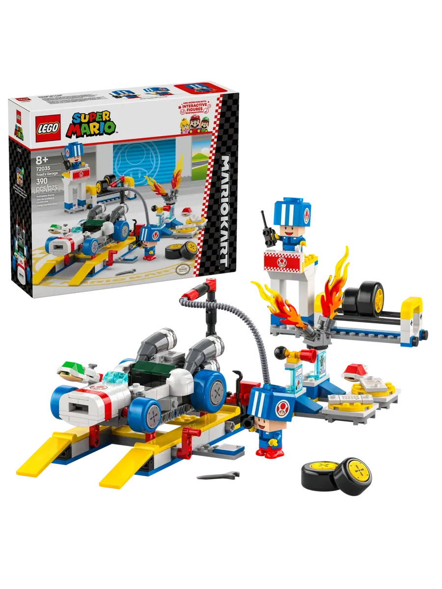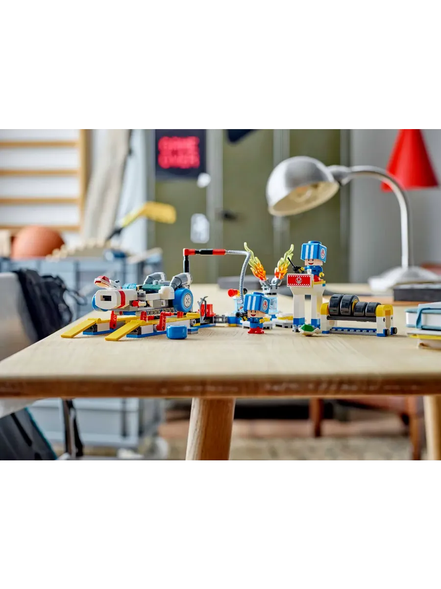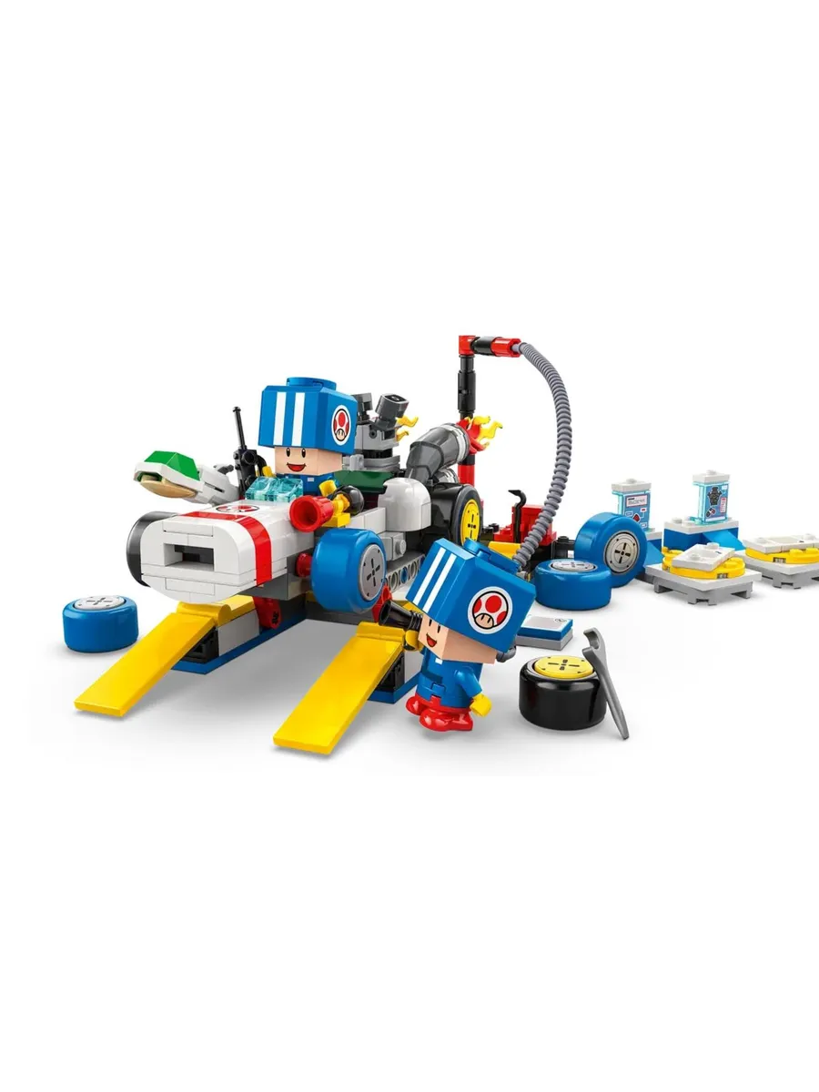 Позвольте детям разыграть роль рабочих в гараже Тоада и подготовить B Dasher к гонкам с помощью этого настраиваемого игрового набора LEGO Super Mario: Mario Kart (72035). Это фантастическая идея подарка для мальчиков, девочек и геймеров в возрасте от 8 лет и старше. В набор входят 2 игрушечные фигурки Синей Жабы в синей форме рабочих, а также работающий автомобильный лифт, стандартные или синие стандартные шины и инструменты. У B Dasher есть пулемёт, а конструкторы также могут установить гудок и двигатель от Customization Machines.