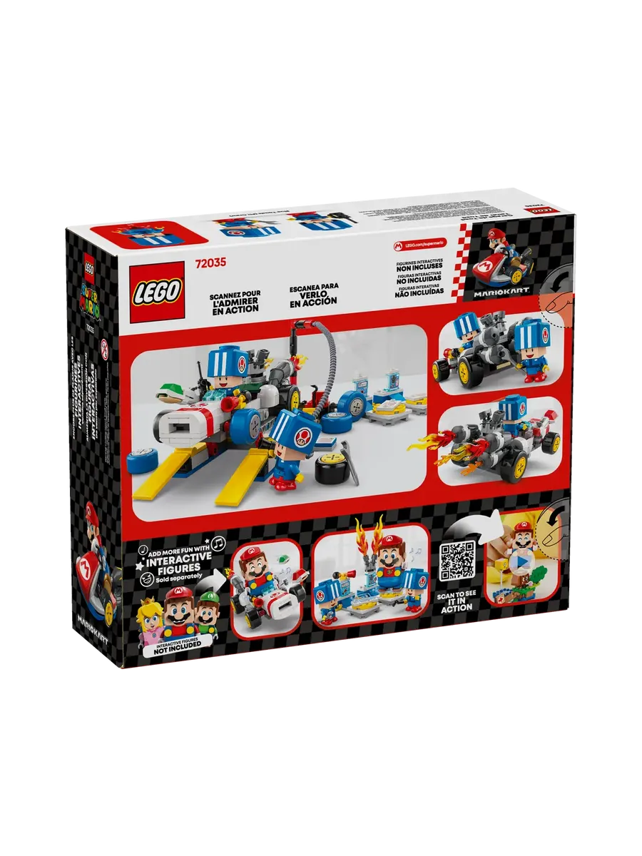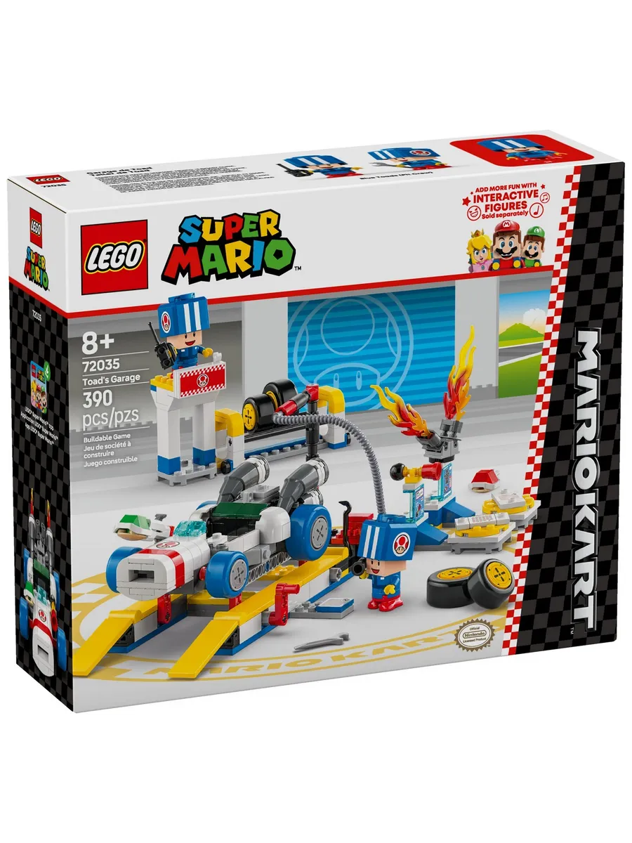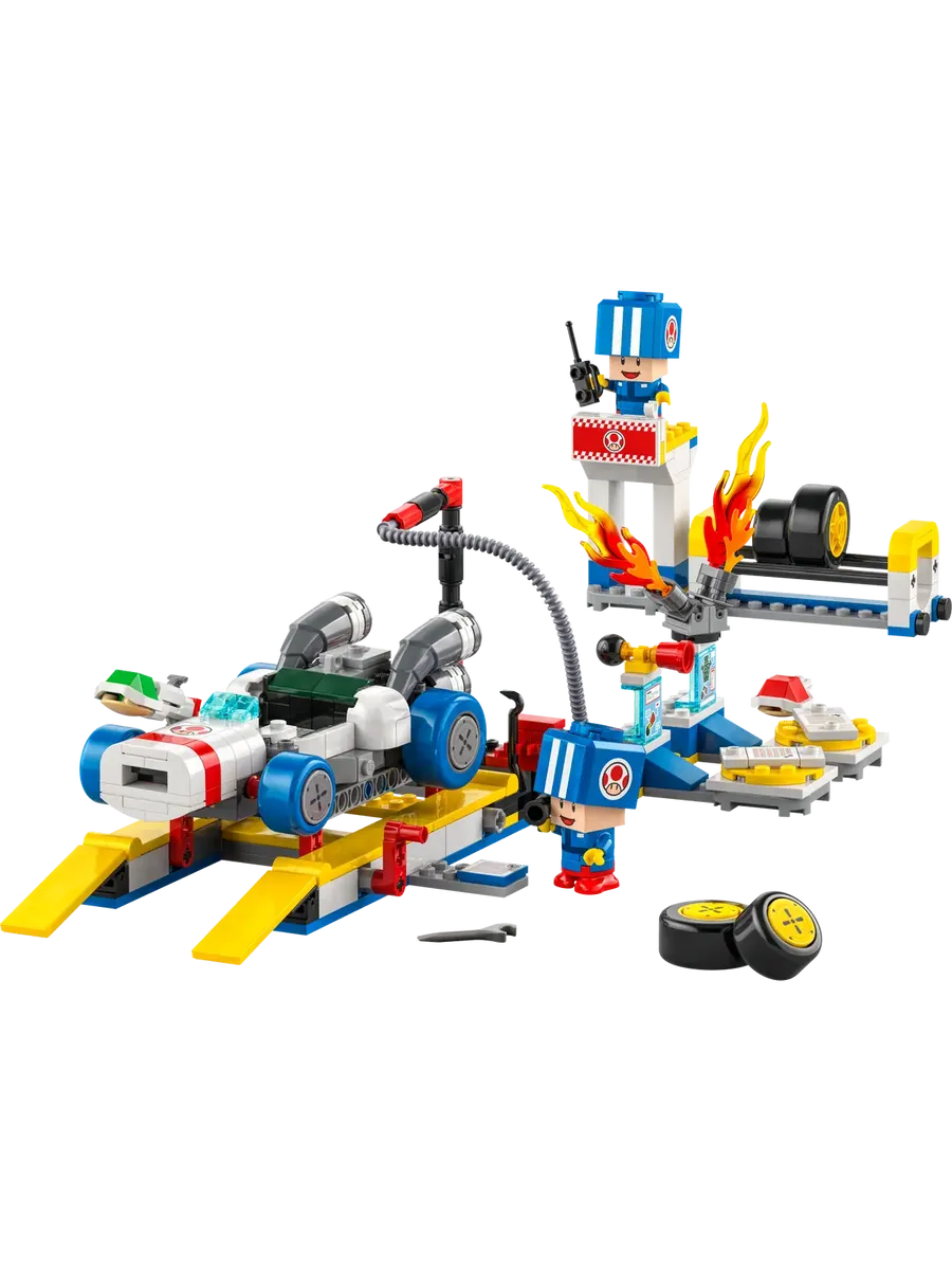 Позвольте детям разыграть роль рабочих в гараже Тоада и подготовить B Dasher к гонкам с помощью этого настраиваемого игрового набора LEGO Super Mario: Mario Kart (72035). Это фантастическая идея подарка для мальчиков, девочек и геймеров в возрасте от 8 лет и старше. В набор входят 2 игрушечные фигурки Синей Жабы в синей форме рабочих, а также работающий автомобильный лифт, стандартные или синие стандартные шины и инструменты. У B Dasher есть пулемёт, а конструкторы также могут установить гудок и двигатель от Customization Machines.