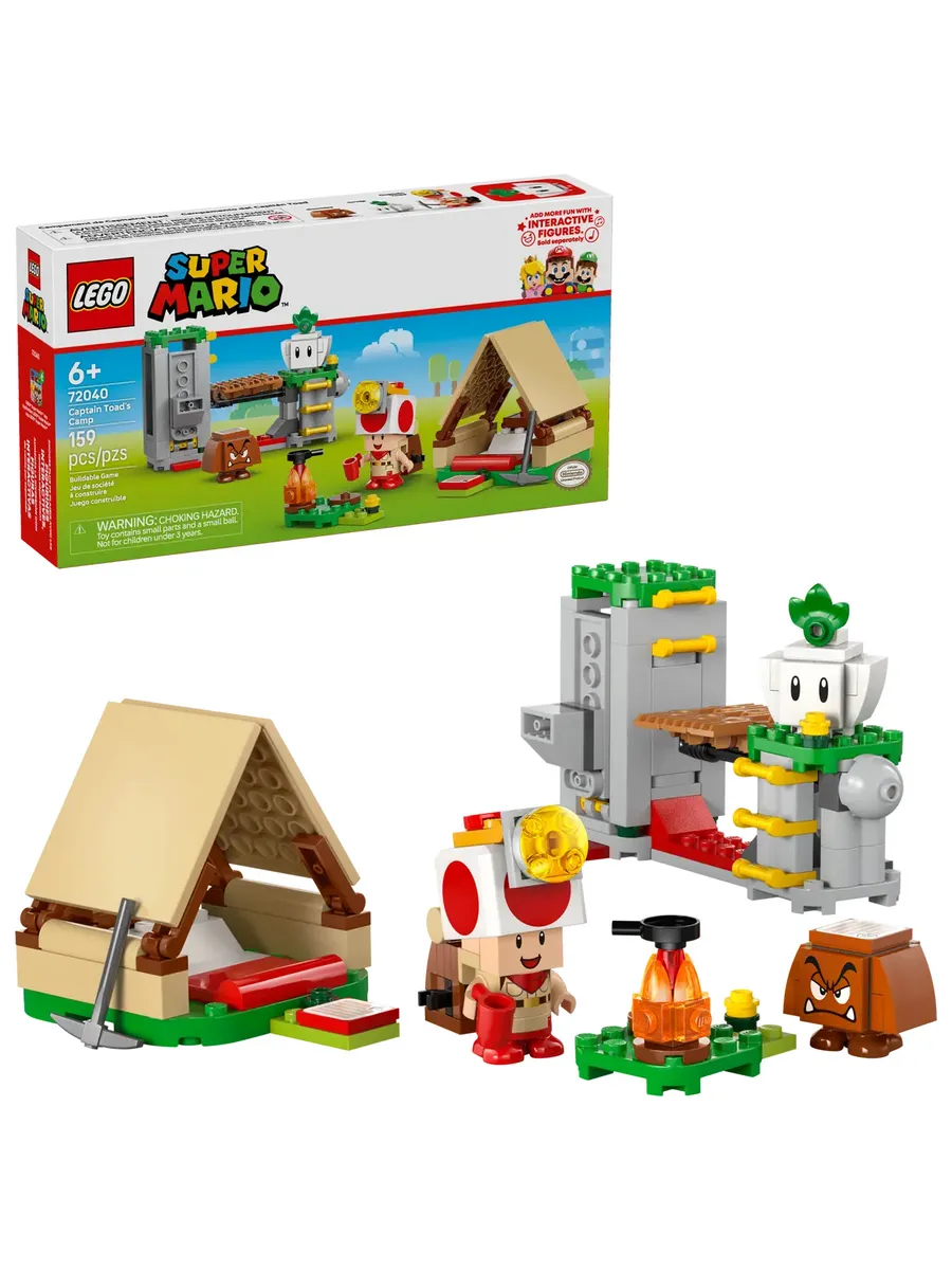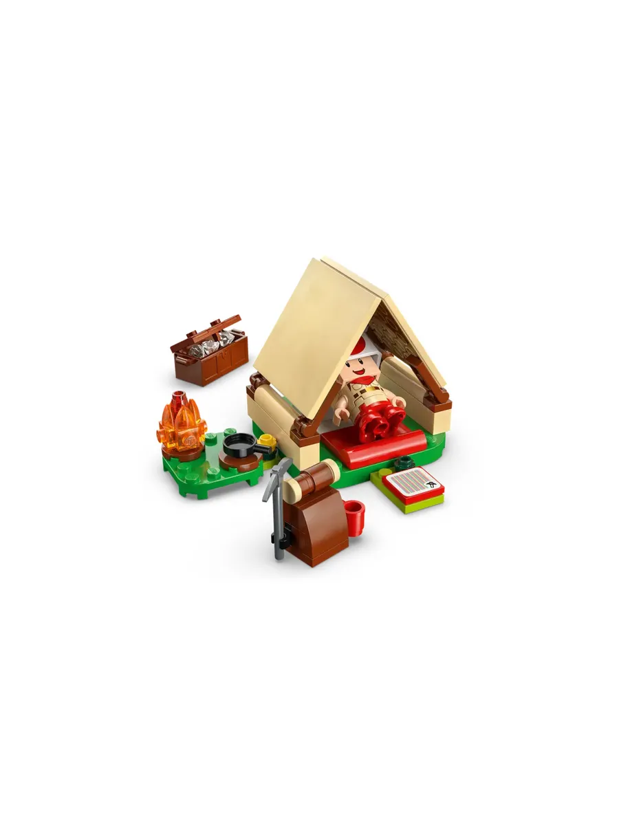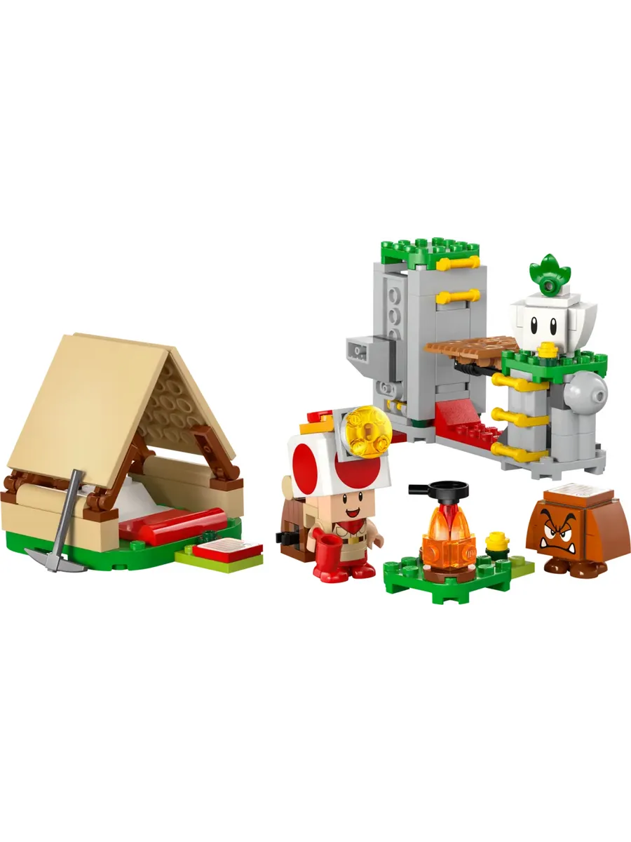 Забавный игровой набор LEGO Super Mario для детей. Используйте строительные кубики, чтобы построить палатку и развести костёр, отправиться на поиски сокровищ, обрушить мост, победить врагов и многое другое в лагере Капитана Тоада.