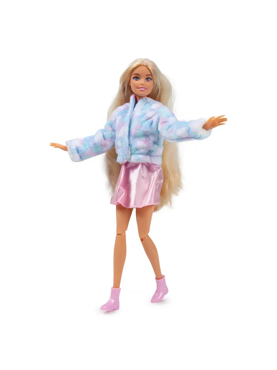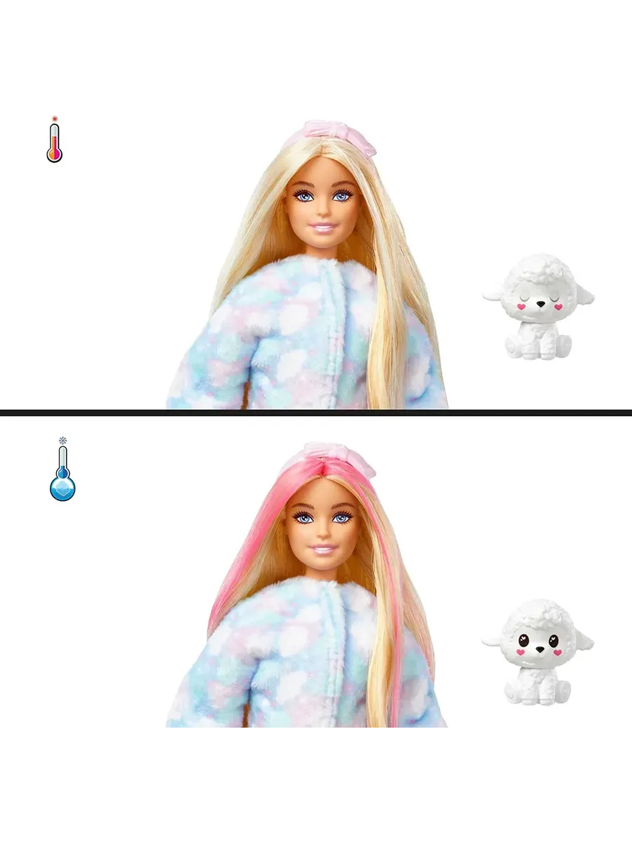 Барби предлагает волнующую распаковку, которая подарит детям 10 сюрпризов! Откройте тубу и найдите в ней милую овечку и 4 непрозрачных пакетика. В костюме овечки прячется кукла Барби с длинными светлыми волосами! Извлеките из пакетов мерцающую юбку, аксессуары, губку-расческу и маленькую фигурку питомца. Верхнюю часть костюма можно вывернуть и получить мягкую куртку для куклы, а его голова превращается в лежанку для питомца! Далее намочите губку-расческу в холодной воде и проведите по лицу Барби и мордочке питомца. На лице куклы проявится яркий макияж, а овечка закроет глазки. Для обратного превращения используйте теплую воду.