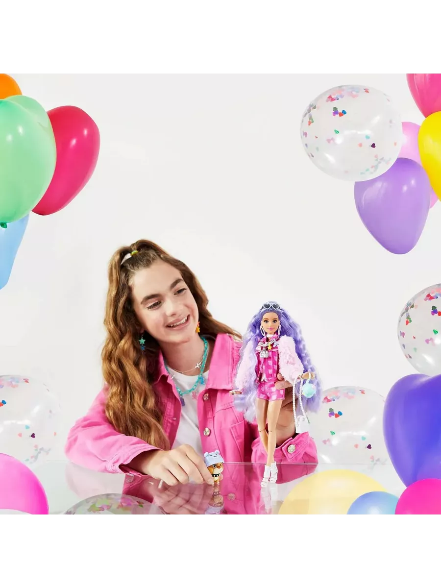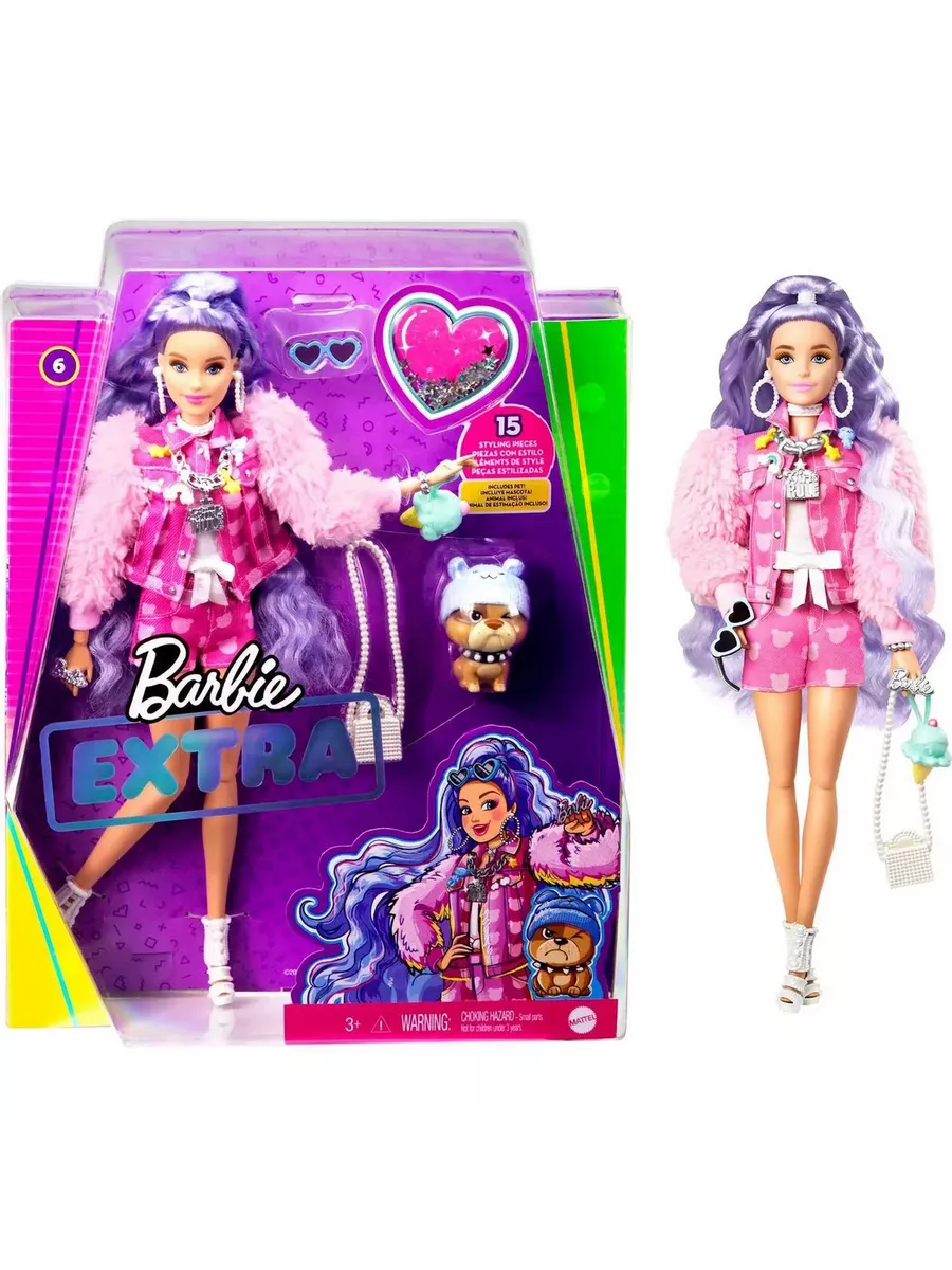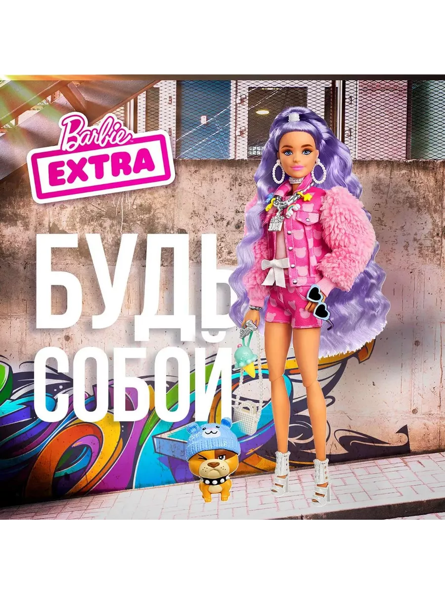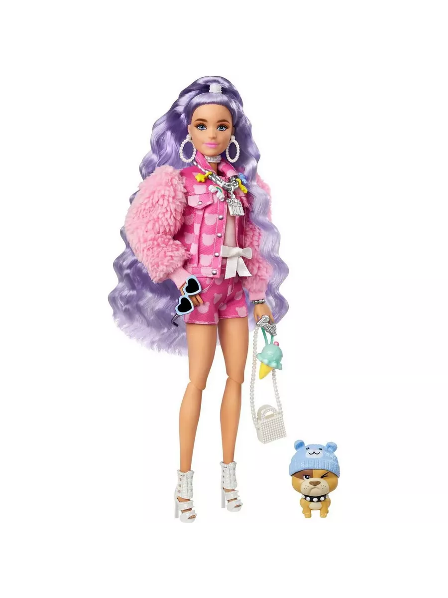 Куклы Барби “Экстра” – воплощение смелых образов в сочетании с яркими цветами! Эта кукла с сиреневыми волосами отличается уникальным стилем, который позволяет ей всегда быть на высоте. Розовый наряд с короткими шортами, кокетливая прическа и маленький щенок, полный обаяния и харизмы, сделают Барби звездой любой вечеринки. Блестки, море аксессуаров и необычные волосы – каждая деталь создает особую атмосферу везде, где бы вы ни оказались вместе с любимой куклой!