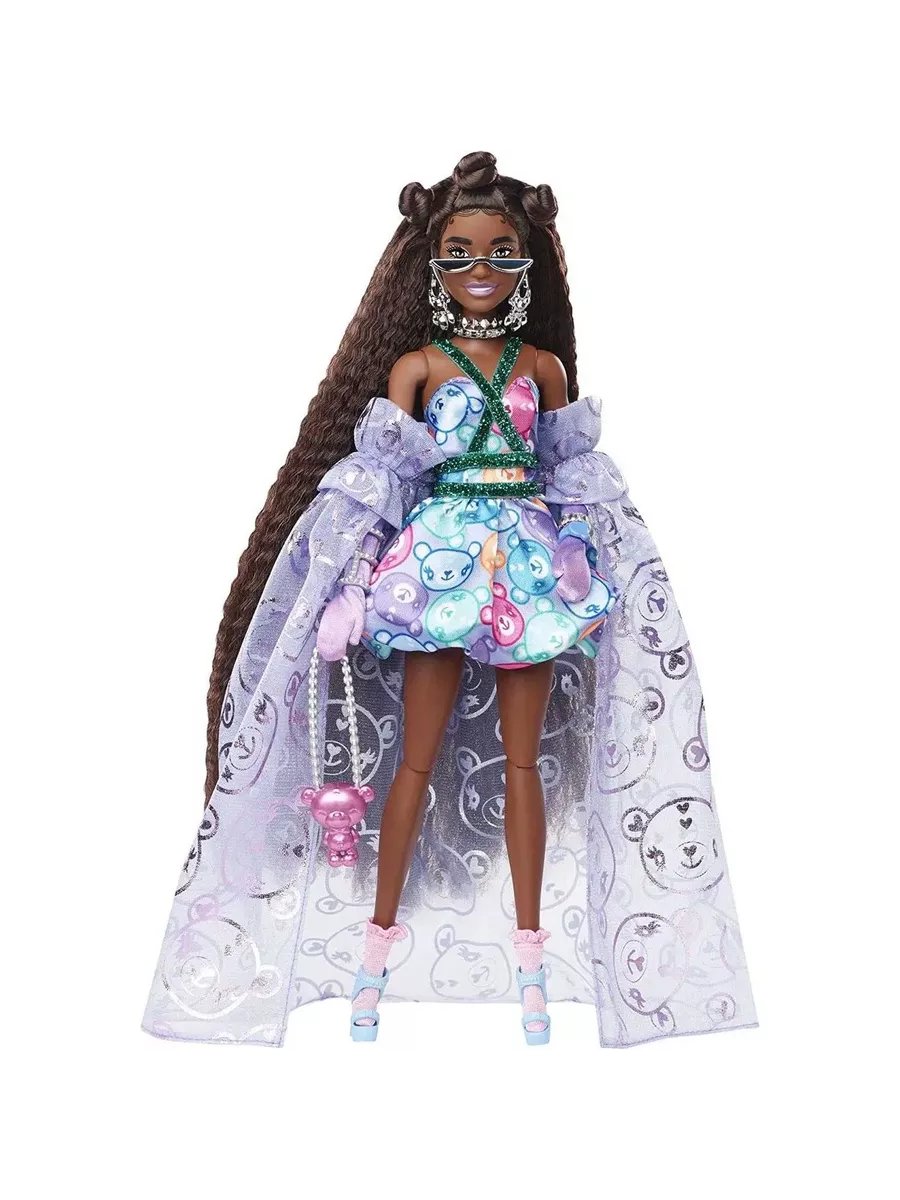 Барби представлена в мини-платье, длинных перчатках и шикарной лёгкой накидке с принтом в виде медвежат