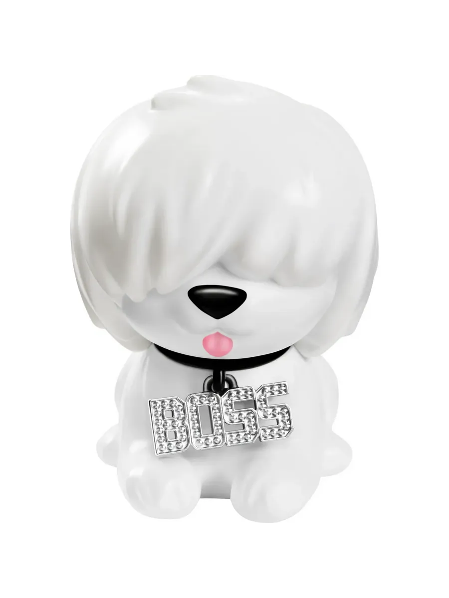 Фигурка щенка с милой мордочкой и лохматой прической представлена с блестящим ошейником с надписью “Босс”