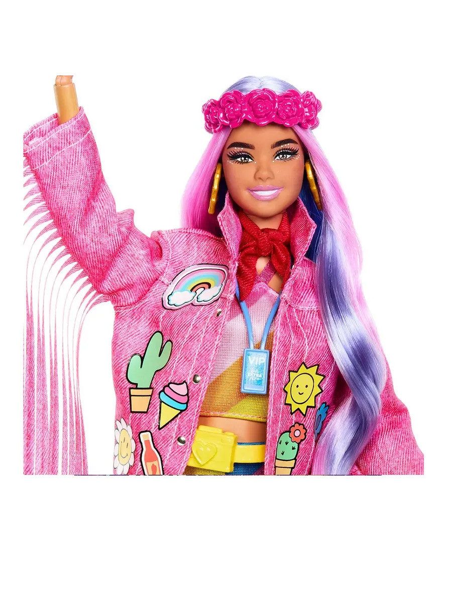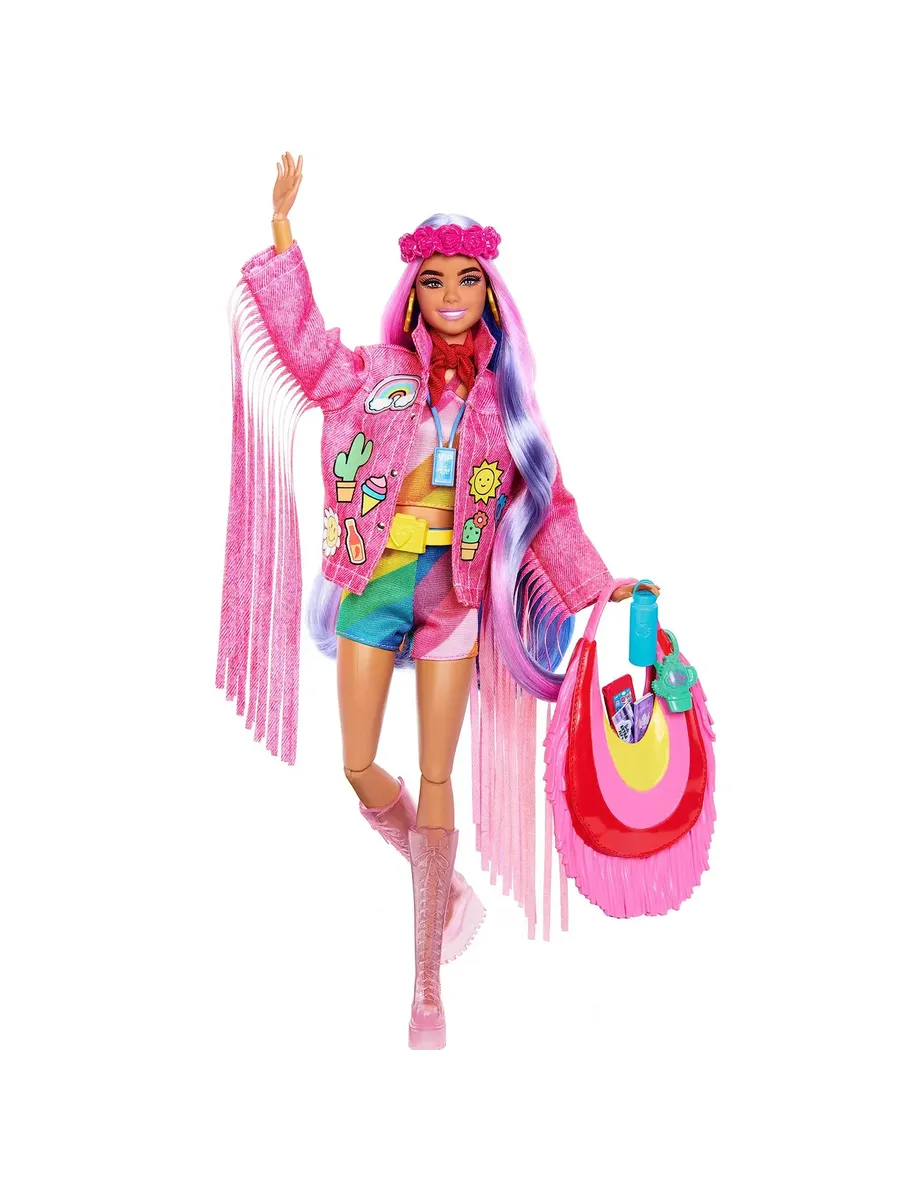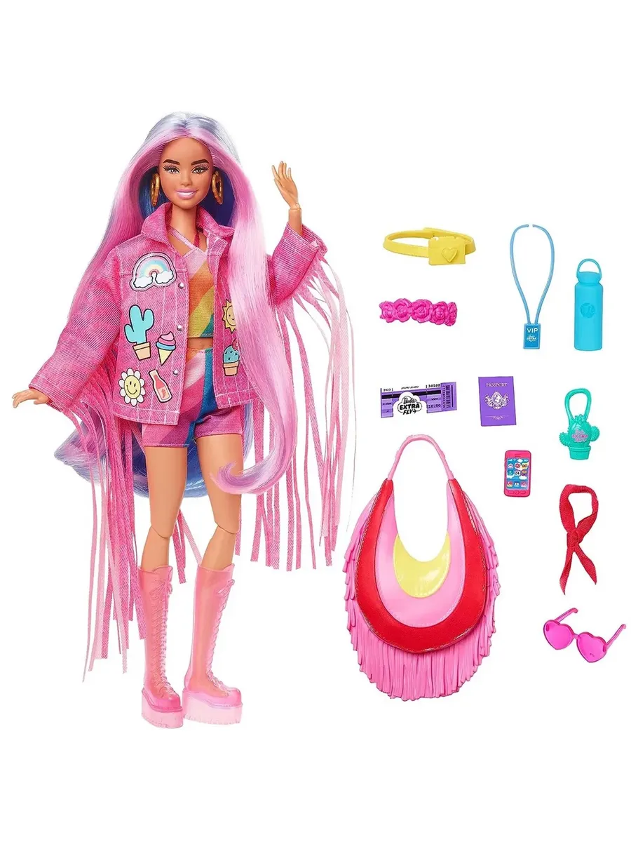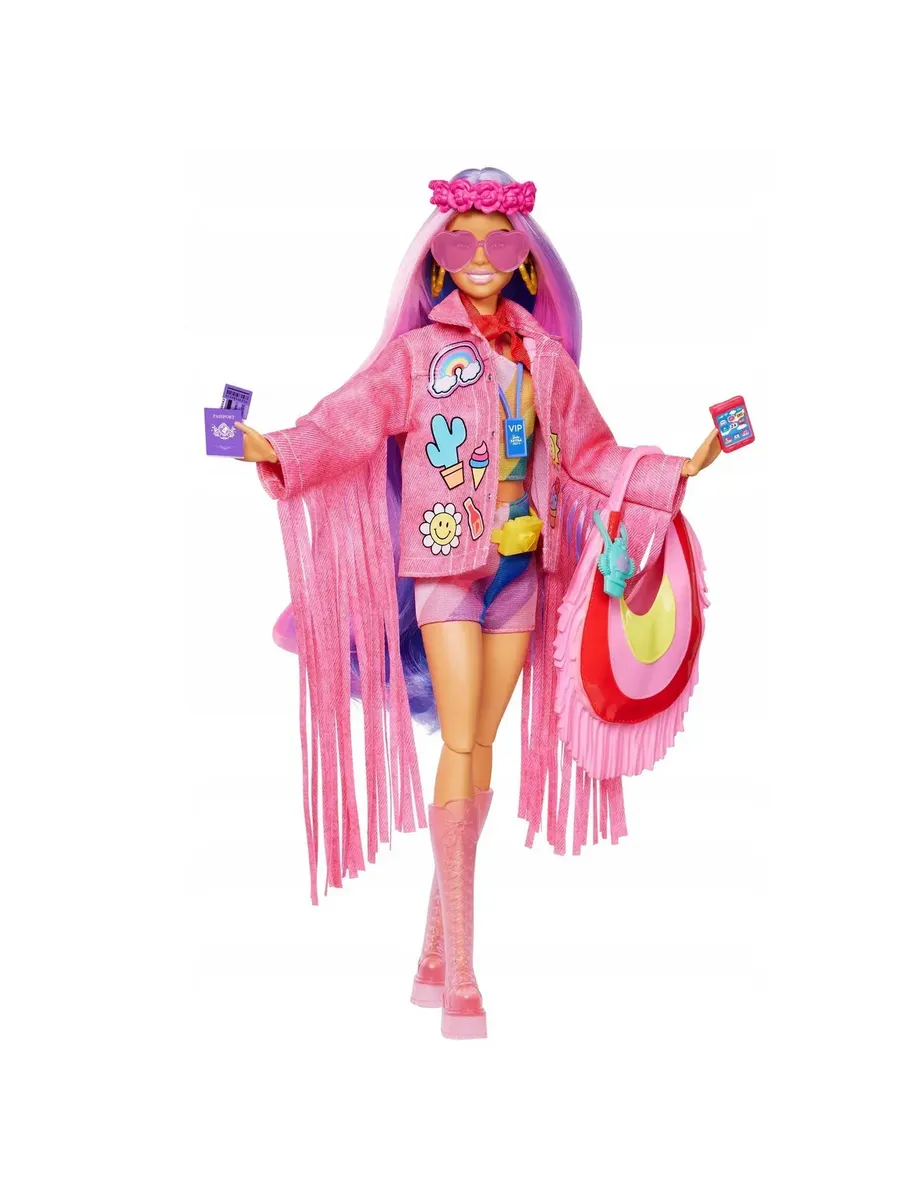 Розовая джинсовая куртка с бахромой придаст ей неповторимый образ, а розовые ботинки добавят стильности. А что еще? В комплекте с куклой идут 15 аксессуаров, среди которых вы найдете корону из розовых цветов, VIP-бейдж, очки в виде сердечка и сумку для фотоаппарата на ремне. Куклы Barbie Extra Fly с таким количеством фантастических аксессуаров для путешествий станут идеальным подарком для детей, которые любят моду, путешествия и приключения.