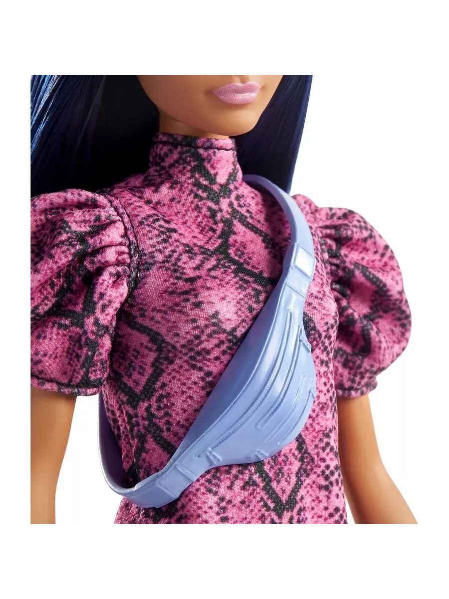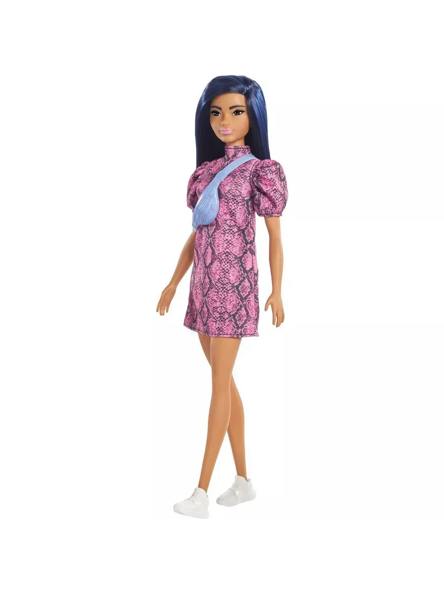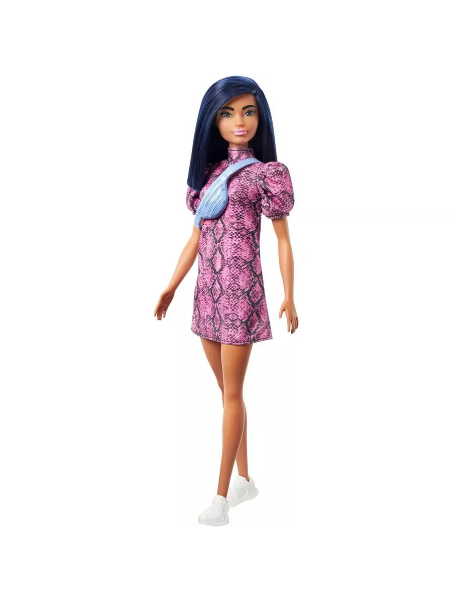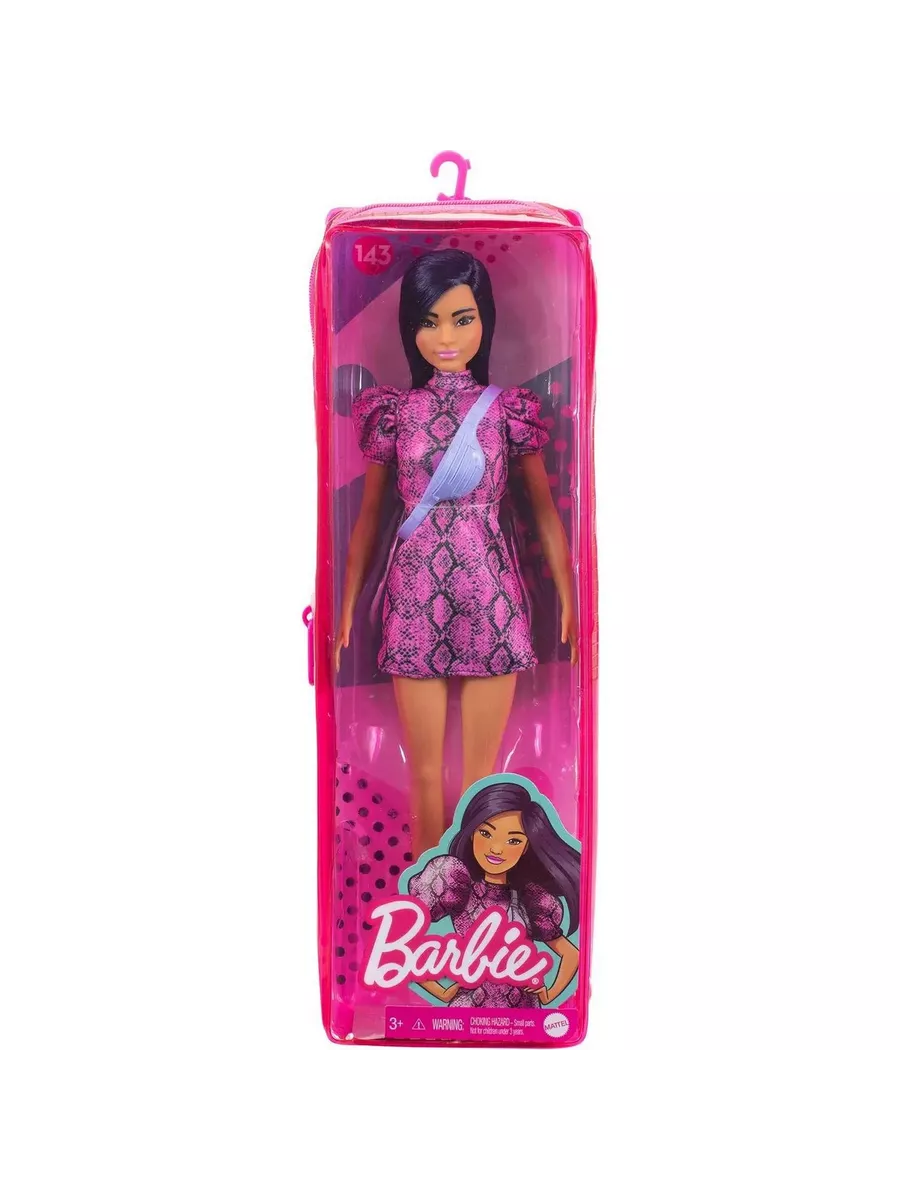 Кукла Барби представлена в розовом платье с анималистичным принтом и короткими рукавами