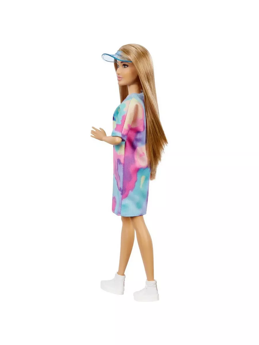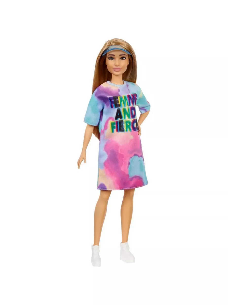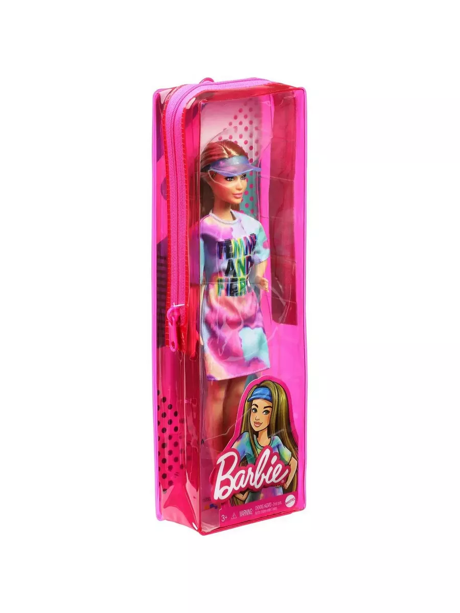 Кукла Барби представлена в разноцветном платье-футболке с принтом