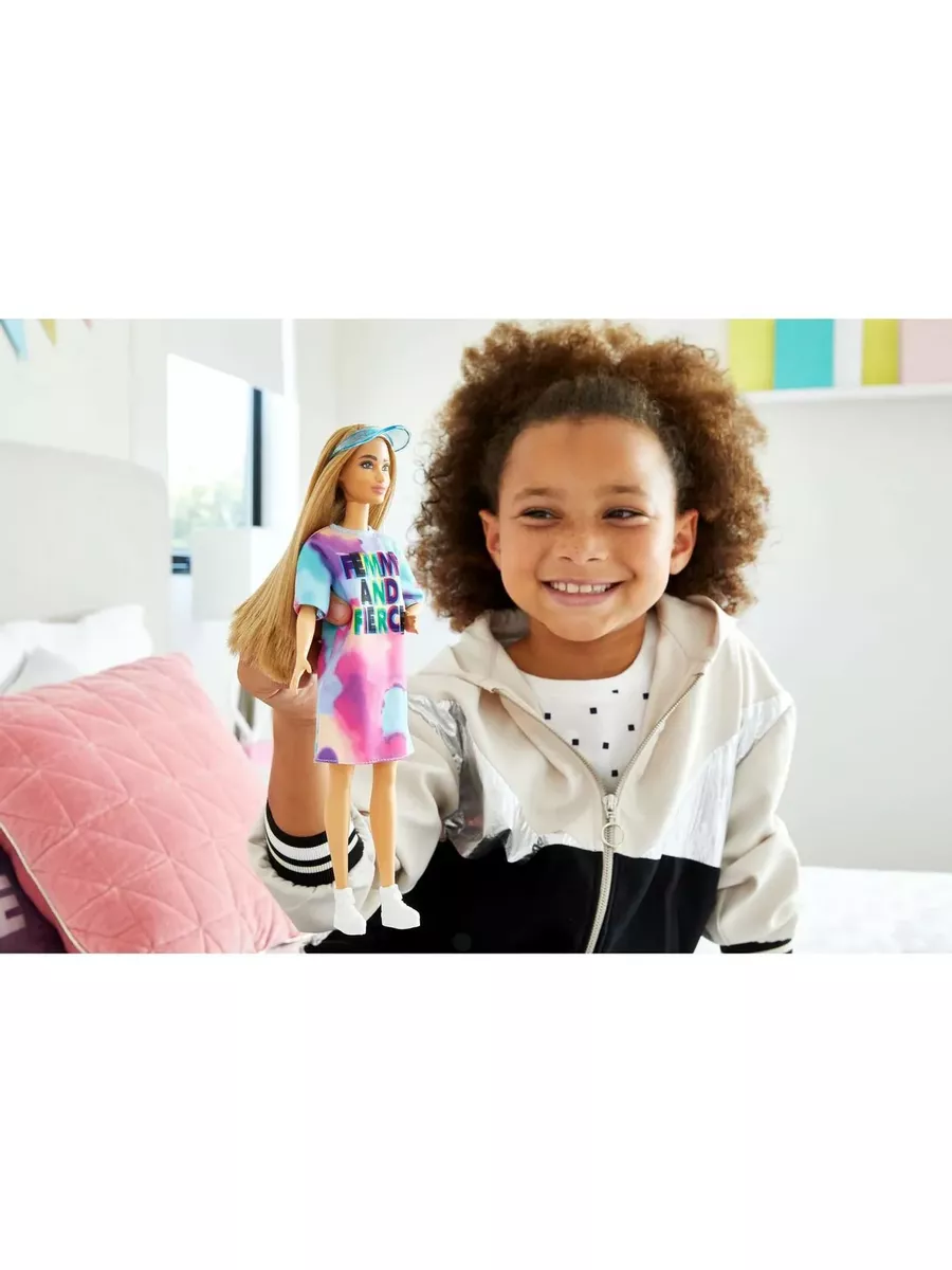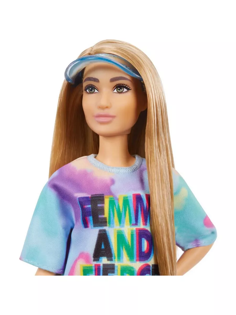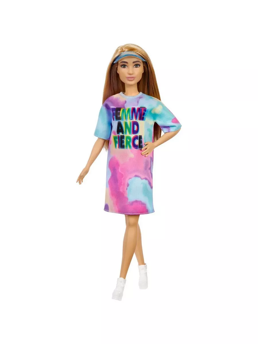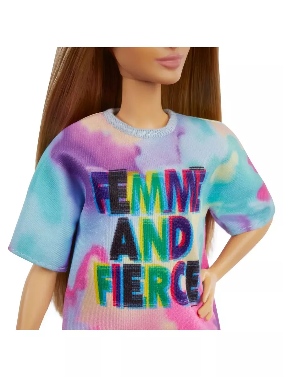 Кукла Барби представлена в разноцветном платье-футболке с принтом