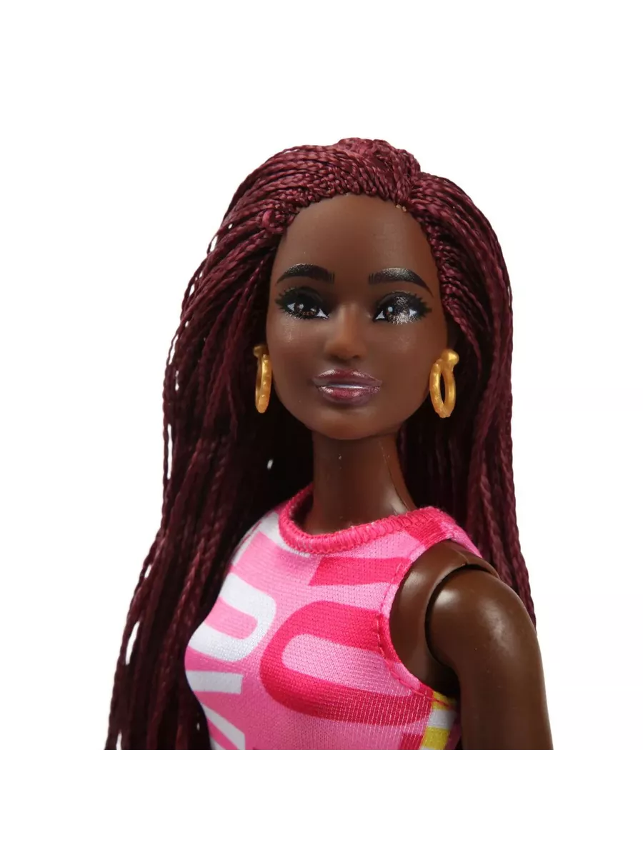 Эта кукла Барби имеет пышную форму тела, носит длинное платье без рукавов в стиле колор-блок с надписью «Love» и белые кроссовки для модного современного образа.