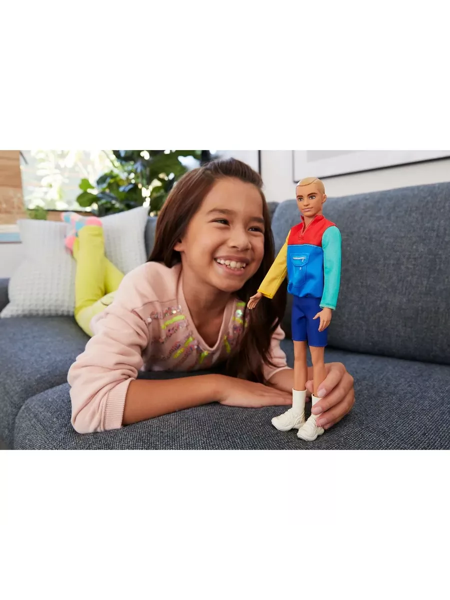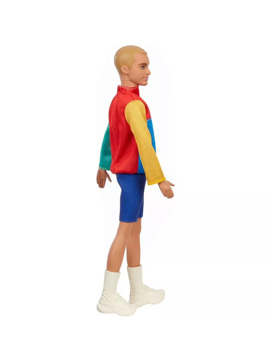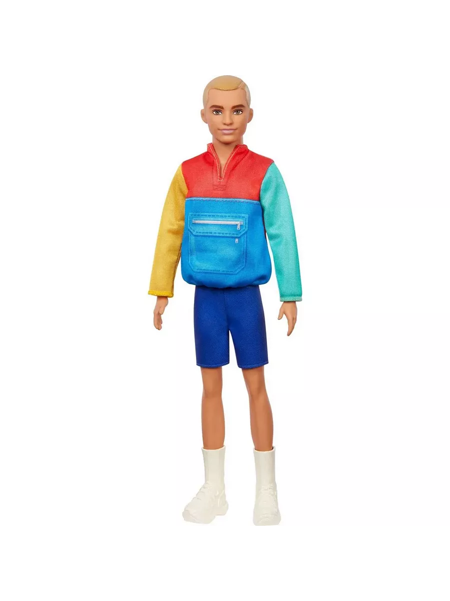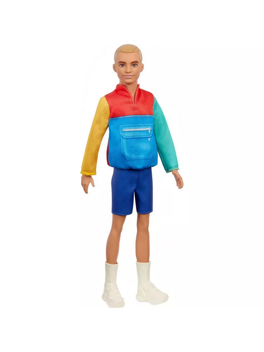 Кен одет в яркую ветровку и синие шорты, а дополняют повседневный образ со спортивными нотками модные белые кроссовки
