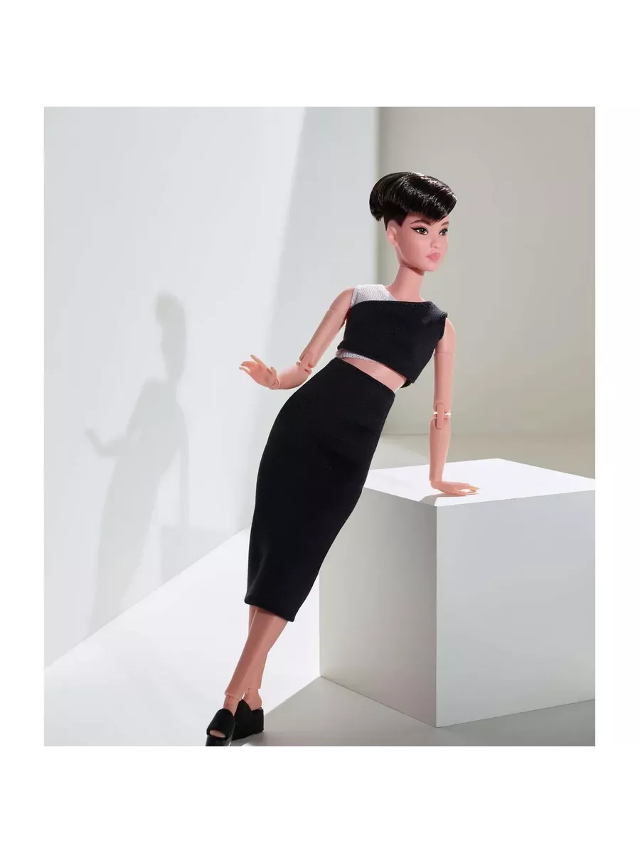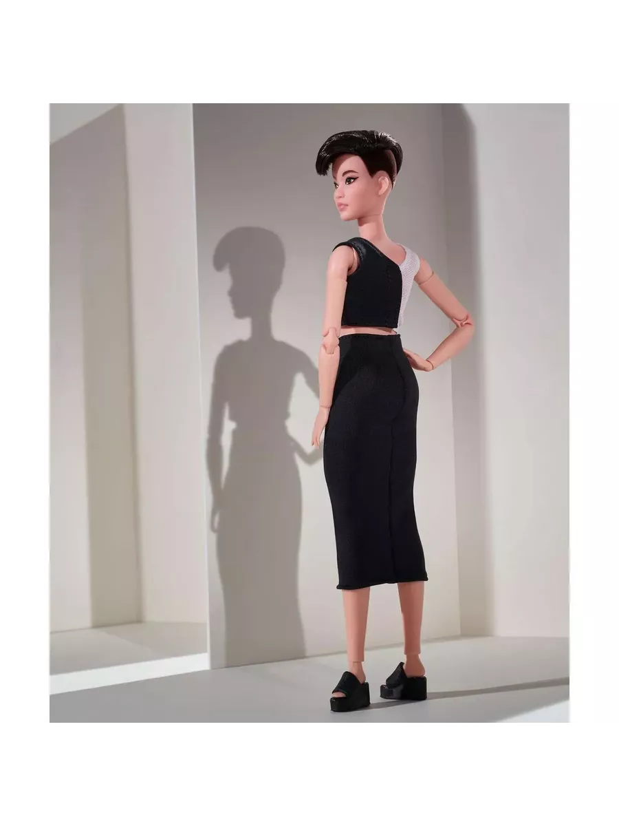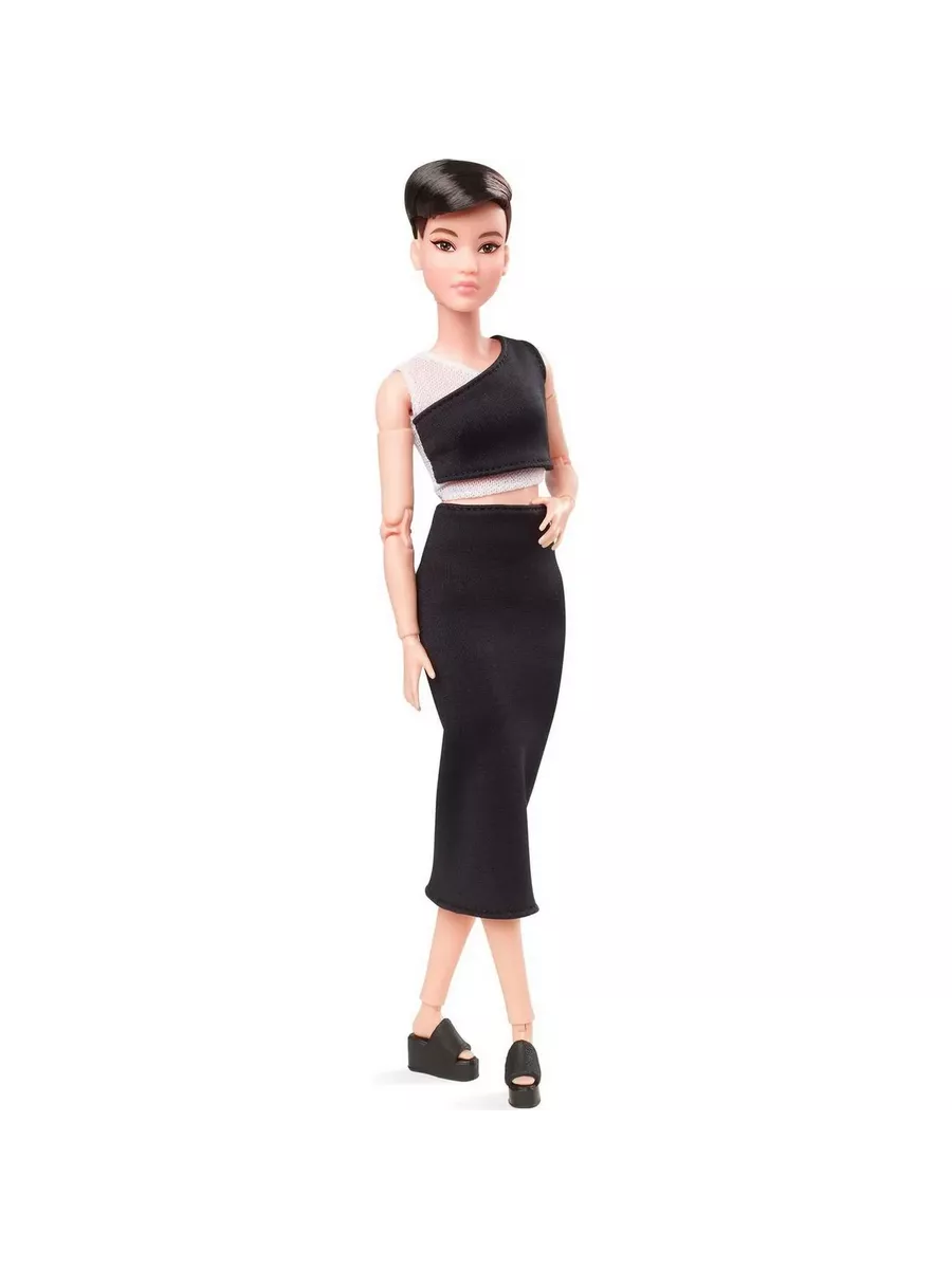 Кукла представлена в черно-белом укороченном топе, черной юбке-миди с завышенной талией и черных шлепанцах на платформе