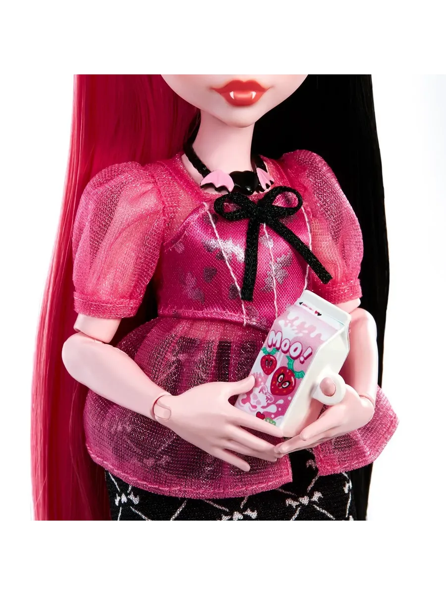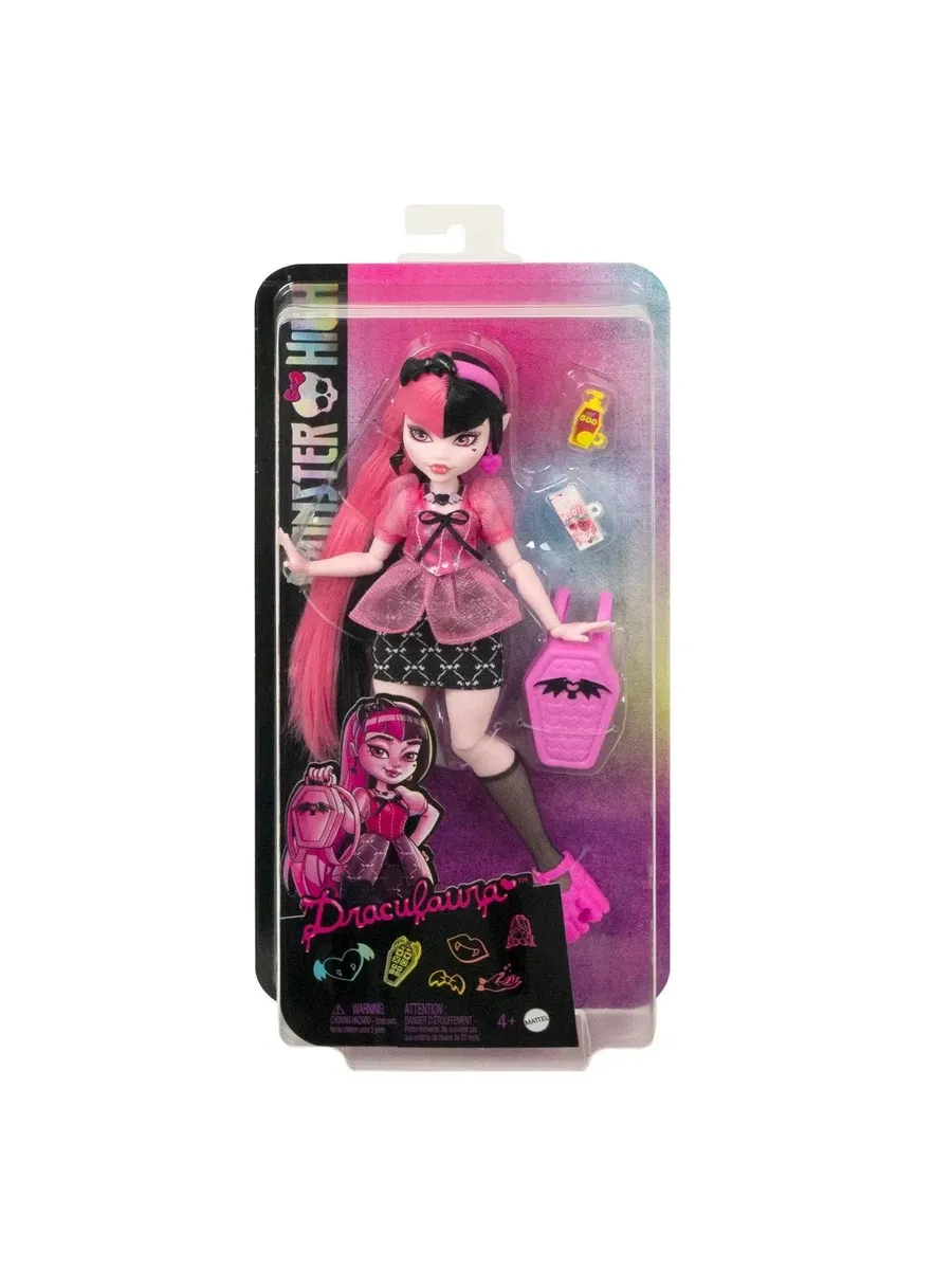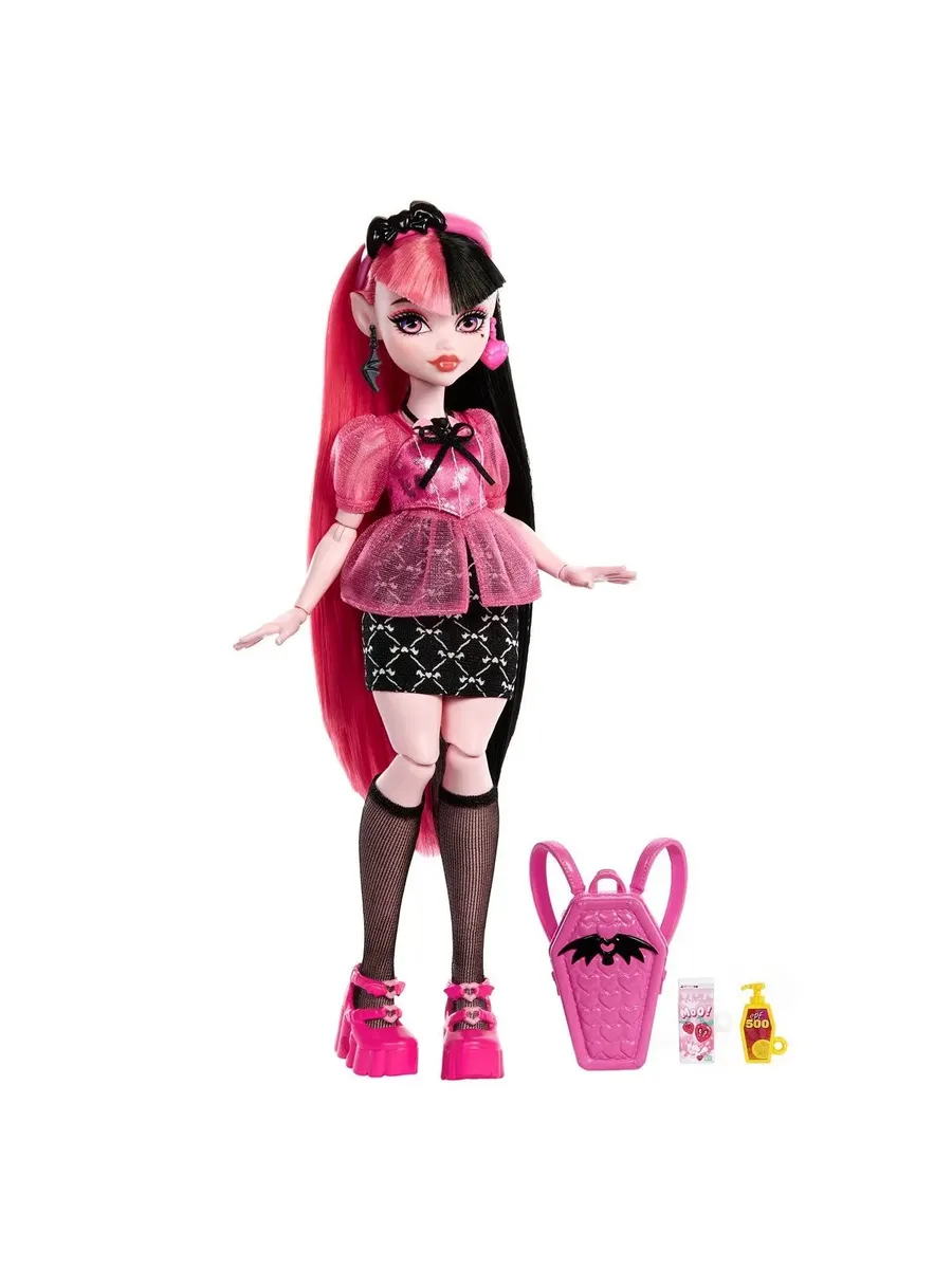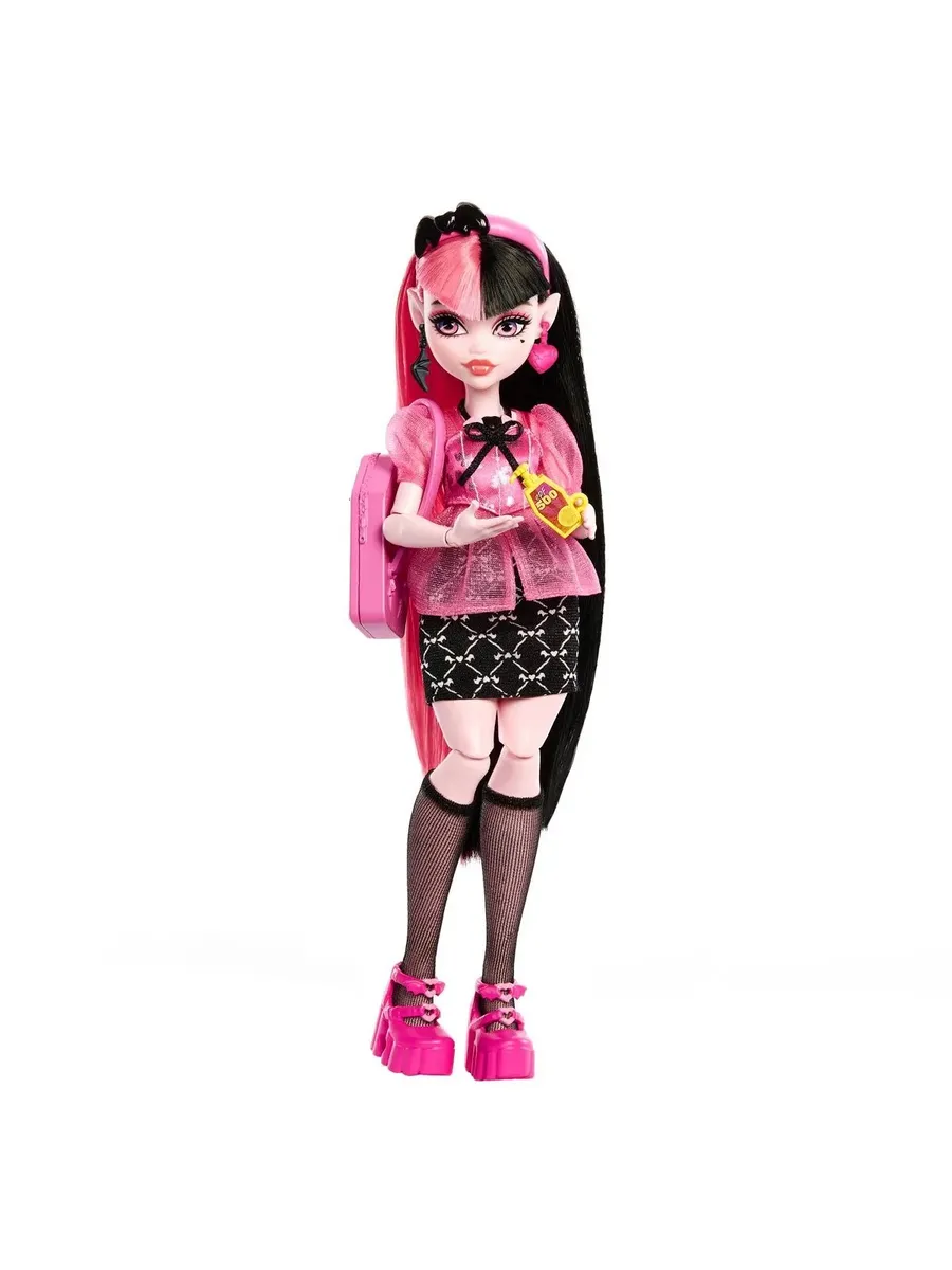 Дракулаура учится в Школе Монстров. Ее образ жутко-привлекательной вампирши дополняют эффектный рюкзак в виде гроба и аксессуары. Розовая прозрачная блузка с пышными короткими рукавами и облегающая мини-юбка придают ее фигуре невероятно стильный вид. Массивные туфли на высоких каблуках завершают образ. Рюкзак в виде гроба прекрасно сочетается с розовым ободком на голове Дракулауры. На ободке сидит маленькая летучая мышь с сердцем из черного материала.
