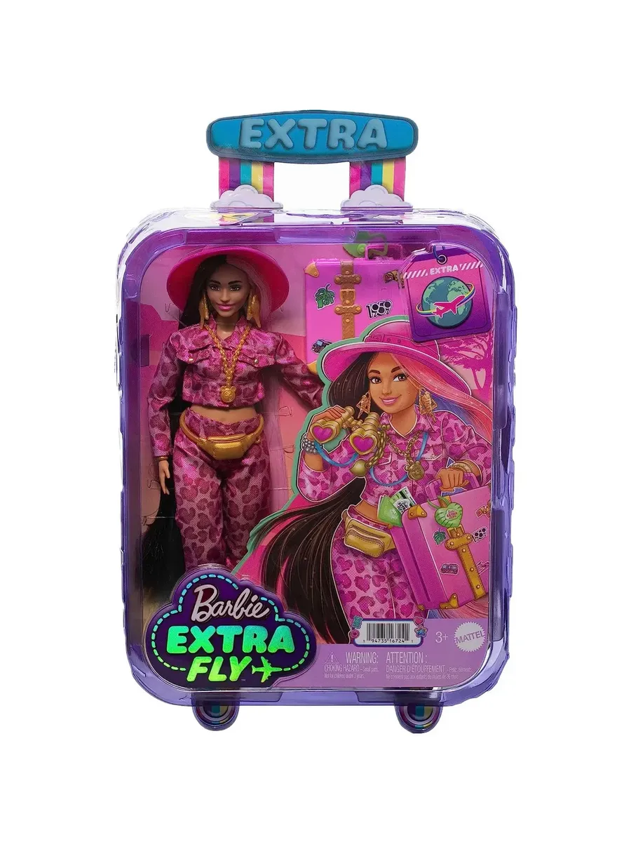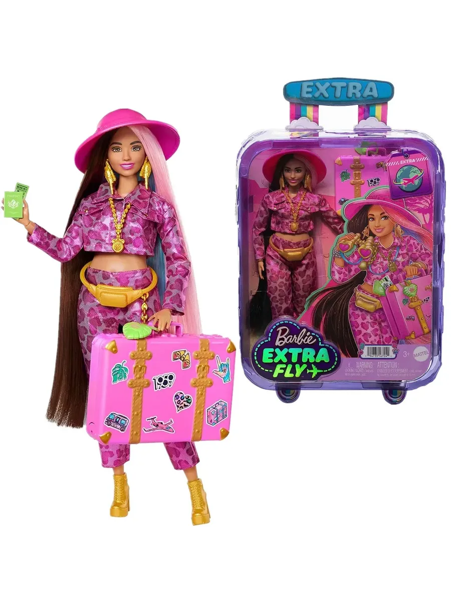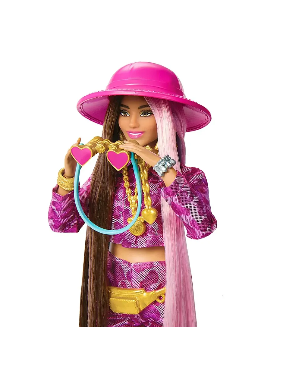 Кукла Barbie Extra Fly путешествует стильно, подбирая свои фантастические наряды к месту назначения. Она демонстрирует свой уверенный стиль в полностью розовом ансамбле с блестящим принтом и золотых сапогах. Эта подвижная кукла идеально подходит для динамичной игры. Кукла Барби поставляется с 15 аксессуарами, включая розовую шляпу сафари, серебряную поясную сумку и бинокль в форме сердца.