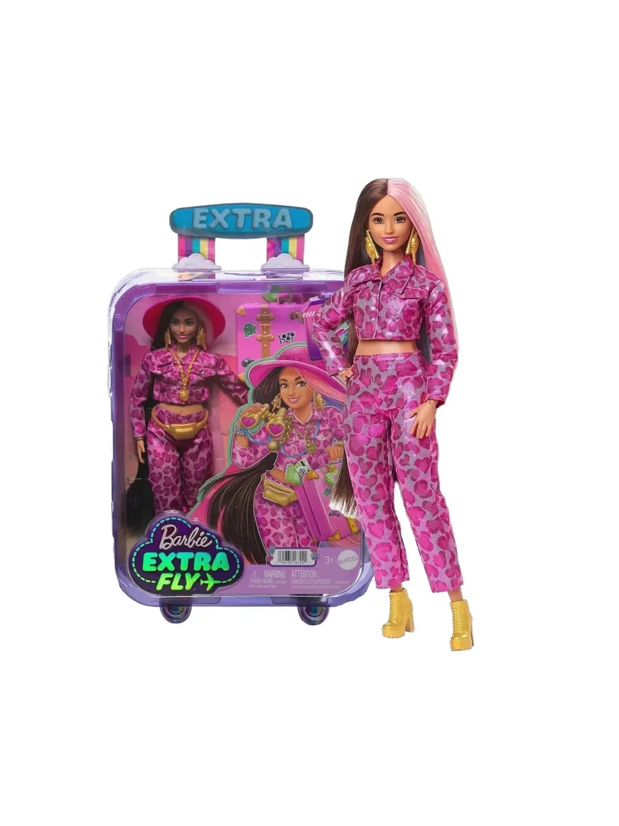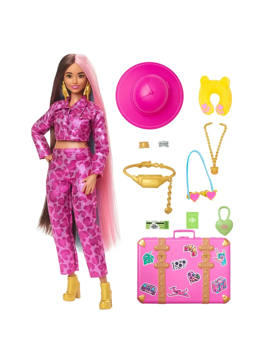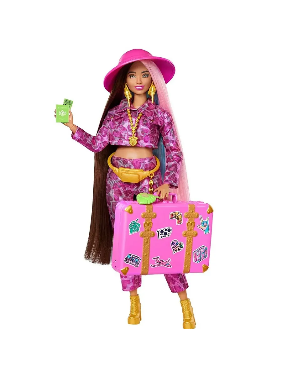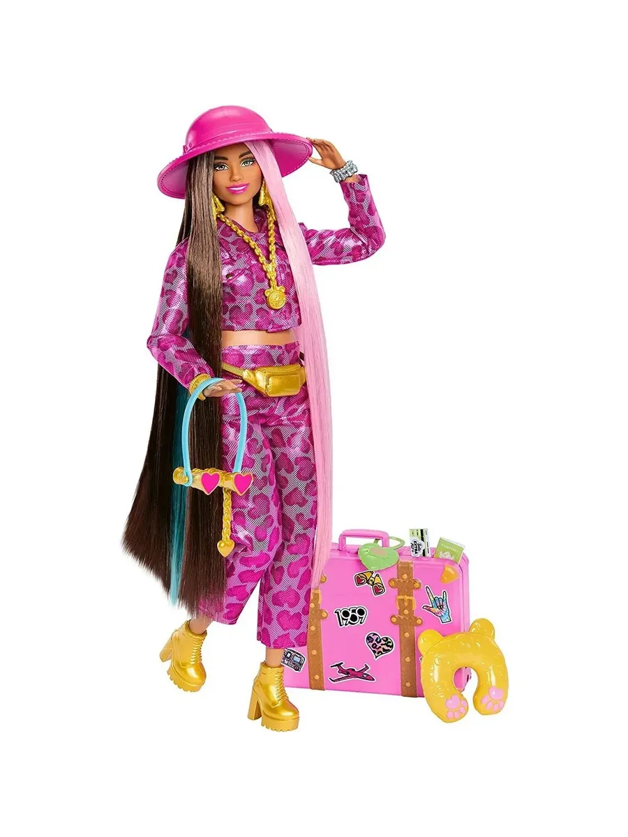 Кукла Barbie Extra Fly путешествует стильно, подбирая свои фантастические наряды к месту назначения. Она демонстрирует свой уверенный стиль в полностью розовом ансамбле с блестящим принтом и золотых сапогах. Эта подвижная кукла идеально подходит для динамичной игры. Кукла Барби поставляется с 15 аксессуарами, включая розовую шляпу сафари, серебряную поясную сумку и бинокль в форме сердца.