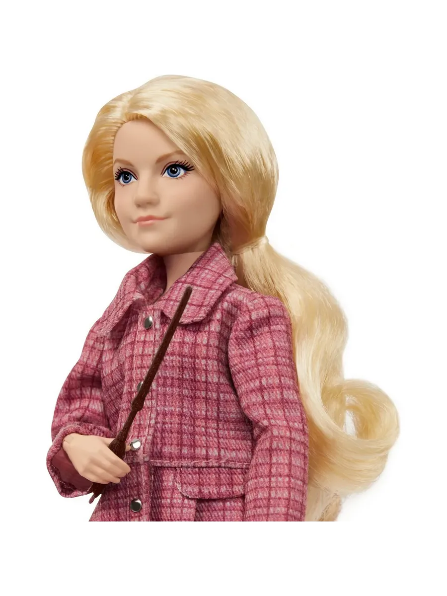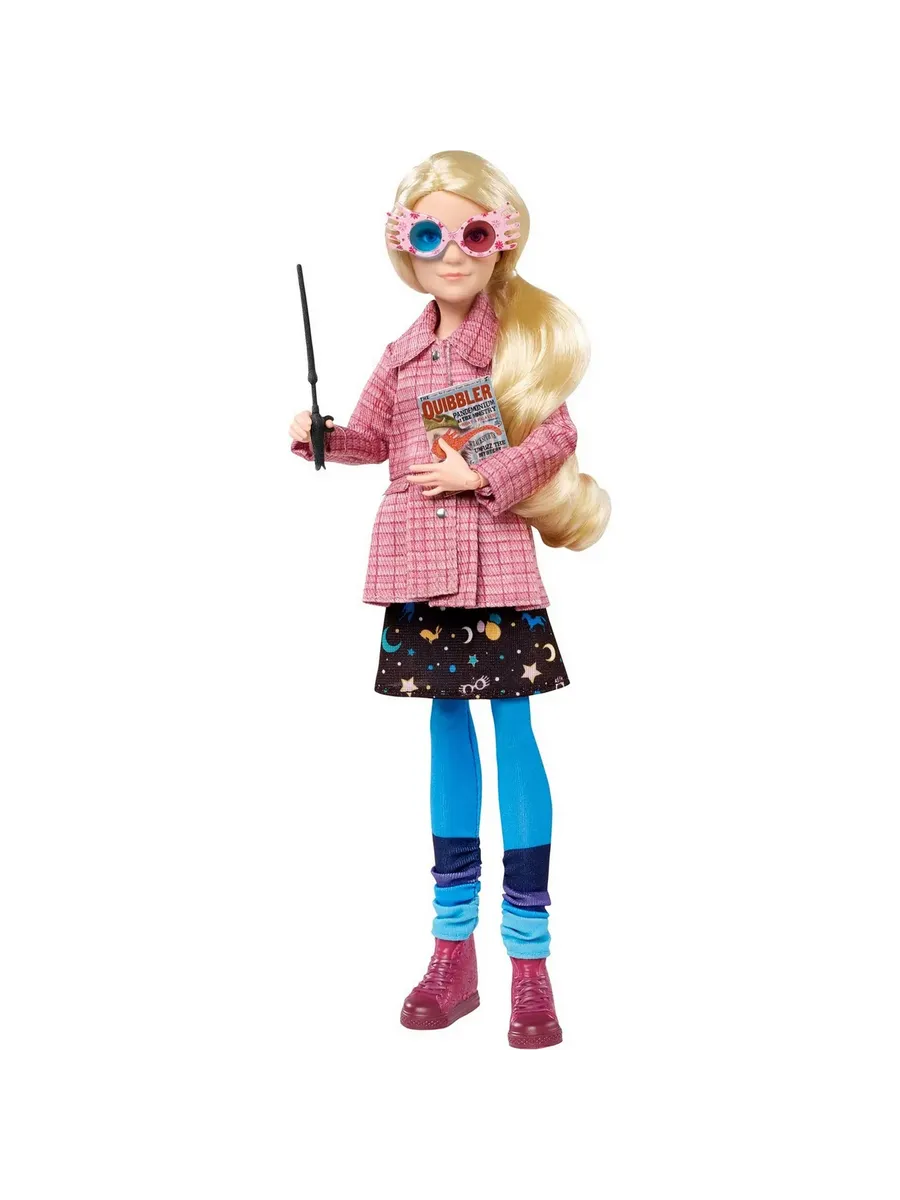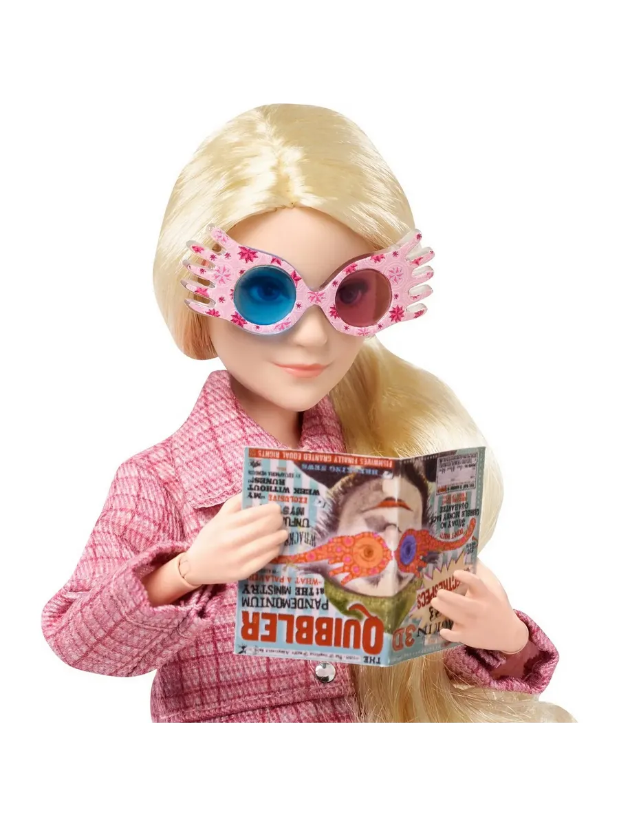Кукла “Полумна Лавгуд” выглядит так же, как ее персонаж из серии фильмов о Гарри Поттере и одета в розовое твидовое пальто, необычную юбку, колготки и кроссовки
