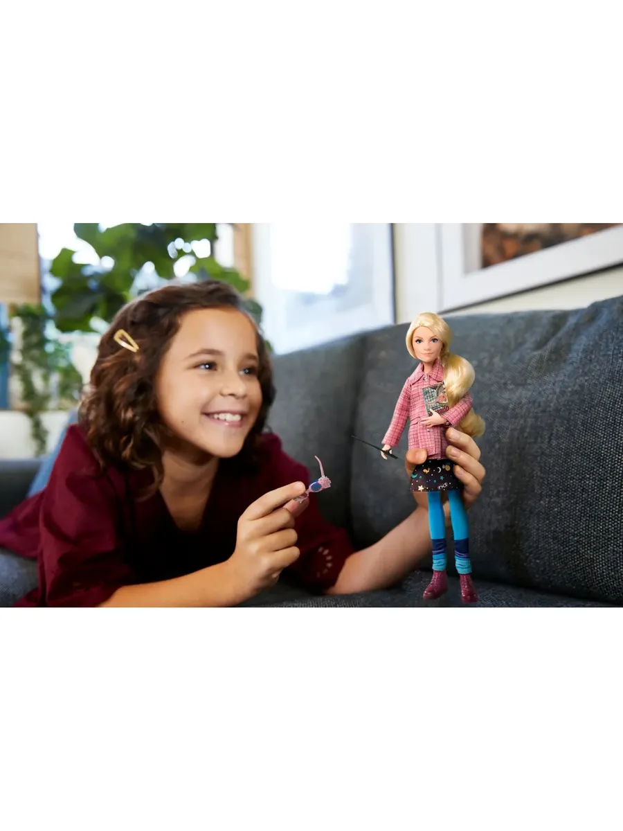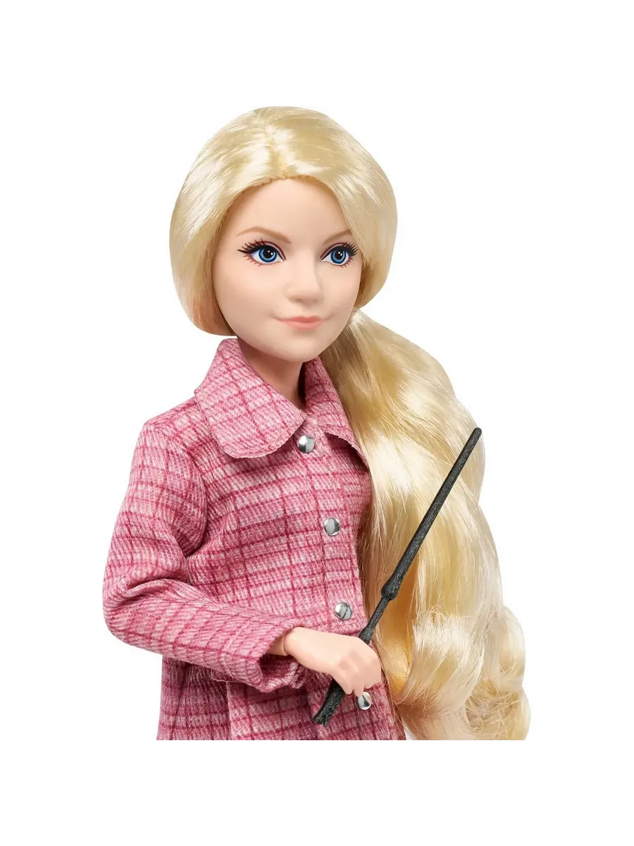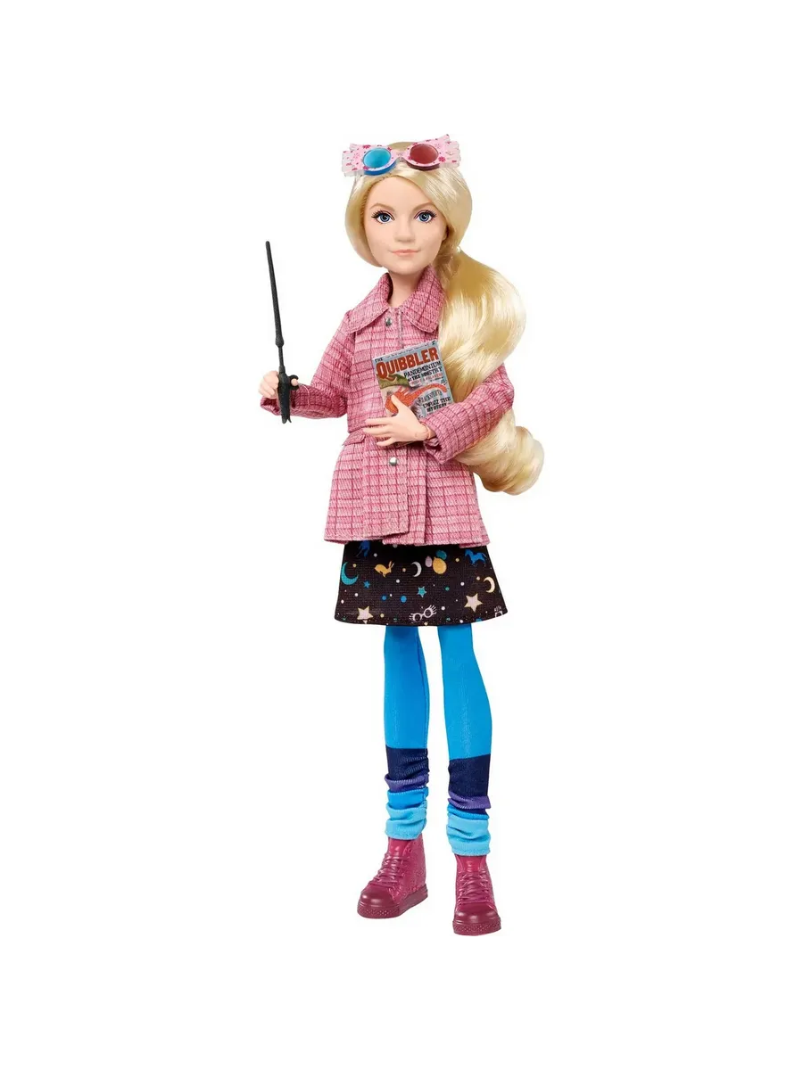 Кукла “Полумна Лавгуд” выглядит так же, как ее персонаж из серии фильмов о Гарри Поттере и одета в розовое твидовое пальто, необычную юбку, колготки и кроссовки