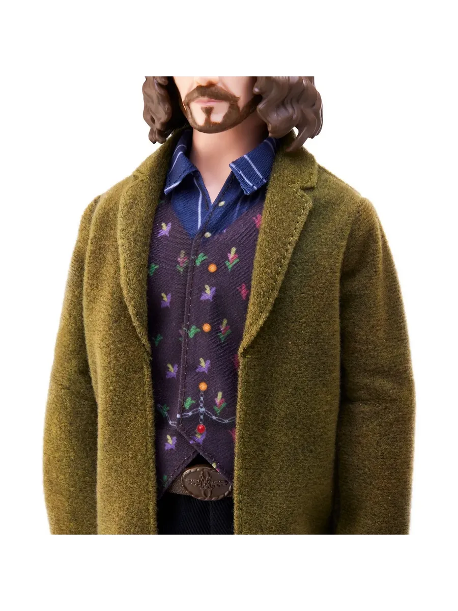 Коллекционная кукла создана по образу Сириуса Блэка и одета в костюм персонажа: полосатую рубашку, жилет с принтом, оливковый пиджак и черные брюки
