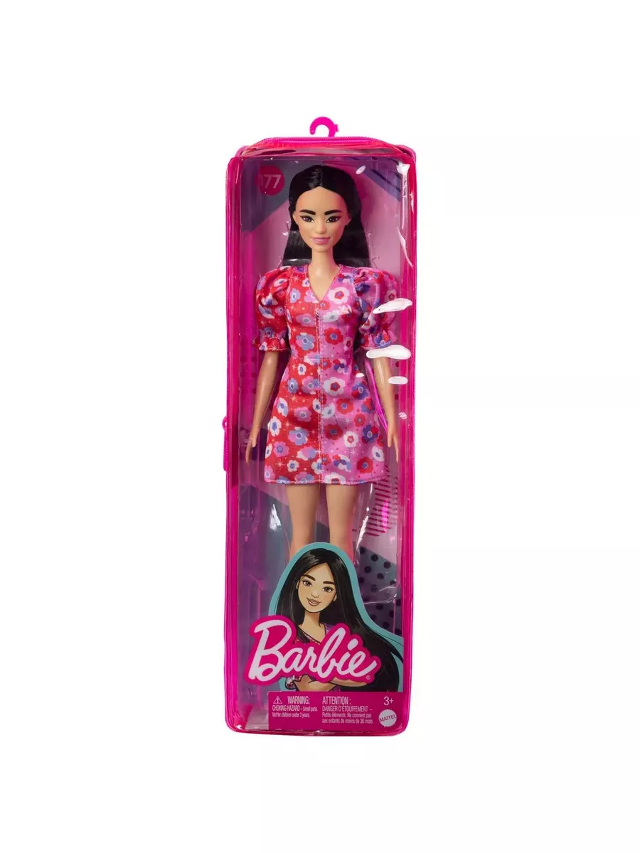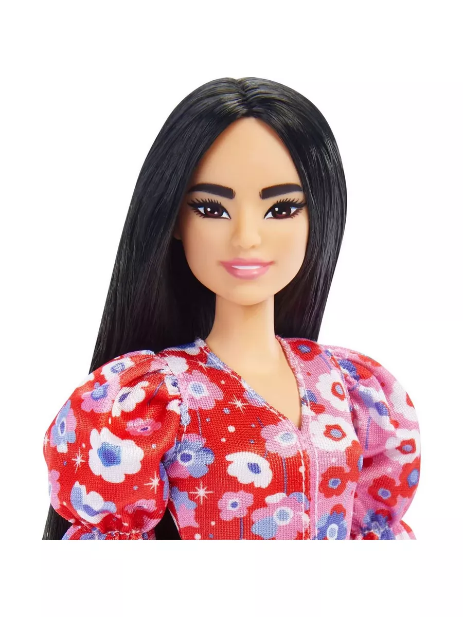 Барби имеет стандартный тип фигуры, длинные черные волосы и одета в розовое платье с цветочным принтом и пышными рукавами