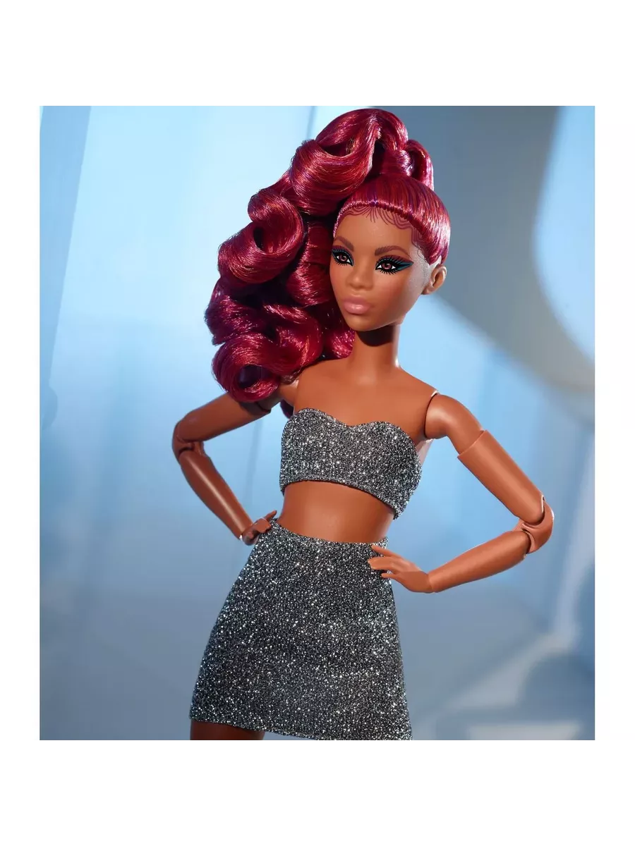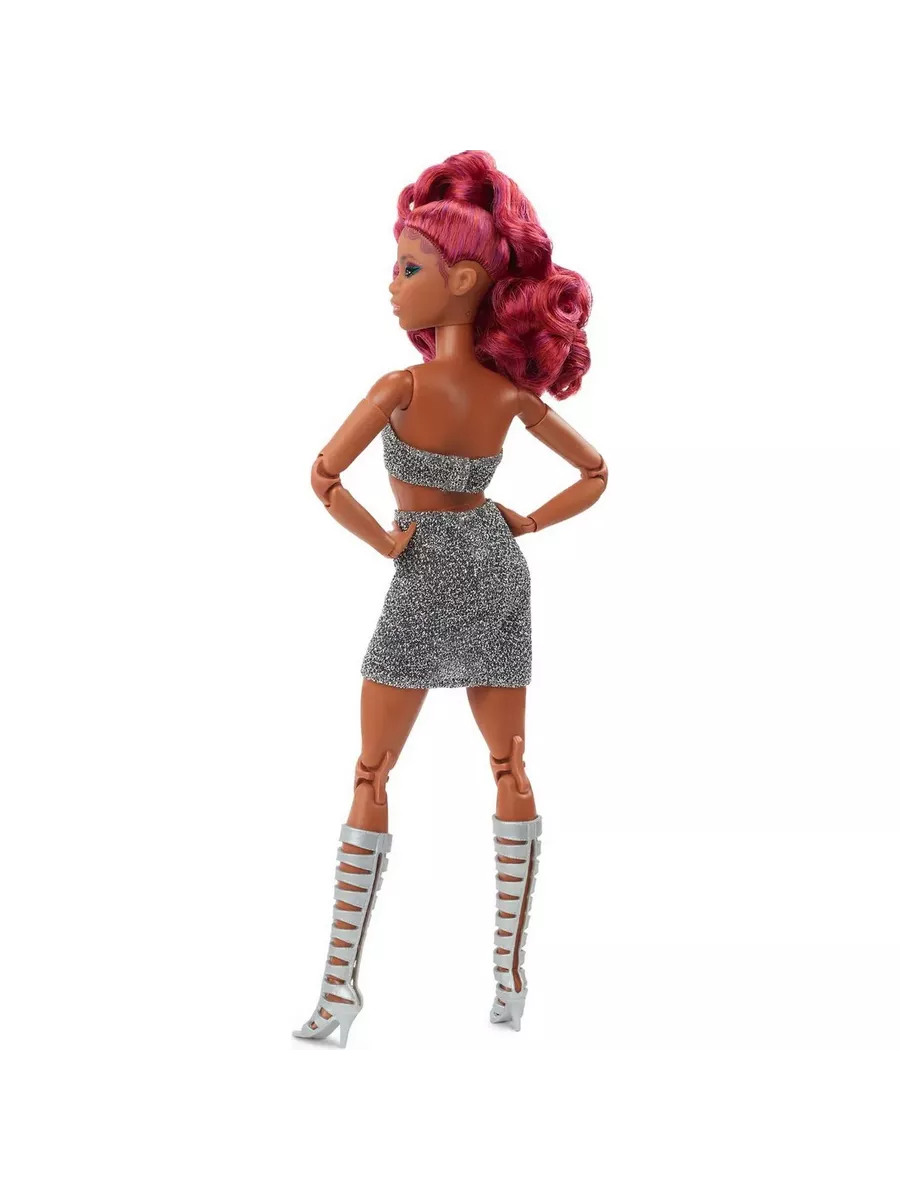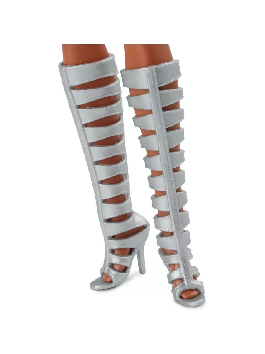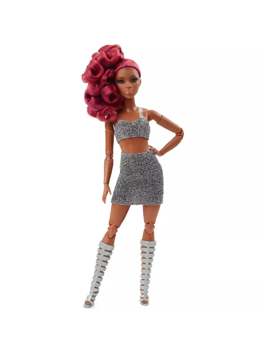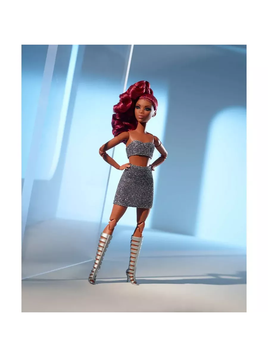Барби выглядит невероятно стильно благодаря блестящему укороченному топу, мини-юбке и сапогам до колен с вырезами